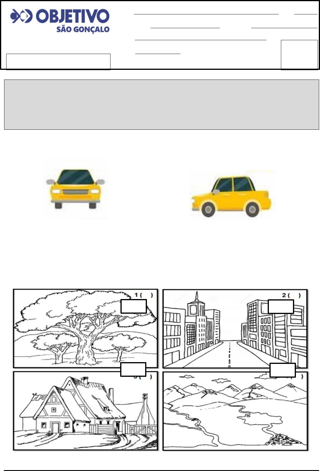 <p>ALUNO:</p><p>SÉRIE:</p><p>____ ANO</p><p>PROVA:</p><p>P____</p><p>Nenhum de nós é tão bom quanto todos nós juntos!</p><p>Aluno:</p><p>Nº:</p><p>Professor(a):</p><p>Ellen</p><p>Disciplina:</p><p>Geografia</p><p>E-mail:</p><p>ecf.objetivosg@gmail.com</p><p>Turma:</p><p>2º ano</p><p>Data:</p><p>____ / ____ / 2022</p><p>Nota/Rubrica</p><p>Valor:</p><p>Ciente do responsável:</p><p>2ª CHAMADA – 1º BIMESTRE</p><p>· Preencha todo o cabeçalho com seu nome completo e data.</p><p>· Sobre a mesa, deverá estar apenas o material necessário para a prova.</p><p>· Ao entregar a prova ao (à) professor(a), confira se toda a avaliação foi feita.</p><p>· Todos os cálculos deverão ser apresentados na prova, incluindo os cálculos das questões objetivas.</p><p>ALUNO:</p><p>SÉRIE:</p><p>____ ANO</p><p>PROVA:</p><p>P____</p><p>Nenhum de nós é tão bom quanto todos nós juntos!</p><p>1</p><p>Nenhum de nós é tão bom quanto todos nós juntos!</p><p>2</p><p>Questão 01 - Todos os elementos que estão ao nosso redor podem ser vistos de várias posições. De acordo com a imagem, de qual ponto de vista você está observando esses objetos? (1,0 - 0,5 x2)</p><p>____________________________ __________________________________</p><p>Questão 02 - Nós já aprendemos que paisagem é tudo aquilo que observamos ao nosso redor. Observe as paisagens e classifique-as em: (1,0- 0,25 x4)</p><p>(1) Paisagem Natural (2) Paisagem construída</p><p>(2)</p><p>Questão 03 - De acordo com as imagens acima, qual a diferença entre uma paisagem natural e uma paisagem construída? (1,0)</p><p>________________________________________________________________________________________________________________________________________________________________</p><p>Questão 04: Leia o texto e responda: (1,0)</p><p>Os diferentes lugares do nosso dia a dia.</p><p>Desde o momento em que nascemos, passamos a frequentar diferentes lugares, […]. Em cada um desses lugares aprendemos coisas novas. É desse modo que agregamos novas experiências e aprendemos coisas novas.</p><p>EU GOSTO MAIS – GEOGRAFIA ENSINO FUNDAMENTAL 1</p><p>a) Cite dois exemplos de espaços de convivência que utilizamos para o lazer.</p><p>_________________________________________________________________________________________</p><p>Questão 05 – Leia um trecho da música “Paisagem da janela” dos compositores Borge e Fernando Brant. (1.2- 2x0.6)</p><p>“Da janela lateral do quarto de dormir</p><p>Vejo uma igreja, um sinal de glória</p><p>Vejo um muro branco e um vôo pássaro…”</p><p>a) Registre no espaço o que você vê da janela do seu quarto.</p><p>________________________________________________________________________________________________________________________________________________________________</p><p>b) O elemento registrado acima, observando da sua janela, é visto de que posição:</p><p>________________________________________________________________________________</p><p>Questão 06 - O que é ponto de referência? Pinte a resposta correta. (1.0)</p><p>É um indicador que nos orienta para chegarmos a um determinado lugar.</p><p>É o espaço que nos rodeia.</p><p>Questão 07 - O que é paisagem? (1.0)</p><p>Tudo aquilo que nós vemos e a nossa visão alcança.</p><p>É tudo que nos orienta para chegarmos a um lugar.</p><p>( ) ( )</p><p>Questão 08 - Pedro Lucas quer ensinar a seu amigo Heitor o trajeto que faz até chegar a sua escola, para isso desenhou um mapa com os pontos de referência. Observe a imagem e responda. (1,0- 0,25x4)</p><p>CASA DE PEDRO LUCAS</p><p>a) O que encontramos ao lado da casa de Pedro Lucas?</p><p>________________________________________________________________________________</p><p>b) Qual ponto de referência que fica localizado atrás do mercado?</p><p>________________________________________________________________________________</p><p>c) Quais espaços de convivência utilizado para o lazer há na imagem?</p><p>________________________________________________________________________________</p><p>d) Qual ponto de referência mais próximo da escola Pedro Lucas poderia citar?</p><p>________________________________________________________________________________</p><p>Questão 09: Para aprender a se localizar, podemos começar por um espaço pequeno.</p><p>Observe o esquema a seguir e preencha as lacunas, seguindo a direção correta: (0.8 – 4x0.2)</p><p>.</p><p>Questão 10: Desenhe uma paisagem modificada e relate, através da escrita, quais foram as modificações que você desenhou. (1,0)</p><p>___________________________________________________________________________________________________________________________________________________________________________________________________________________________________________________________________________</p><p>Nenhum de nós é tão bom quanto todos nós juntos!</p><p>1</p><p>Nenhum de nós é tão bom quanto todos nós juntos!</p><p>4</p><p>image2.jpeg</p><p>image3.png</p><p>image4.jpeg</p><p>image5.jpeg</p><p>image6.png</p><p>image1.png</p>