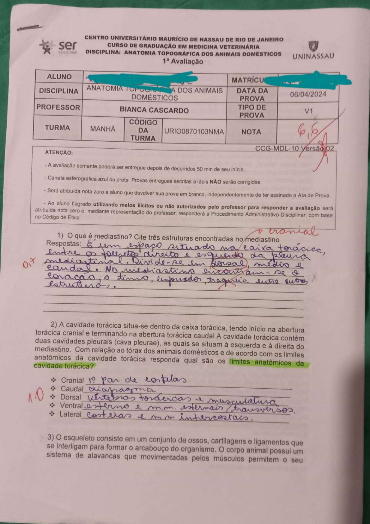 <p>CENTRO UNIVERSITÁRIO MAURÍCIO DE NASSAU DE RIO DE JANEIRO ser CURSO DE GRADUAÇÃO EM MEDICINA VETERINÁRIA DISCIPLINA: ANATOMIA TOPOGRÁFICA DOS ANIMAIS DOMÉSTICOS UNINASSAU Avaliação ALUNO DISCIPLINA ANATOMIA DOS ANIMAIS DATA DA 06/04/2024 DOMÉSTICOS PROVA PROFESSOR TIPO DE BIANCA CASCARDO V1 PROVA TURMA DA URIO0870103NMA NOTA 6,6 TURMA CCG-MDL-10 ATENÇÃO: - A avaliação somente poderá ser entregue depois de decorridos 50 min de seu Caneta esferográfica azul ou preta. Provas entregues escritas a lápis NÃO serão Será nota zero a aluno que devolver sua prova em branco, independentemente de ter assinado a Ata de Ao aluno flagrado utilizando meios ilícitos ou não autorizados pelo professor para responder a avaliação será atribuida nota zero e, mediante representação do responderá a Procedimento Administrativo Disciplinar, com base no Código de 1) que é mediastino? Cite três estruturas encontradas no mediastino entre direito e da pleura Respostas: um situado lm medio e entre 2) A cavidade torácica situa-se dentro da caixa torácica, tendo início na abertura torácica cranial e terminando na abertura torácica caudal A cavidade torácica contém duas cavidades pleurais (cava pleurae), as quais se situam à esquerda e à direita do mediastino. Com relação ao tórax dos animais domésticos e de acordo com os limites anatômicos da cavidade torácica responda qual são os limites anatômicos da cavidade torácica? Cranial 10 de Caudal diapagma Dorsal musculatura Ventral esterno e Lateral e m m 3) o esqueleto consiste em um conjunto de ossos, cartilagens e ligamentos que se interligam para formar o arcabouço do organismo. corpo animal possui um sistema de alavancas que movimentadas pelos músculos permitem o seu</p><p>CENTRO MAURÍCIO DE NASSAU DE RIO DE JANEIRO ser CURSO DE GRADUAÇÃO EM MEDICINA VETERINÁRIA ANATOMIA TOPOGRÁFICA DOS ANIMAIS DOMESTICOS UNINASSAU Avaliação no todo ou em parte. Rádio e ulna são 05505 que esqueleto apendicular e fazem parte: a) do membro b) da coluna torácica c) da coluna F Xd) do membro e) do F 4) órgão encontrado na cavidade nasal, está relacionado ao olfato. Consiste em dois ductos estreitos, que estão alojados no palato um de cada lado em sua junção com o septo Os ductos, sustentados revestidos por mucosa Eles terminam em fundo cego na parte parcialmente caudal, nas faces lateral, ventral e medial por cartilagens delgadas, são oral mas abrem-se rostralmente nos ductos incisivos que ligam as cavidades nasal por meio de aberturas no palato duro, na maioria dos Esse órgão e está envolvido com a atividade sexual nos machos, por ser responsável pela captação do odor da secreção vaginal ou da urina de no estro. o reflexo de Flehmen, associada com a percepção de feromônios, é exibida tanto por como por gatos, mas é menos claramente demonstrada do que em animais como os equinos. Em equinos, reflexo de Flehmen caracteriza-se por decorrente da contração muscular do A) Torção do lábio músculo levantador nasolabial B) Torção do lábio músculo levantador nasolabial C) Depressão lábio músculo levantador do lábio superior D) Torção do lábio músculo levantador do lábio superior E) Depressão do lábio músculo depressor do lábio superior F 5) A dentição dos mamiferos possui certas que, em ou mesmo individualmente, são diagnósticas da classe. complemento dos dentes limita-se a um razoavelmente pequeno raramente excedendo 44 na dentição permanente, a qual é determinada para cada embora variações pequenas Ao contrário da maioria dos outros vertebrados, os dentes se desenvolvem diferentemente nas diversas regiões da boca, para melhor desempenho em funções especiais. Essa conhecida como heterodontia, permite o reconhecimento dos grupos incisivos, caninos, pré- molares e molares. Uma única substituição dos dentes da primeira erupção é proporcionada por um segundo conjunto, mais forte, mais bem adaptado a maxila e mandibula maiores e à mastigação mais vigorosa do animal adulto. Distintos grupos de dentes são desenvolvidos, involuidos ou até ausentes em função das necessidades digestivas de cada espécie. As fêmeas equinas apresentam normalmente falta de um grupo dentário enquanto os ovinos, caprinos e bovinos de outro grupo dentário. Assinale abaixo os diferentes grupos dentários ausentes nas equinas e nos animais respectivamente: a) os molares superiores; os incisivos inferiores b) os incisivos superiores; os pré-molares superiores c) os pré-molares; os caninos</p><p>CENTRO DE NASSAU DE DE JANEIRO ser CURSO DE GRADUAÇÃO EM MEDICINA DISCIPLINA ANATOMIA DOS ANIMAIS DOMESTICOS UNINASSAU Avaliação d) os incisivos caninos os os incisivos 6) Analise a figura abaixo e assinale a alternativa que correlaciona corretamente a imagem de cada par de pulmões com sua árvore à animal a qual Figura 1. Representação vista dorsal dos pulmões e das árvores de animais Fonte: H. Anatomia dos animais domésticos. 4° Ed. Porto Alegre: Artmed, IV a) canino; - III bovino: IV equino. b) - III - equino; IV - suino. - - canino: III IV - bovino. d) - bovino; III - IV equino e) I - equino: - III - IV bovino. 7) o cão possui 7 vértebras cervicais, 13 7 3 sacrais e cerca de 20 caudais. A variação mais comum a redução para seis vértebras lombares. A vertebral pré-caudal é a mesma em gatos, que apresentam ossos em geral mais delgados e que diferem dos ossos caninos de forma que é fácil de reconhecer, porém dificil de definir. Os discos intervertebrais de e gatos são relativamente mais espessos do que da maioria das espécies e respectivamente, com 15% e 17-20% do comprimento total da coluna. o crescimento longitudinal da coluna até os 12 meses de idade, quando as epifises se fundem com os corpos das São das vértebras torácicas: a) Corpos curtos; Facetas costais e Processo espinhoso proeminente Expansão horizontal; Ausência de facetas costais e Processo transverso achatado e 