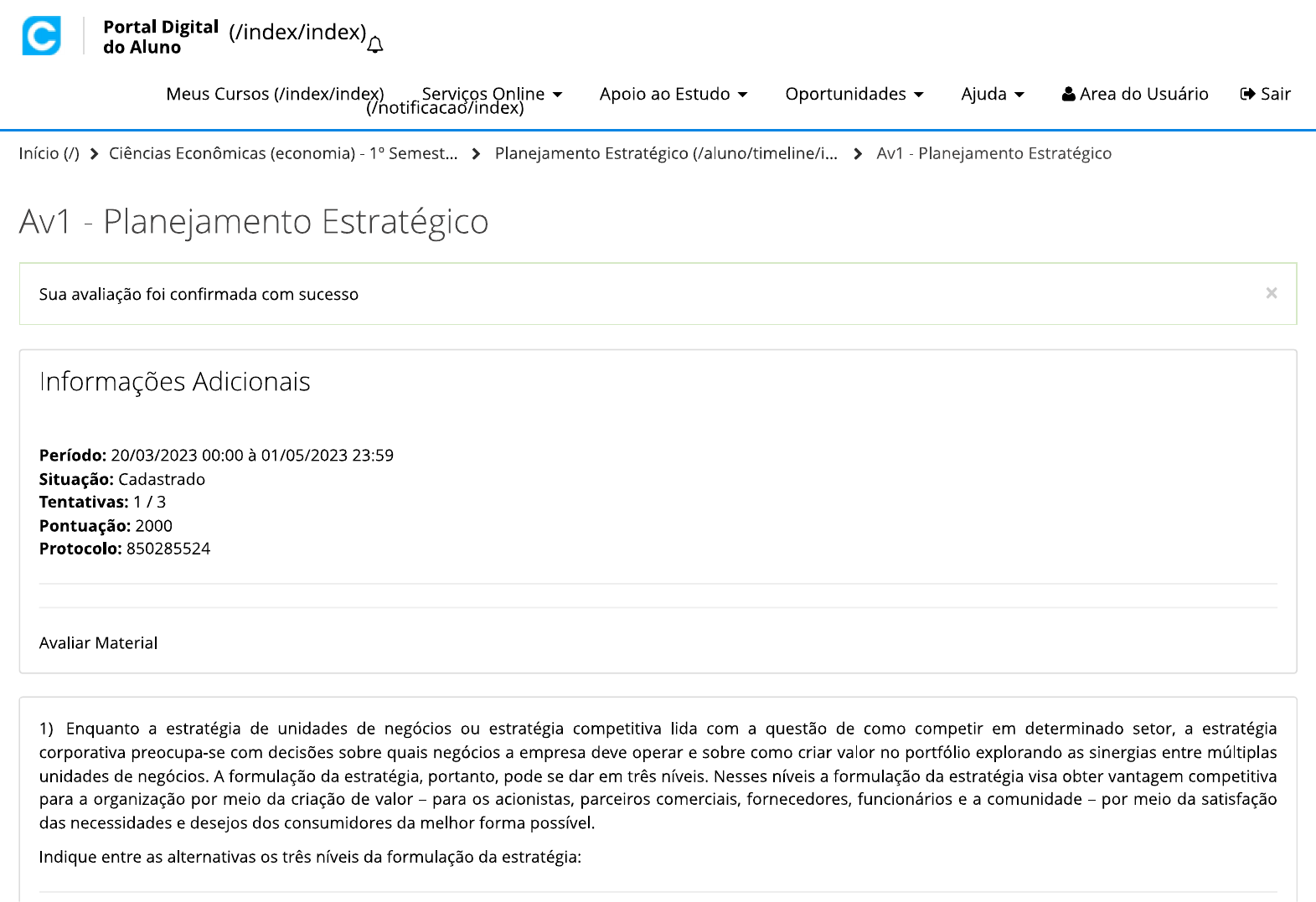 <p>Portal Digital (/index/index) do Aluno Meus Cursos (/index/index) Online Apoio ao Estudo Oportunidades Ajuda Area do Usuário Sair Início (/) > Ciências Econômicas (economia) 1° Semest... > Planejamento Estratégico (/aluno/timeline/i > Av1 - Planejamento Estratégico Av1 - Planejamento Estratégico Sua avaliação foi confirmada com sucesso Informações Adicionais Período: 20/03/2023 00:00 à 01/05/2023 23:59 Situação: Cadastrado Tentativas: 1/3 Pontuação: 2000 Protocolo: 850285524 Avaliar Material 1) Enquanto a estratégia de unidades de negócios ou estratégia competitiva lida com a questão de como competir em determinado setor, a estratégia corporativa preocupa-se com decisões sobre quais negócios a empresa deve operar e sobre como criar valor no portfólio explorando as sinergias entre múltiplas unidades de negócios. A formulação da estratégia, portanto, pode se dar em três níveis. Nesses níveis a formulação da estratégia visa obter vantagem competitiva para a organização por meio da criação de valor para os acionistas, parceiros comerciais, fornecedores, funcionários e a comunidade - por meio da satisfação das necessidades e desejos dos consumidores da melhor forma possível. Indique entre as alternativas os três níveis da formulação da estratégia:</p><p>Alternativas: a) Estratégico, diferenciado e sustentado. b) Interno, externo e misto. c) Estratégico, operacional e externo. d) Logístico, operações e relacionamentos. e) Corporativo, de unidade de negócios e funcional. Alternativa assinalada 2) A é criada no mercado. Essa vantagem tem tudo a ver com os clientes, com o valor relativo que eles atribuem aos seus produtos e serviços e com as decisões de compra que finalmente tomam. A vantagem competitiva tem a ver com a da empresa que os gurus chamam de que é a capacidade especial da empresa de criar vantagem competitiva para si no mercado. Em quase todos os casos, este dom é especifico de cada empresa. As palavras que completam, corretamente, as lacunas no texto base são: Alternativas: a) Participação no mercado, vantagem competitiva e relacionamentos. b) Vantagem competitiva, cadeia de valor e competência essencial. Alternativa assinalada c) Cadeia de valor, competência essencial e vantagem competitiva. d) Vantagem competitiva, área de atuação e vantagem competitiva e) Competência essencial, vantagem competitiva e participação no mercado. 3) Segundo a perspectiva estratégica da economia industrial, para que uma empresa possa criar maior valor que seus concorrentes, elas devem identificar uma posição dentro desse setor em que possam capturar maior valor econômico. Por sua vez, a perspectiva da estratégia baseada em recursos, ao invés de associar a vantagem competitiva de uma empresa ao ambiente externo, ela considera:</p><p>Alternativas: a) O seu posicionamento no mercado. b) A sua vantagem competitiva. c) As suas competências essenciais. Alternativa assinalada d) A curva de experiência. e) A curva de difusão tecnológica. 4) A DuPont é uma companhia multinacional de alta tecnologia que manufatura e comercializa produtos quimicamente relacionados. A sua proposição é fazer os melhores produtos usando a química e servir um diversificado grupo de mercado, nos quais a tecnologia de ponta proporciona a principal vantagem competitiva. O texto base faz referência a(s)/ao(s): Alternativas: a) Visão organizacional. b) Missão organizacional. Alternativa assinalada c) Valores organizacionais. d) Filosofia organizacional. e) Cultura organizacional. 5) É uma ferramenta que auxilia no diagnóstico dos ambientes externo e interno, ou seja, permite relacionar as oportunidades e ameaças presentes no ambiente interno da organização. De qual ferramenta de análise, o texto base faz referência? Alternativas:</p><p>a) Matriz de Atratividade. b) Matriz de Parentesco. c) Matriz SWOT. Alternativa assinalada d) Matriz BCG. e) Matriz Ansoff.</p>