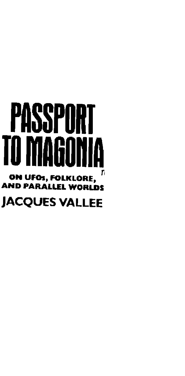 <p>PASSPORT TO MAGONIA n ON UFOs, FOLKLORE, AND PARALLEL WORLDS JACQUES VALLEE</p><p>"How will you go back?" said the woman. "Nay, that I do not know. Because I have heard, that for those who enter Fairy Land, there is no going back. They must go on, and go through it." R. Macdonald Robertson Selected Highland Tales "From Ghoulies and Ghoosties, long-leggety Beasties, and Things that go Bump in the Night, Good Lord, deliver us!" Old Litany</p><p>CHAPTER ONE VISIONS OF A PARALLEL WORLD So Man, who here seems principal alone, Perhaps acts second to some sphere unknown. Touches some wheel, or verges to some goal, 'Tis but a part we see, and not a whole. Alexander Pope, Essay on Man ON JUNE 15, 1952, in the jungles of Yucatan, an archaeological expedition led by Alberto Ruz and three companions made a remarkable discovery. The team was investigating the impressive Palenque monuments, located in the state of Chiapas, on the site of a well-known Mayan city that scientists were busy restoring and mapping in systematic fashion. Yucatan is a region of constant humidity and high temperature, and the tropical vegetation had caused considerable damage to the temples and pyramids erected by the Mayas, whose civilization was marked by the genius of its architects and is thought to have declined in the first centuries of our era, disappearing almost completely about the ninth century-that is, at the time of the Charlemagne Em- pire in Europe. One of the most impressive constructions on the Palenque site is the "Pyramid of Inscriptions," an enormous truncated pyramid with a long stairway in front. The pyramid is of a somewhat un- usual design, for on the top is a large temple. The purpose of the monument was unknown until Lhuillier and his companions sug- gested that it might have been built as a tomb for some exceptional king; or illustrious priest. Led by this idea, they began to search the temple at the top of the pyramid for some passage or stairway 1</p><p>2 PASSPORT TO MAGONIA leading directly into the monument. And on June 15, 1952, they discovered a long flight of stairs going down through the enormous mass and actually under ground level. The passage was built after the traditional Mayan fashion, the inclined walls giving the enclosure a high, conical shape ending with a narrow ceiling. Some Indian huts in Yucatan are still built this way, a most efficient design in the tropical climate since it allows hot air to rise, thereby providing a relatively comfortable temperature inside the hut. At the bottom of the temple passage stairway was a splendid crypt, and in the crypt was a sarcophagus covered with a single carved stone measuring twelve feet by seven. Ten inches thick, the slab weighed about six tons. The fantastic scene depicted by the artists had not suffered; it came to light in every detail; and archaeologists are completely at a loss to interpret its meaning. The Mayans are supposed to have vanished without having invented even the rudiments of a technology. Some archaeologists doubt that they knew the wheel, and yet the design on the Palen- que sarcophagus appears to show a very complex and sophisticated device, with a man at the controls of an intricate piece of ma- chinery. Noting that the man is depicted with his knees brought up toward his chest and his back to a complicated mechanism, from which flames are seen to flow, several people, among them Soviet science writer Alexander Kazantsev, have speculated that the Mayans had actually been in contact with visitors from a superior civilization-visitors who used spaceships. Kazantsev's interpretation is difficult to prove. However, the only object we know today closely resembling the Mayan design is the space capsule. The demigod for whom sarcophagus, crypt, and pyramid were built with such splendid craftsmanship by the Mayan artists is something of a puzzle, too. The body is radically different from the morphology of the Mayans, as we imagine them: the corpse is that of a man nearly six feet tall, about eight inches taller than the average Mayan. According to Pierre the sarcophagus was made for the "Great White God," Kulkulkan, but no final clue to the mystery has yet been found, and the tropical jungles of Central America where dozens of temples and pyramids are</p><p>VISIONS OF A PARALLEL WORLD 3 still buried under the exuberant vegetation have not yet yielded the secret of the Palenque sarcophagus. THE AGE OF THE GODS It is in the literature of religion that flying objects from celestial countries are most commonly encountered, along with descrip- tions of the organization, nature, and philosophy of their occu- pants. Indeed, several writers have consistently pointed out that the fundamental texts of every religion refer to the contact of the human community with a "superior race" of beings from the sky. This terminology is used, in particular, in the Bible, where it is said: They come from a far country, from the end of heaven, even the 2 Lord, and the weapons of his indignation, to destroy the whole land The visitors have the power to fly through the air using lumi- nous craft, sometimes called "celestial chariots." With these manifestations are associated impressive physical and meteoro- logical displays, which the primitive authors call "whirlwind," "pillar of fire," etc. The occupants of these craft, to whom popular imagery will later ascribe wings and luminosity, are similar to man and communicate with him. They are organized under a strict military system: The chariots of God are twenty thousand, even thousands of 3 angels: the Lord is among them Gustave Dore, the French artist who has illustrated splendid editions of the Bible, has left a beautiful engraving showing these "celestial chariots" in the full power of their fantastic flight, speed- ing above the mountains, the clouds, and the abyss. A period of the early history of Japan ending about 3000 B.C. has received the name "Jomon Era." During that period an im- 4 porta