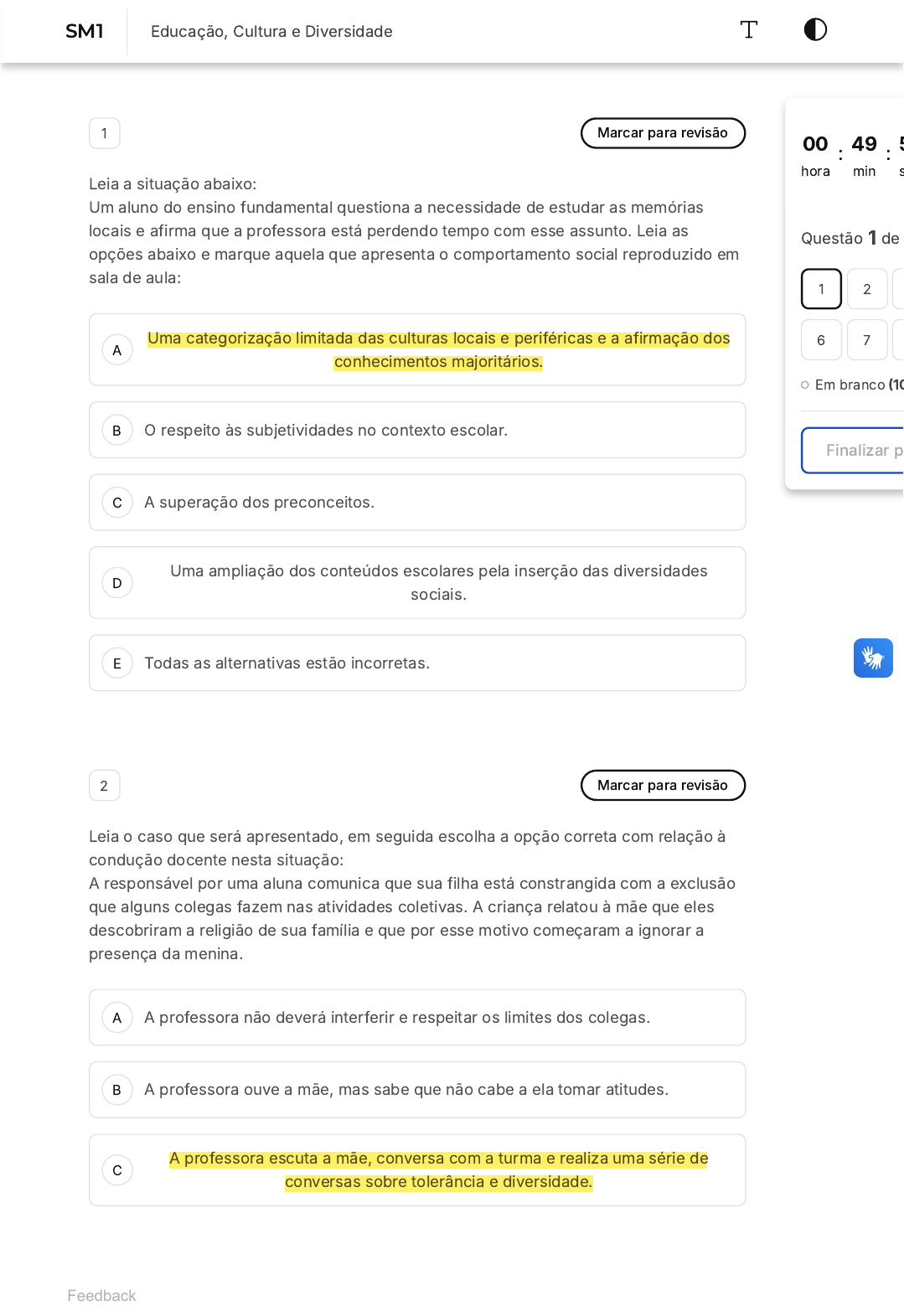 <p>A</p><p>B</p><p>C</p><p>D</p><p>E</p><p>A</p><p>B</p><p>C</p><p>1 Marcar para revisão</p><p>Leia a situação abaixo:</p><p>Um aluno do ensino fundamental questiona a necessidade de estudar as memórias</p><p>locais e afirma que a professora está perdendo tempo com esse assunto. Leia as</p><p>opções abaixo e marque aquela que apresenta o comportamento social reproduzido em</p><p>sala de aula:</p><p>Uma categorização limitada das culturas locais e periféricas e a afirmação dos</p><p>conhecimentos majoritários.</p><p>O respeito às subjetividades no contexto escolar.</p><p>A superação dos preconceitos.</p><p>Uma ampliação dos conteúdos escolares pela inserção das diversidades</p><p>sociais.</p><p>Todas as alternativas estão incorretas.</p><p>2 Marcar para revisão</p><p>Leia o caso que será apresentado, em seguida escolha a opção correta com relação à</p><p>condução docente nesta situação:</p><p>A responsável por uma aluna comunica que sua filha está constrangida com a exclusão</p><p>que alguns colegas fazem nas atividades coletivas. A criança relatou à mãe que eles</p><p>descobriram a religião de sua família e que por esse motivo começaram a ignorar a</p><p>presença da menina.</p><p>A professora não deverá interferir e respeitar os limites dos colegas.</p><p>A professora ouve a mãe, mas sabe que não cabe a ela tomar atitudes.</p><p>A professora escuta a mãe, conversa com a turma e realiza uma série de</p><p>conversas sobre tolerância e diversidade.</p><p>00</p><p>hora</p><p>: 49</p><p>min</p><p>: 5</p><p>s</p><p>Questão 1 de</p><p>Em branco �10</p><p>Finalizar p</p><p>1 2</p><p>6 7</p><p>Feedback</p><p>SM1 Educação, Cultura e Diversidade</p><p>D</p><p>E</p><p>A</p><p>B</p><p>C</p><p>D</p><p>E</p><p>A</p><p>B</p><p>C</p><p>A professora conversa com a turma e chama a atenção do grupo, sem</p><p>conversar sobre preconceito religioso.</p><p>Todas as alternativas estão incorretas.</p><p>3 Marcar para revisão</p><p>Leia o caso que será apresentado:</p><p>Um grupo de responsáveis questiona as conduções do professor. Segundo eles, a turma</p><p>está debatendo de maneira aberta os assuntos religiosos e isso tem gerado problemas</p><p>em suas famílias. Alguns dizem que os discentes estão questionando demais!</p><p>Qual o recurso legal que garante a liberdade docente com relação a esse tema?</p><p>Nenhum recurso, o tema é contemplado no currículo escolar.</p><p>Nenhum recurso, a condução do professor está equivocada.</p><p>Não existe recurso, o professor não possui respaldo.</p><p>A lei 10.639 e a luta dos movimentos sociais respaldam as ações do professor.</p><p>Todas as alternativas estão incorretas.</p><p>4 Marcar para revisão</p><p>Com relação às favelas, podemos afirmar que:</p><p>O conceito consegue envolver de maneira única todas as comunidades</p><p>brasileiras.</p><p>São comunidades receptoras de conhecimento e reproduzem as culturas</p><p>padrões.</p><p>É um espaço homogêneo e padronizado.</p><p>D</p><p>E</p><p>A</p><p>B</p><p>C</p><p>D</p><p>E</p><p>São lugares de produção de conhecimento, de diversidade e de mobilizações</p><p>coletivas.</p><p>Todas as alternativas estão incorretas.</p><p>5 Marcar para revisão</p><p>Leia a charge abaixo, que foi capa do jornal Mulherio e tem autoria de Henfil.</p><p>Fonte:https://www.fcc.org.br/livros/CRECHE_E_FEMINISMO_Donwload_pedro_menor.pdf</p><p>Com relação ao conteúdo presente na charge, é correto afirmar:</p><p>Diz respeito à luta organizada das mulheres das favelas.</p><p>É apenas uma charge e não possui relação com nenhum conteúdo.</p><p>É uma luta individual e não diz respeito às pessoas das favelas.</p><p>Não possui nenhuma conexão com a luta das mulheres pelo direito à creche.</p><p>Todas as alternativas estão incorretas.</p><p>6 Marcar para revisão</p><p>Quem acompanhasse os debates na Câmara dos Deputados em 1884 poderia ouvir a</p><p>leitura de uma moção de fazendeiros do Rio de Janeiro:</p><p>Ninguém no Brasil sustenta a escravidão pela escravidão, mas não há um só brasileiro</p><p>que não se oponha aos perigos da desorganização do atual sistema de trabalho. Livres</p><p>os negros, as cidades seriam invadidas por turbas ignaras, gente refratária ao trabalho e</p><p>A</p><p>B</p><p>C</p><p>D</p><p>E</p><p>A</p><p>B</p><p>C</p><p>ávida de ociosidade. A produção seria destruída e a segurança das famílias estaria</p><p>ameaçada. Veio a Abolição, o Apocalipse ficou para depois e o Brasil melhorou (ou será</p><p>que alguém duvida?�. Passados dez anos do início do debate em torno das ações</p><p>afirmativas e do recurso às cotas para facilitar o acesso dos negros às universidades</p><p>públicas brasileiras, felizmente é possível conferir a consistência dos argumentos</p><p>apresentados contra essa iniciativa. De saída, veio a advertência de que as cotas</p><p>exacerbariam a questão racial. Essa ameaça vai completar 18 anos e não se registraram</p><p>casos significativos de exacerbação.</p><p>GASPARI. E. As cotas e a urucubaca. In: Folha de S. Paulo. Publicado em: 3 jun. 2009.</p><p>O argumento elaborado pelo autor sugere que as censuras às cotas raciais são:</p><p>Politicamente ignoradas.</p><p>Socialmente justificadas.</p><p>Culturalmente qualificadas.</p><p>Historicamente equivocadas.</p><p>Economicamente fundamentadas.</p><p>7 Marcar para revisão</p><p>A população negra teve que enfrentar sozinha o desafio da ascensão social, e</p><p>frequentemente procurou fazê-lo por rotas originais, como o esporte, a música e a</p><p>dança. Esporte, sobretudo o futebol, música, sobretudo o samba, e dança, sobretudo o</p><p>carnaval, foram os principais canais de ascensão social dos negros até recentemente. A</p><p>libertação dos escravos não trouxe consigo a igualdade efetiva. Essa igualdade era</p><p>afirmada nas leis, mas negada na prática. Ainda hoje, apesar das leis, aos privilégios e