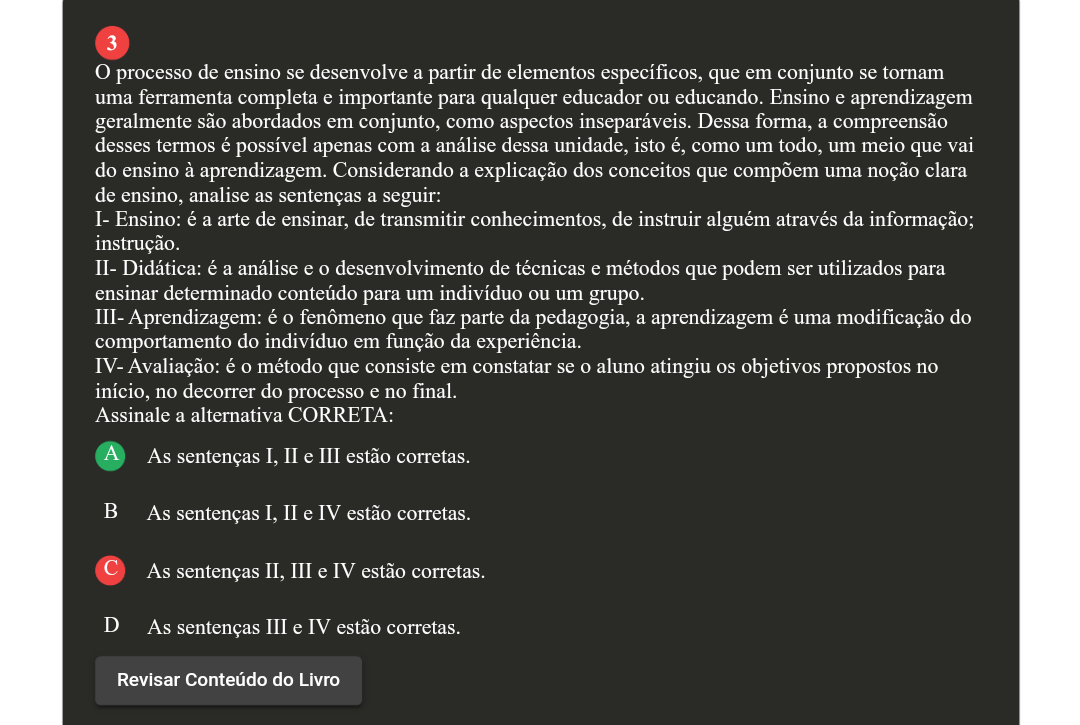 <p>3 processo de ensino se desenvolve a partir de elementos específicos, que em conjunto se tornam uma ferramenta completa e importante para qualquer educador ou educando. Ensino e aprendizagem geralmente são abordados em conjunto, como aspectos inseparáveis. Dessa forma, a compreensão desses termos é possível apenas com a análise dessa unidade, isto é, como um todo, um meio que vai do ensino à aprendizagem. Considerando a explicação dos conceitos que compõem uma noção clara de ensino, analise as sentenças a seguir: I- Ensino: é a arte de ensinar, de transmitir conhecimentos, de instruir alguém através da informação; instrução. II- Didática: é a análise e desenvolvimento de técnicas e métodos que podem ser utilizados para ensinar determinado conteúdo para um indivíduo ou um grupo. III- Aprendizagem: é fenômeno que faz parte da pedagogia, a aprendizagem é uma modificação do comportamento do indivíduo em função da experiência. IV- Avaliação: é método que consiste em constatar se aluno atingiu os objetivos propostos no início, no decorrer do processo e no final. Assinale a alternativa CORRETA: A As sentenças I, II e III estão corretas. B As sentenças I, II e IV estão corretas. C As sentenças II, III e IV estão corretas. D As sentenças III e IV estão corretas. Revisar Conteúdo do Livro</p>