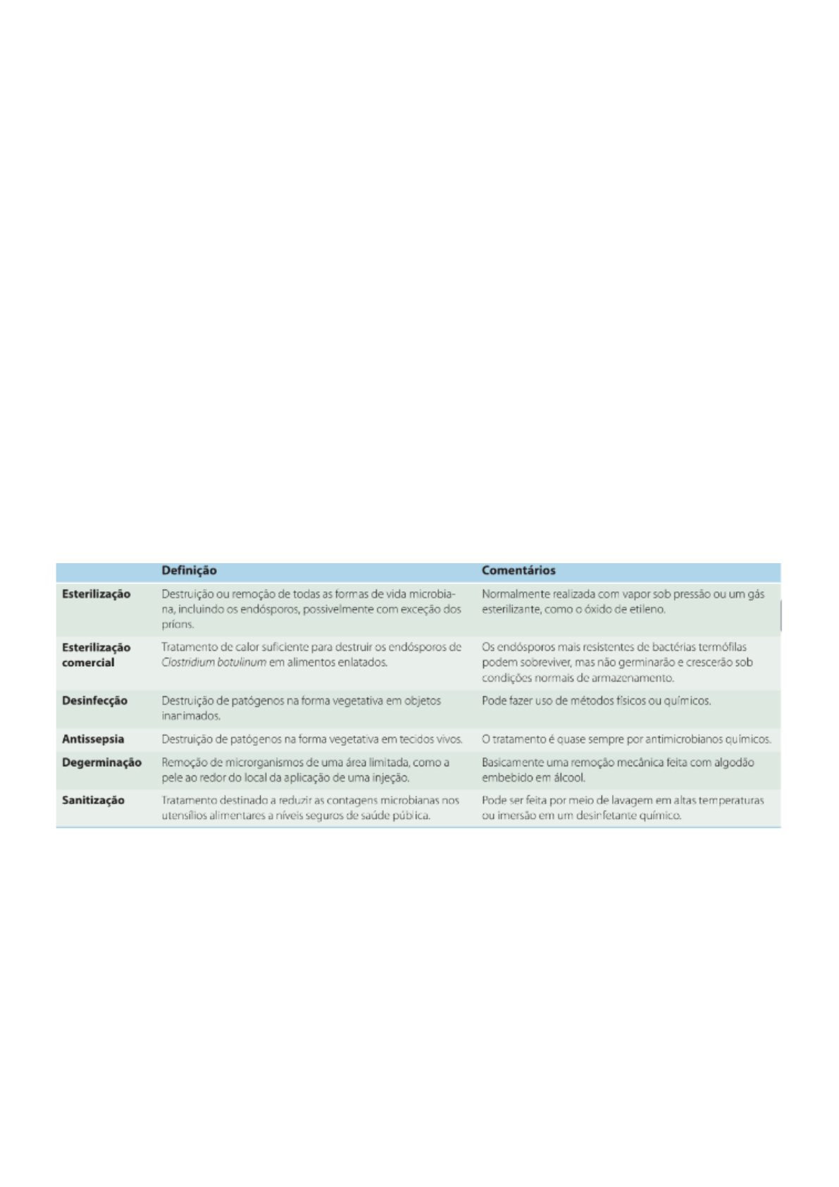 <p>Controle de crescimento microbiano - Tortora, cap 7</p><p>- Esterilização > processo que se utiliza de um esterilizante para retirar ou destruir</p><p>todos os microrganismos. Geralmente usa-se o aquecimento como ferramenta</p><p>para tal</p><p>- esterelização comercial > processo que alimentos enlatados passam, não</p><p>remove todos os microrganismos. A temperatura usada é a suficiente para matar</p><p>endósporos de Clostridium botulinum</p><p>- bactérias termófilas não são destruídas mas não são consideradas, em meio</p><p>padrão, potenciais patógenos</p><p>- desinfecção> processo que permite a destruição de patógenos em seu formato</p><p>vegetativo > radiação UV, calor, vapor, desinfetantes..</p><p>- antissepsia> mesma ideia da desinfeção mas voltado para tecidos vivos ></p><p>retira contaminação</p><p>- degermação > remoção mecânica de microrganismos</p><p>- sanitização> reduz para quantidades aceitáveis a quantidade de</p><p>microrganismos visando não gerar contaminação</p><p>- morte direta do microorg> sufixo IDA > biocida, germicida</p><p>- inibe crescimento e multiplicação de bacs > sufixo STASE /STATICO ></p><p>bacteriostase</p><p>- Sepse> termo que indica contaminação bacteriana</p><p>- assepsia > ausência de contaminação significativa > evita contaminação</p><p>Taxa de morte microbiana</p><p>- quando há um processo de morte de bactérias, isso ocorre em uma taxa</p><p>constante</p><p>fatores que influenciam a efetividade dos tratamentos antimicrobianos</p><p>- número de micróbios > quantidade e tempo diretamente proporcionais</p><p>- influência ambiental > soluções aquecidas são mais eficientes</p><p>- natureza do meio de suspensão > modulação da ação do calor (gordura e</p><p>proteínas protegem microorg. Meios ácidos favorecem o calor)</p><p>Naju Gomes, T16</p><p>- tempo de exposição> diretamente proporcional</p><p>- características microbianas</p><p>Teoria da geração espontânea</p><p>Alteração na permeabilidade da membrana</p><p>- muitos agentes de controle microbiano tem como alvo a membrana plasmática</p><p>dos microorg</p><p>- danos aos seus componentes estruturais - lipídeos e proteínas - vão gerar</p><p>extravasamento do conteúdo celular</p><p>- extravasamento > interfere no crescimento da célula</p><p>Danos às proteínas e aos ácidos nucleicos</p><p>- bactérias como pacotes de enzima</p><p>- propriedades das enzimas graças a sua estrutura tridimensional > mantida por</p><p>ligações químicas</p><p>- alguns produtos químicos ou calor podem quebrar as ligações de H, covalentes</p><p>e pontes dissulfeto > desnaturação da proteína</p><p>Métodos físicos de controle microbiano</p><p>- uso de sal e secagem durante a antiguidade já como métodos de controle</p><p>microbiano</p><p>Calor</p><p>- destrói microrganismos a partir da desnaturação de proteínas pela modificação</p><p>de sua estrutura tridimensional</p><p>- Tempo de morte térmica (PMT) menor temperatura em que todos os</p><p>microrganismos de uma suspensão líquida estarão mortos em 10 min</p><p>Naju Gomes, T16</p><p>- Tempo de morte térmica (TMT) tempo mínimo que todas as bacs de uma</p><p>cultura líq estarão mortos em uma dada temperatura</p><p>- ambos, TMP e TMT, são bons indicadores em relação a severidade do</p><p>tratamento necessário para destruir uma população bacteriana</p><p>- Tempo de redução decimal (TRD) > relacionado à resistência bacteriana ao</p><p>calor > tempo, em minutos, em que 90% de uma população de bactérias em uma</p><p>dada temperatura será destruída</p><p>Esterilização por calor úmido</p><p>- destrói microrganismos pela coagulação das proteínas (desnaturação)</p><p>- ex: fervura - destrói a maioria dos patógenos, alguns endósporos podem ser</p><p>mais resistentes</p><p>- autoclave: método de preferência para estabilização em ambientes de cuidado</p><p>da saúde (não é usado caso o material possa ser danificado pelo calor ou</p><p>umidade) > maior pressão > maior temperatura. Em níveis industriais é chamado</p><p>de retortas</p><p>- autoclave mais eficiente quando os microorg estão em contato direto com o</p><p>vapor ou estão em pequena porção de solução aquosa</p><p>- aquecimento de objetos sólidos requer maior tempo, bem como grandes</p><p>recipientes</p><p>-</p><p>Naju Gomes, T16</p><p>Pasteurização</p><p>- processo de eliminação de patógenos</p><p>- aquecimento de produtos viscosos e com alta taxa de gordura são mais difíceis</p><p>de serem aquecidos e terem a retirada de microrganismos</p><p>- teste da fosfatase> enzima presente no leite, o teste indica se o leite foi ou não</p><p>pasteurizado</p><p>- atualmente a maioria dos processos de pasteurização usa temperatura mínima</p><p>de 72 graus > 15 segundos > processo de pasteurização de alta temperatura</p><p>de curto tempo (HTST) > destrói patógenos e diminui contagem de bact</p><p>Esterilização</p><p>- leite pode ser esterilizado por tratamento de temperaturas ultraelevada (UHT)</p><p>- quão maior a temperatura, menor o tempo necessário para o processo ser</p><p>efetivo</p><p>Esterilização por calor seco</p><p>- calor seco destrói por efeitos de oxidação</p><p>- método de chama direta > ex: quando esterilizamos alças de inoculação na aula</p><p>de micro para preparar lâminas de visualização de microrganismos</p><p>- esterilização em ar quente> itens são colocados em um forno</p><p>Filtração</p><p>- passagem de um líquido ou um gás por um material semelhante a uma tela com</p><p>poros que retém microrganismos</p><p>- utilizado como método para esterilizar materiais que são sensíveis ao calor ></p><p>meios de cultura, enzimas, vacinas, soluções antibióticas</p><p>- HEPA (filtros de ar particulado de alta eficiência) usados em salas de cirurgia ou</p><p>salas para pacientes com queimaduras > retira microrganismos do ar</p><p>- filtros antigos deixa