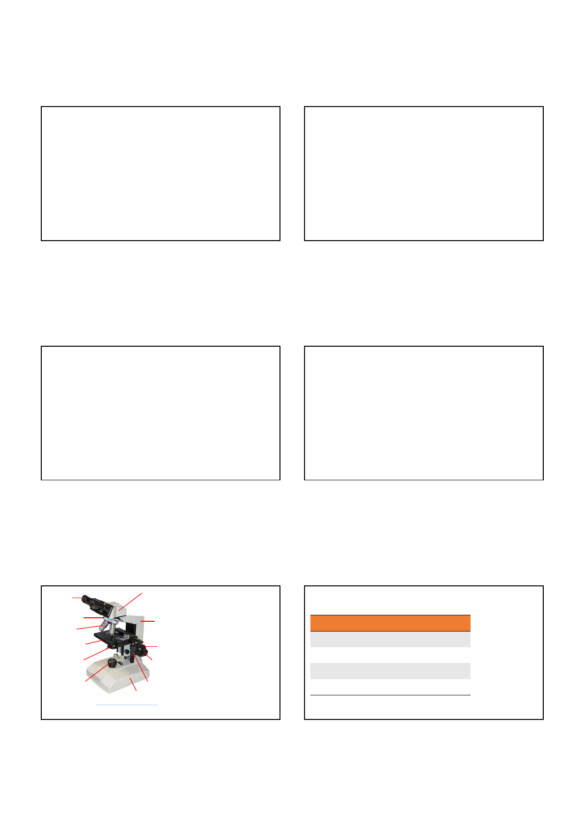 <p>23/06/2021</p><p>Introdução à</p><p>Biologia Celular e do</p><p>Desenvolvimento</p><p>Aula Prática 01</p><p>Prof. Dra. Ana Paula Scaramal Ricietto</p><p> Conhecer e manipular o microscópio óptico.</p><p> Reconhecer e identificar as diferenças</p><p>estruturais entre células procariontes e</p><p>eucariontes.</p><p> Observar a organização hierárquica das células</p><p>eucariontes quanto a formação de tecidos e</p><p>órgãos.</p><p>Microscopia</p><p>óptica</p><p>Base</p><p>Charriot</p><p>Mesa ou platina</p><p>Parafuso</p><p>micrométrico</p><p>Parafuso macrométrico</p><p>Fonte de luz</p><p>Condensador com</p><p>diafragma</p><p>Revólver</p><p>Tubo ou canhão</p><p>Braço</p><p>Oculares</p><p>Objetivas</p><p>Fonte: PublicDomainPictures / Pixabay. Disponível em https://pixabay.com/pt/photos/branco-qu%C3%ADmica-isolado-microscopia-219983/. Acesso em 16 jul. 2020.</p><p>Microscópio óptico Cálculo da ampliação total (Microscopia óptica)</p><p>Ocular Objetiva Aumento Total</p><p>10x 4x 40x</p><p>10x 10x 100x</p><p>10x 40x 400x</p><p>10x 100x 1000x</p><p>Fonte: Autora, 2021.</p><p>1 2</p><p>3 4</p><p>5 6</p><p>VIDA</p><p>REPRODUÇÃO</p><p>HEREDITARIEDADE</p><p>HOMEOSTASE</p><p>METABOLISMO</p><p>CELULA</p><p>ADAPTAÇÃO</p><p>CRESCIMENTO E DESENVOLVIMENTO</p><p>Highlight</p><p>Highlight</p><p>Highlight</p><p>Highlight</p><p>Highlight</p><p>Highlight</p><p>Highlight</p><p>Highlight</p><p>Highlight</p><p>Highlight</p><p>Highlight</p><p>Highlight</p><p>Highlight</p><p>Highlight</p><p>PARA TER VIDA PRECISA TER CELULAS</p><p>23/06/2021</p><p>Fonte: Wikimedia Commons / CNX OpenStax. Disponível em https://commons.wikimedia.org/w/index.php?curid=49923763. Acesso em 21 mai 2021.</p><p>Coloração HE</p><p> Corantes ácidos: interagem com estruturas</p><p>básicas das células, geralmente do citoplasma,</p><p>corando-as.</p><p>• Eosina (coloração rósea)</p><p>• Fucsina (coloração vermelha)</p><p> Corantes básicos: coram estruturas ácidas</p><p>(núcleo)</p><p>• Hematoxilina (coloração azul)</p><p>Microscopia</p><p> Recortar uma pequena letra de jornal;</p><p> Colocar uma gota de água sobre a lâmina, com auxílio de um conta-gotas</p><p>ou pipeta;</p><p> Colocar a letra de jornal (na posição de leitura) sobre a gota de água;</p><p> Colocar a lamínula na posição de 45º em relação à lâmina, abaixando-a</p><p>suavemente;</p><p> Caso haja excesso de líquido (fora da lamínula), retirá-lo com papel</p><p>absorvente;</p><p> Seguir as etapas de focalização indicadas pelo professor;</p><p> Desenhar nos aumentos de 40x, 100x, 400x e 1000x.</p><p> Esquematizar após a observação.</p><p>Ampliada Invertida da</p><p>esquerda</p><p>para direita</p><p>Invertida de</p><p>cima para</p><p>baixo</p><p>Fonte: Leite, C. M. Adaptada; JUNQUEIRA, LUIZ CARLOS UCHOA; CARNEIRO, JOSÉ. Biologia celular e molecular. 9. ed. Rio de Janeiro: Guanabara Koogan, 2012.</p><p>Formação de imagem</p><p>microscopia óptica</p><p>7 8</p><p>9 10</p><p>11 12</p><p>23/06/2021</p><p>Eucariontes:</p><p>animal</p><p>Fonte: Adaptado de Madigan et al. Brock biology of microoganisms. 13 ed. Pearson, 2012.</p><p>Eucariontes</p><p>Eucarionte animal:</p><p>mucosa bucal</p><p> Raspar levemente, com o auxílio da espátula, a mucosa bucal.</p><p> Espalhar o material da espátula na lâmina.</p><p> Adicionar uma gota do corante sobre a lâmina e aguardar 2’.</p><p> Com o auxílio de uma almotolia/piseta, remover o excesso do corante.</p><p> Cobrir a lâmina com uma lamínula.</p><p> Retirar as bolhas de ar pressionando a pinça levemente sobre a</p><p>lamínula.</p><p> Observar no microscópio, nos aumentos de 10x e 40x focalizando a</p><p>imagem com o auxílio do micrométrico.</p><p> Esquematizar as estruturas observadas.</p><p>Observação</p><p>comentada</p><p>13 14</p><p>15 16</p><p>17 18</p><p>23/06/2021</p><p>Eucariontes:</p><p>vegetal</p><p>Fonte: Raven et al. Biologia Vegetal . 8 ed. Guanabara Koogan, 2014.</p><p>Fonte: Adaptado de Reece et al. Biologia de Campbell. 10 ed. Artmed, 2015.</p><p>Núcleo RER</p><p>REL</p><p>Ribossomos</p><p>Vacúolo central</p><p>Microfilamentos</p><p>Microtúbulos</p><p>Cloroplastos</p><p>Plasmodesmos</p><p>Parede celular</p><p>Membrana celular</p><p>Peroxissomos</p><p>Mitocôndria</p><p>Golgi</p><p>Eucarionte vegetal:</p><p>cebola</p><p> Com a pinça, retire a epiderme da cebola colocando-a na lâmina sobre</p><p>uma gota d’água. Cubra-a com a lamínula.</p><p> Retirar as bolhas de ar pressionando a pinça levemente sobre a</p><p>lamínula.</p><p> Observar no microscópio, nos aumentos de 10x e 40x focalizando a</p><p>imagem com o auxílio do micrométrico.</p><p> Retire a lâmina da platina para a coloração com azul de metileno.</p><p> Colocar o papel-filtro ao lado da lamínula.</p><p> Adicionar uma gota de corante ao lado oposto do papel (o papel</p><p>absorverá o excesso de água-corante).</p><p> Observar no microscópio, nos aumentos de 10x e 40x focalizando a</p><p>imagem com o auxílio do micrométrico.</p><p> Esquematize as estruturas observadas salientando as diferenças</p><p>proporcionadas pela coloração.</p><p>Observação</p><p>comentada</p><p>Fonte: Wikimedia Commons. Disponível em https://commons.wikimedia.org/wiki/File:Onion_Cells.jpg#/media/File:Onion_Cells.jpg. Acesso em 22 mai 2021.</p><p>19 20</p><p>21 22</p><p>23 24</p><p>23/06/2021</p><p>Procariontes</p><p>ProcariontesFímbrias</p><p>Citoplasma</p><p>Ribossomos</p><p>Nucleoide</p><p>Inclusões</p><p>Plasmídeo</p><p>Flagelo</p><p>Pili</p><p>Cápsula</p><p>Parede</p><p>celular</p><p>Membrana</p><p>celular</p><p>Fonte: Adaptado de Lumen Microbiology. Disponível em https://courses.lumenlearning.com/microbiology/chapter/unique-characteristics-of-prokaryotic-cells/. Acesso em 21 mai 2021. Fonte: Adaptado de Lumen Microbiology. Disponível em https://courses.lumenlearning.com/microbiology/chapter/unique-characteristics-of-prokaryotic-cells/. Acesso em 21 mai 2021.</p><p>Parede celul