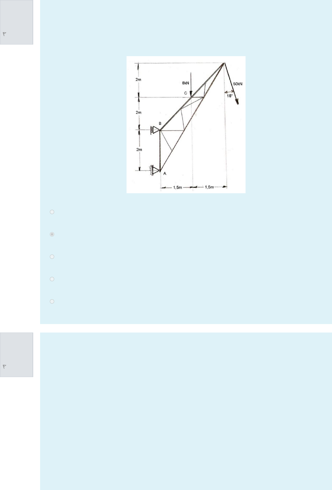 <p>Questão 1</p><p>Correto</p><p>Atingiu 0,34 de</p><p>0,34</p><p>Marcar</p><p>questão</p><p>Questão 2</p><p>Correto</p><p>Atingiu 0,34 de</p><p>0,34</p><p>Marcar</p><p>questão</p><p>Guindastes são amplamente utilizados em muitas aplicações. Uma delas é na construção civil, para içar vigas, blocos de concreto, entre</p><p>outros. A figura abaixo esquematiza um guindaste içando um determinado bloco de concreto com peso de 50 kN. De forma simplificada, o</p><p>peso do guindaste é descrito por 8 kN atuando no ponto C. Baseado nas forças aplicadas e nos vínculos presentes nos pontos A e B,</p><p>determina as reações de apoio para que a estrutura esteja em equilíbrio.</p><p>Escolha uma opção:</p><p>a.</p><p>𝑉𝐴 =55,5 kN (para cima); 𝐻𝐴 = 108,2 kN (para direita); 𝐻𝐵 = 123,7 kN (para direita).</p><p>b.</p><p>𝑉𝐴 =55,5 kN (para cima); 𝐻𝐴 = 108,2 kN (para direita); 𝐻𝐵 = 123,7 kN (para esquerda).</p><p>c.</p><p>𝑉𝐴 =55,5 kN (para cima); 𝐻𝐴 = 108,2 kN (para esquerda); 𝐻𝐵 = 123,7 kN (para esquerda).</p><p>d.</p><p>𝑉𝐴 =55,5 kN (para cima); 𝐻𝐴 = 108,2 kN (para esquerda); 𝐻𝐵 = 123,7 kN (para direita).</p><p>e.</p><p>𝑉𝐴 =55,5 kN (para baixo); 𝐻𝐴 = 108,2 kN (para direita); 𝐻𝐵 = 123,7 kN (para esquerda).</p><p>Quando abrirmos a porta de um carro estamos aplicando uma determinada força a certa distância. Isto faz com que gere um momento no</p><p>ponto de apoio da porta, girando-a em relação a um eixo ou a um ponto. Suponha que o ponto O seja o engate da porta e que a força F é</p><p>aplicada tentando abri-la. Determine o momento gerado no ponto de apoio pela força F. Lembre-se que este momento não é o momento</p><p>que o apoio gera, mas sim o momento que a força aplicada faz sobre o apoio.</p><p>Questão 3</p><p>Correto</p><p>Atingiu 0,34 de</p><p>0,34</p><p>Marcar</p><p>questão</p><p>Escolha uma opção:</p><p>a.</p><p>𝑀𝑜= (-348,9 N.m) 𝑖 + (-471 N.m) 𝑗 + (-418,7 N.m) 𝑘</p><p>b.</p><p>𝑀𝑜= (348,9 N.m) 𝑖 + (-471 N.m) 𝑗 + (418,7 N.m) 𝑘</p><p>c.</p><p>𝑀𝑜= (-348,9 N.m) 𝑖 + (471 N.m) 𝑗 + (-418,7 N.m) 𝑘</p><p>d.</p><p>𝑀𝑜= (348,9 N.m) 𝑖 + (-471 N.m) 𝑗 + (-418,7 N.m) 𝑘</p><p>e.</p><p>𝑀𝑜= (348,9 N.m) 𝑖 + (471 N.m) 𝑗 + (418,7 N.m) 𝑘</p><p>A figura abaixo mostra uma viga engastada sujeito a uma força em B devido à um corpo externo, no ponto C devido a uma mola aplicando</p><p>uma força e a força que o vento provoca em sua extremidade E. Diante das dimensões, forças atuantes sob a viga e desprezando seu peso</p><p>próprio, determine as reações no vínculo para que a estrutura esteja em equilíbrio.</p><p>Escolha uma opção:</p><p>a.</p><p>𝑉𝐴 =70 N (para baixo); 𝐻𝐴 = 80 N (para esquerda); 𝑀 = 71 N.m (sentido anti-horário).</p><p>Questão 4</p><p>Incorreto</p><p>Atingiu 0,00 de</p><p>0,34</p><p>Marcar</p><p>questão</p><p>Questão 5</p><p>Correto</p><p>Atingiu 0,34 de</p><p>0,34</p><p>Marcar</p><p>questão</p><p>b.</p><p>𝑉𝐴 =70 N (para cima); 𝐻𝐴 = 80 N (para direita); 𝑀 = 71 N.m (sentido anti-horário).</p><p>c.</p><p>𝑉𝐴 =70 N (para baixo); 𝐻𝐴 = 80 N (para esquerda); 𝑀 = 71 N.m (sentido horário).</p><p>d.</p><p>𝑉𝐴 =70 N (para cima); 𝐻𝐴 = 80 N (para esquerda); 𝑀 = 71 N.m (sentido anti-horário).</p><p>e.</p><p>𝑉𝐴 =70 N (para baixo); 𝐻𝐴 = 80 N (para direta); 𝑀 = 71 N.m (sentido horário).</p><p>A figura abaixo, nos fornece um sistema no qual duas polias são tracionadas por uma força P, formando um determinado ângulo com a</p><p>horizontal e as forças dadas estão em Newton. Para que a estrutura esteja em equilíbrio, determine as reações nos vínculos A e B.</p><p>Escolha uma opção:</p><p>a.</p><p>𝑉𝐴 = 250 N; 𝐻𝐴 = 10 N; 𝑉𝐵 = 200 N; 𝐻𝐵 = 0 N</p><p>b.</p><p>𝑉𝐴 = -250 N; 𝐻𝐴 = 10 N; 𝑉𝐵 = 200 N; 𝐻𝐵 = 0 N</p><p>c.</p><p>𝑉𝐴 = -250 N; 𝐻𝐴 = -433 N; 𝑉𝐵 = 0 N; 𝐻𝐵 = 200 N</p><p>d.</p><p>𝑉𝐴 = 250 N; 𝐻𝐴 = 433 N; 𝑉𝐵 = 433 N; 𝐻𝐵 = 200 N</p><p>e.</p><p>𝑉𝐴 = -250 N; 𝐻𝐴 = 433 N; 𝑉𝐵 = 0 N; 𝐻𝐵 = 200 N</p><p>Tubulações que transportam determinados fluidos estão sujeitas a aplicação de força à todo momento, devido ao fluido que escoa dentro</p><p>da mesma. A figura abaixo esquematiza uma tubulação que transporta gás natural, sendo o ponto O uma conexão de engaste e a força</p><p>aplicada no ponto C é devido ao fluido deixando a tubulação. Determine as reações de apoio para que a tubulação esteja em equilíbrio. O</p><p>momento atuando no ponto O deve ser determinado em módulo.</p><p>Highlight</p><p>Highlight</p><p>certo</p><p>Escolha uma opção:</p><p>a.</p><p>𝑂𝑥 = -4 N; 𝑂𝑦 = 10 N ; 𝑂𝑧 = -9 N; 𝑀𝑜= 128 N.m</p><p>b.</p><p>𝑂𝑥 = 4 N; 𝑂𝑦 = 10 N ; 𝑂𝑧 = 9 N; 𝑀𝑜= 128 N.m</p><p>c.</p><p>𝑂𝑥 = 4 N; 𝑂𝑦 = 10 N ; 𝑂𝑧 = 9 N; 𝑀𝑜= 128 N.m</p><p>d.</p><p>𝑂𝑥 = -4 N; 𝑂𝑦 = 10 N ; 𝑂𝑧 = -9 N; 𝑀𝑜= 168 N.m</p><p>e.</p><p>𝑂𝑥 = -4 N; 𝑂𝑦 = -10 N ; 𝑂𝑧 = -9 N; 𝑀𝑜= 168 N.m</p>