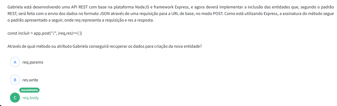 <p>Gabriela está desenvolvendo uma API REST com base na plataforma NodeJS e framework Express, e agora deverá implementar a inclusão das entidades que, segundo padrão REST, será feita com envio dos dados no formato JSON através de uma requisição para a URL de no modo POST. Como está utilizando Express, a assinatura do método segue padrão apresentado a seguir, onde req representa a requisição e res a resposta. const incluir = app.post("/", Através de qual método ou atributo Gabriela conseguirá recuperar os dados para criação da nova entidade? A req.params B res.write SUA RESPOSTA C req.body</p>