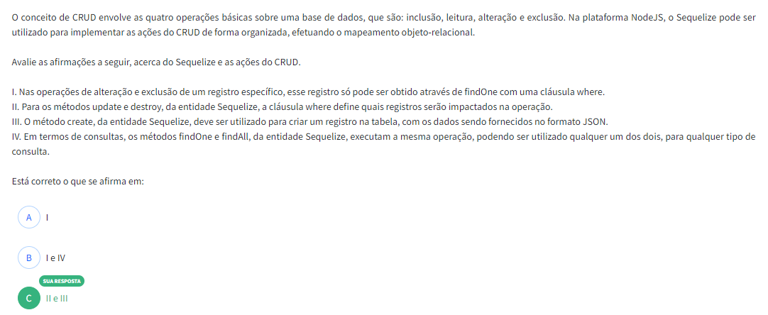 <p>conceito de CRUD envolve as quatro operações básicas sobre uma base de dados, que são: inclusão, leitura, alteração e Na plataforma NodeJS, Sequelize pode ser utilizado para implementar as ações do CRUD de forma organizada, efetuando mapeamento objeto-relacional. Avalie as afirmações a seguir, acerca do Sequelize e as ações do CRUD. I. Nas operações de alteração e exclusão de um registro específico, esse registro só pode ser obtido através de findOne com uma cláusula II. Para os métodos update e destroy, da entidade a cláusula where define quais registros serão impactados na operação. III. método create, da entidade deve ser utilizado para criar um registro na tabela, com os dados sendo fornecidos no formato IV. Em termos de consultas, os métodos findOne e findAll, da entidade Sequelize, executam a mesma operação, podendo ser utilizado qualquer um dos dois, para qualquer tipo de consulta. Está correto que se afirma em: A B IV SUA RESPOSTA III</p>
