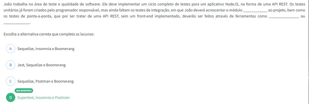 <p>João trabalha na área de teste e qualidade de Ele deve implementar um ciclo completo de testes para um aplicativo na forma de uma API REST. Os testes unitários já foram criados pelo programador responsável, mas ainda faltam os testes de integração, em que João deverá acrescentar módulo ao projeto, bem como os testes de ponta-a-ponta, que por ser tratar de uma API sem um front-end implementado, deverão ser feitos através de ferramentas como ou Escolha a alternativa correta que completa as A Insomnia e Boomerang B Jest, Sequelize e Boomerang C Postman e Boomerang SUA RESPOSTA D Supertest, Insomnia e Postman</p>