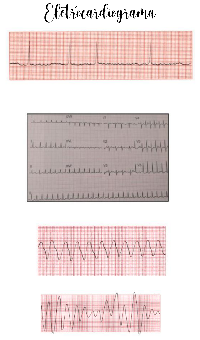 <p>Fibrilação atrial com ritmo irregular e sem ondas P, aparecimento de ondas F</p><p>Tratamento: cardioversão elétrica sincronizada.</p><p>taquicardia sinusal</p><p>Taquicardia ventricular.</p><p>Torsades de pointes</p><p>Fibrilação ventricular</p><p>Bradicardia Sinusal</p><p>Taquicardia supraventricular- QRS alargado</p><p>Taquiarritmia ventricular. Complexo QRS estreito.</p><p>Flutter atrial- cardioversão elétrica sintonizada, ondas em dente de serra (onda F)</p><p>Eixo elétrico normal.</p><p>Eixo elétrico desviado para a direita.</p><p>Eixo elétrico desviado para a esquerda (aVL tá predominantemente negativo)</p><p>Taquicardia sinusal, eixo normal, QRS estreito e FC de 110</p><p>Bloqueio atrioventricular total (BAVT)- onda P sozinha e QRS sem onda P.</p><p>BAV de 2º grau do tipo 2:1. NÃO responde a ATROPINA.</p><p>Taquicardia ventricular com entalhe na onda R e QRS alargado</p><p>Bloqueio de ramo direito (BRD)- onda T perto da onda P, aparecimento de R e R’ (orelha de coelho)</p><p>em V, QRS alargado: padrão rsR’.</p><p>Bloqueio de ramo esquerdo. Sinal da torre em V4, V5 que é o entalhe na onda R.</p><p>Bloqueio AV de Primeiro grau. Aumento do intervalo PR igual. Toda onda P tem QRS.</p><p>BAV de Segundo grau Mobitz 1. Aumento progressivo do intervalo PR + onda P sozinha (bloqueada)</p><p>Bradicardia Sinusal, toda onda P é seguida de QRS e a linha após a onda T está isoelétrica. Não tem</p><p>aumento do intervalo PR.</p><p>Bloqueio de Primeiro grau, aumento do intervalo PR.</p><p>Ritmo sinusal, onda P positiva em D1 e D2. A cada 2 ondas P aparece 1 QRS. Bloqueio AV 2:1.</p><p>Taquicardia Ventricular. Tratamento: manobra vagal</p><p>Flutter atrial: ondas F.</p><p>Extrassístole bigeminada: ausência de onda T e QRS aberrantes.</p><p>Bloqueio sinoatrial.</p><p>Extrassístole juncional. O segundo QRS está sozinho (sem onda P). OBS: extrassístole é um batimento</p><p>antes do tempo.</p><p>Extrassístole atrial. Extrassístole atrial é basicamente um batimento antes da hora + precedido de P</p><p>diferente.</p><p>Taquicardia sinusal.</p><p>Flutter atrial.</p><p>Fibrilação atrial: QRS estreito nos diz que é TAQUICARDIA SUPRAVENTRICULAR. O ritmo é IRREGULAR e</p><p>não se enxerga onda P.</p><p>Taquicardia atrial com onda P bloqueada: intoxicação por digitálicos. Tratamento: verapamil,</p><p>betabloqueador.</p><p>Ritmo Juncional: QRS estreito, sem onda P precedente.</p><p>Taquicardia juncional não paroxística: rimo juncional + intervalo RR regular.</p>