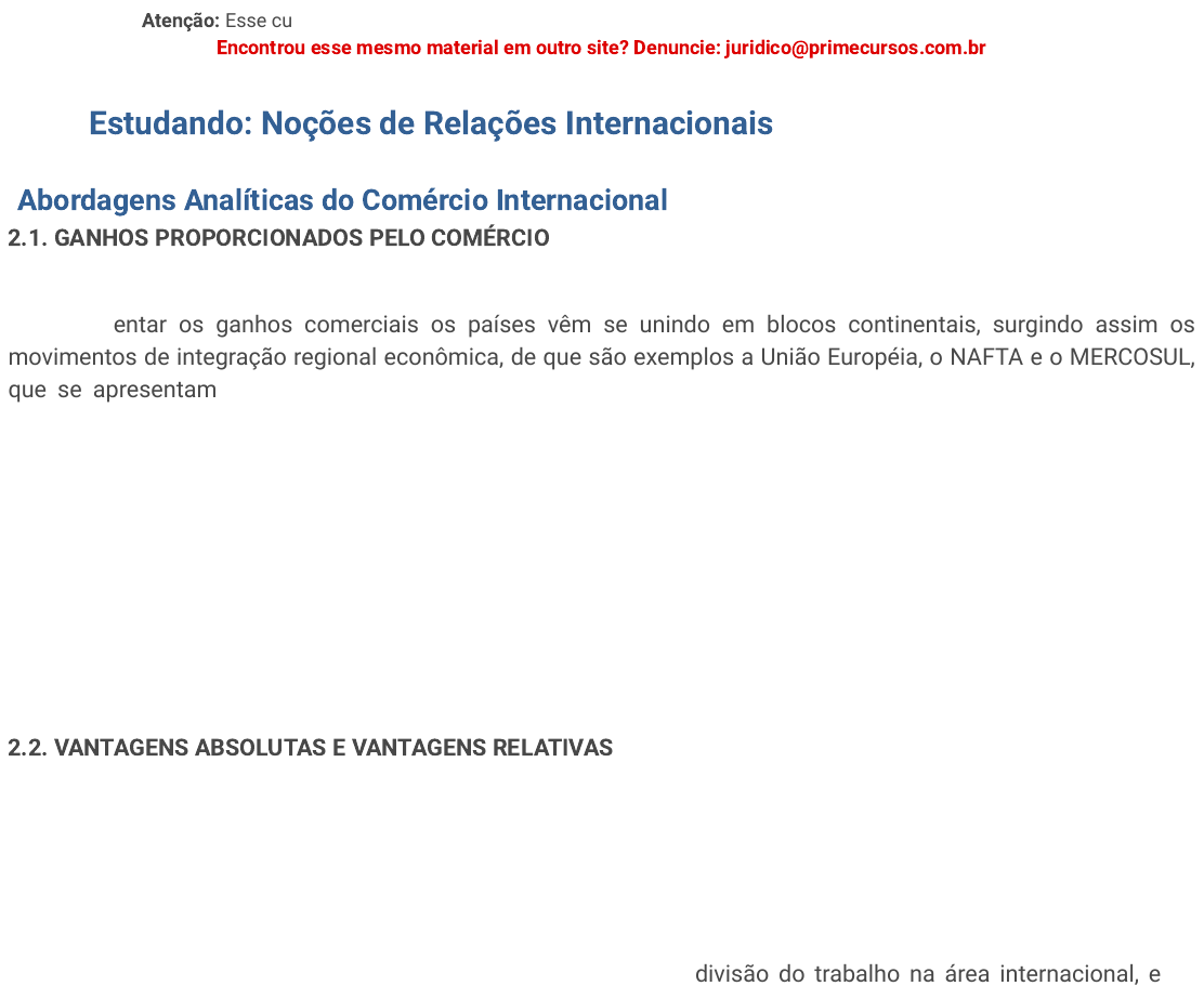 <p>Atenção: Esse curso é de autoria da Prime Cursos do Brasil LTDA (registro número 978-85-5906-000-3 BN)</p><p>Encontrou esse mesmo material em outro site? Denuncie: juridico@primecursos.com.br</p><p>Estudando: Noções de Relações Internacionais</p><p>Abordagens Analíticas do Comércio Internacional</p><p>2.1. GANHOS PROPORCIONADOS PELO COMÉRCIO</p><p>Para aumentar os ganhos comerciais os países vêm se unindo em blocos continentais, surgindo assim os</p><p>movimentos de integração regional econômica, de que são exemplos a União Européia, o NAFTA e o MERCOSUL,</p><p>que se apresentam como um dos fatores que mais tem contribuído para a expansão do comércio mundial,</p><p>exercendo substanciais efeitos sobre o volume das transações internacionais.</p><p>As vantagens para os países membros serão enormes, pois a remoção de entraves aduaneiros e de restrições</p><p>não-tarifárias, possibilitada por esses movimentos de integração econômica, estimulará a especialização e</p><p>favorecerá as vocações naturais à divisão internacional do trabalho.</p><p>Apesar de restringir a participação de países não-membros, os movimentos de integração regional acabam por</p><p>produzir efeitos positivos no comércio internacional, em consequência do crescimento que produz nas economias</p><p>dos países do bloco, o que amplia a demanda por importações fora da área.</p><p>2.2. VANTAGENS ABSOLUTAS E VANTAGENS RELATIVAS</p><p>VANTAGENS ABSOLUTAS</p><p>O princípio da Teoria das Vantagens Absolutas surgiu das idéias do economista Adam Smith, em sua obra "A</p><p>Riqueza das Nações", editada em 1776.</p><p>Idéias Básicas: a especialização das produções, motivada pela divisão do trabalho na área internacional, e as</p><p>trocas efetuadas no comércio internacional CONTRIBUÍAM para o aumento do bem-estar das populações.</p><p>Teoria das Vantagens Absolutas: “Cada país deve concentrar seus esforços no que pode produzir a custo mais</p><p>baixo e trocar o excedente dessa produção por produtos que custem menos em outros países”</p><p>VANTAGENS COMPARATIVAS</p><p>As idéias de Adam Smith foram desenvolvidas pelo economista inglês David Ricardo em 1817, que formulou a</p><p>Teoria das Vantagens Comparativas, também chamada de Teoria dos Custos Comparativos.</p><p>Idéias Básicas: o comércio internacional será vantajoso até mesmo nos casos em que uma nação possa produzir</p><p>internamente a custos mais baixos do que a nação parceira, desde que, em termos relativos, as produtividades de</p><p>cada uma fossem relativamente diferentes.</p><p>· Assim, a especialização internacional seria MUTUAMENTE VANTAJOSA em todos os casos em que as nações</p><p>parceiras canalizassem os seus recursos para a produção daqueles bens em que sua eficiência fosse</p><p>relativamente maior.</p><p>Assim, ao conduzir à especialização e a divisão internacional do trabalho, seja por desiguais reservas produtivas,</p><p>por diferenças de solo e de clima ou por desigualdades estruturais de capital e trabalho, o comércio exterior</p><p>aumenta a eficiência com que os recursos disponíveis em cada país podem ser empregados.</p><p>E este aumento de eficiência, possível sempre que observarem vantagens comparativas, eleva a produção e a</p><p>renda nos países envolvidos nas trocas.</p><p>- O modelo Ricardiano é o mais simples dos modelos que explicam como as diferenças entre os países acarretam</p><p>as trocas e ganhos no comércio internacional, pois, neste modelo, o trabalho é o único fator de produção e os</p><p>países diferem apenas na produtividade do trabalho nas diferentes indústrias.</p><p>- Os países EXPORTARÃO OS BENS PRODUZIDOS com o trabalho interno de modo relativamente eficiente e</p><p>IMPORTARÃO BENS PRODUZIDOS pelo trabalho interno de modo relativamente ineficiente, ou seja, o padrão de</p><p>produção de um país é determinado pelas vantagens comparativas.</p><p>Teoria da Demanda Recíproca: formulada por John Stuart Mill, diz que a base não é a unidade de produto, mas a</p><p>quantia em um mesmo número de horas que dois países possam produzir.</p><p>Idéias Básicas: dois países podem efetuar trocas em função das alterações nas demandas de cada pais,</p><p>provocadas por problemas conjunturais, que aumentam ou diminuem a necessidade momentânea que cada país</p><p>tem das mercadorias negociadas. Portanto, Mill introduziu um novo fator que estabelece o valor de troca, que é a</p><p>demanda pelas mercadorias negociáveis nos dois países, possibilitando a realização de comércio quando os</p><p>preços equalizarem as demandas nos dois países.</p><p>2.3. DOTAÇÃO DE FATORES E COMÉRCIO INTERNACIONAL</p><p>Modelo dos Fatores Específicos: modelo desenvolvido por Paul Samuelson e Ronald Jones, diz que uma</p><p>economia produtora de dois bens podia alocar sua oferta de mão-de-obra entre os dois setores.</p><p>· Tal modelo permite a existência de fatores de produção além da mão-de-obra. A mão-de-obra é um fator móvel,</p><p>que se move entre os setores, e os outros fatores são considerados específicos, que podem ser utilizados apenas</p><p>na produção de bens particulares.</p><p>· Neste modelo, os fatores específicos dos setores de exportação em cada pais ganham com o comércio,</p><p>enquanto os fatores específicos dos setores concorrentes das importações perdem. Os fatores móveis que</p><p>podem ser usados em ambos os setores podem tanto ganhar como perder.</p><p>· O comércio internacional depende das diferenças dos custos relativos dos artigos produzidos pelos vários</p><p>países. As teorias já analisadas não explicavam as razões pelas quais os custos são mais baixos e o trabalho é</p><p>mais eficiente em um país do que em outro, para a produção de um determinado bem.</p><p>Modelo Hecksher – Ohlin: Para superar estas limitações, dois economistas suecos, Eli F. Hecksher 
