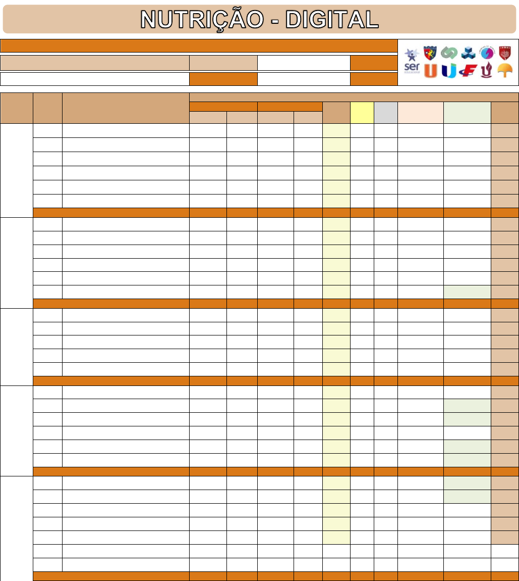 <p>Presencial EAD Presencial EAD</p><p>A-B-C-D-E ENSINO DIGITAL 40 20 60 60</p><p>A</p><p>SAÚDE COLETIVA E VIGILÂNCIA</p><p>EPIDEMIOLÓGICA</p><p>80 80 80</p><p>B</p><p>DESENVOLVIMENTO SUSTENTÁVEL E DIREITOS</p><p>INDIVIDUAIS</p><p>80 80 80</p><p>C BIOÉTICA E BIOSSEGURANÇA EM SAÚDE 80 80 80</p><p>D PSICOLOGIA EM SAÚDE 80 80 80</p><p>E NUTRIÇÃO: PROFISSÃO E CARREIRA 60 60 60</p><p>0 420 0 20 440 0 0 0 0 440</p><p>A</p><p>BASES DA BIOLOGIA CELULAR, MOLECULAR E</p><p>TECIDUAL</p><p>40 20 60 60</p><p>B BIOQUÍMICA HUMANA 40 20 60 60</p><p>C ANATOMIA HUMANA 40 20 60 60</p><p>D FISIOLOGIA HUMANA E BIOFÍSICA 40 20 60 60</p><p>E IMUNOLOGIA E PATOLOGIA GERAL 60 60 60</p><p>A-B-C-D-E</p><p>ATIVIDADES PRÁTICAS INTERDISCIPLINARES</p><p>DE EXTENSÃO I</p><p>0 40 40</p><p>0 220 80 0 300 0 0 0 40 340</p><p>A BIOQUÍMICA ESTRUTURAL E METABÓLICA 60 60 60</p><p>B MICROBIOLOGIA E PARASITOLOGIA 40 10 10 60 60</p><p>C TÉCNICA DIETÉTICA BÁSICA 40 20 60 60</p><p>D</p><p>BROMATOLOGIA E BIOQUÍMICA DOS</p><p>ALIMENTOS</p><p>40 20 60 60</p><p>E AVALIAÇÃO NUTRICIONAL 40 20 60 60</p><p>0 220 70 10 300 0 0 0 0 300</p><p>A EMPREENDEDORISMO 60 60 60</p><p>B</p><p>NUTRIÇÃO, DIETÉTICA E EDUCAÇÃO</p><p>NUTRICIONAL</p><p>20 20 40 20 60</p><p>C AVALIAÇÃO NUTRICIONAL APLICADA 20 20 40 20 60</p><p>D PATOLOGIA DA NUTRIÇÃO E DIETOTERAPIA 60 60 60</p><p>E</p><p>POLÍTICAS PÚBLICAS DE ALIMENTAÇÃO E</p><p>NUTRIÇÃO</p><p>60 60 20 80</p><p>A-B-C-D-E</p><p>ATIVIDADES PRÁTICAS INTERDISCIPLINARES</p><p>DE EXTENSÃO II</p><p>0 20 20</p><p>0 220 40 0 260 0 0 0 80 340</p><p>A NUTRIÇÃO E DIETÉTICA AVANÇADA 40 20 60 20 80</p><p>B TÉCNICA DIETÉTICA AVANÇADA 40 20 60 20 80</p><p>C</p><p>FARMACOLOGIA APLICADA Á NUTRIÇÃO E</p><p>INTERPRETAÇÃO DE EXAMES LABORATORIAIS</p><p>80 80 80</p><p>D NUTRIÇÃO MATERNO INFANTIL 80 80 80</p><p>E</p><p>ADMINISTRAÇÃO DE SERVIÇOS DE</p><p>ALIMENTAÇÃO</p><p>80 80 80</p><p>A-B-C-D-E</p><p>LÍNGUA BRASILEIRA DE SINAIS - LIBRAS</p><p>(disciplina optativa)</p><p>(60) (60) (60)</p><p>A-B-C-D-E OPTATIVA I (60) (60) (60)</p><p>0 320 40 0 360 0 0 0 40 400</p><p>Estrutura Curricular - BACHARELADO EM NUTRIÇÃO</p><p>GRA-MAT-DIG003 C DATA ELABORAÇÃO: 13/10/2021</p><p>VERSÃO: 00 DATA VERSÃO: 13/10/2021</p><p>Atividades</p><p>Complementares</p><p>Atividades Práticas</p><p>Interdisciplinares</p><p>de Extensão</p><p>Módulo</p><p>Total</p><p>4º</p><p>TEÓRICA PRÁTICA</p><p>Subtotal TCC Estágio</p><p>1º</p><p>2º</p><p>3º</p><p>Semestre Componentes Curriculares</p><p>CARGAS HORÁRIAS</p><p>5º</p><p>Subtotal</p><p>Subtotal</p><p>Subtotal</p><p>Subtotal</p><p>Subtotal</p><p>A</p><p>ADMINISTRAÇÃO APLICADA A PRODUÇÃO DE</p><p>ALIMENTOS</p><p>60 60 20 80</p><p>B METODOLOGIA DA PESQUISA 60 60 60</p><p>C NUTRIÇÃO NA PRÁTICA ESPORTIVA 60 60 20 80</p><p>D NUTRIÇÃO CLÍNICA 80 80 80</p><p>E</p><p>HIGIENE, VIGILÂNCIA SANITÁRIA E SAÚDE</p><p>PÚBLICA</p><p>60 60 20 80</p><p>A-B-C-D-E</p><p>ESTÁGIO SUPERVISIONADO I (NUTRIÇÃO E</p><p>SAÚDE COLETIVA)</p><p>0 220 220</p><p>A-B-C-D-E</p><p>ATIVIDADES PRÁTICAS INTERDISCIPLINARES</p><p>DE EXTENSÃO III</p><p>0 20 20</p><p>A-B-C-D-E OPTATIVA II (60) (60) (60)</p><p>0 320 0 0 320 0 220 0 80 620</p><p>A CONTROLE E QUALIDADE DOS ALIMENTOS 60 60 60</p><p>B</p><p>TECNOLOGIA DOS ALIMENTOS E</p><p>DESENVOLVIMENTO DE PRODUTOS</p><p>20 20 40 20 60</p><p>C</p><p>NUTRIÇÃO FUNCIONAL, FITOTERAPIA E</p><p>COMPORTAMENTO ALIMENTAR</p><p>40 40 20 60</p><p>D</p><p>ESTÁGIO SUPERVISIONADO II (NUTRIÇÃO</p><p>CLÍNICA AMBULATORIAL E HOSPITALAR)</p><p>0 220 220</p><p>E</p><p>ESTÁGIO SUPERVISIONADO III (NUTRIÇÃO EM</p><p>GESTÃO EM UAN)</p><p>0 220 220</p><p>A-B-C-D-E</p><p>TRABALHO DE CONCLUSÃO DE CURSO</p><p>(NUTRIÇÃO)</p><p>0 60 60</p><p>A-B-C-D-E</p><p>ATIVIDADES PRÁTICAS INTERDISCIPLINARES</p><p>DE EXTENSÃO IV</p><p>0 40 40</p><p>A-B-C-D-E OPTATIVA III (60) (60) (60)</p><p>0 120 20 0 140 60 440 0 80 720</p><p>Atividades Complementares (Livres) 40 40</p><p>Carga Horária Total do Curso 0 1840 250 30 2120 60 660 40 320 3200</p><p>Resumo CH % CH %</p><p>Carga Horária Teórica 1840 - 2540</p><p>Carga Horária Prática 280 - 570 22,4%</p><p>Carga Horária (Teórica + Prática) 2120 - 1930 76,0%</p><p>TCC 60 -</p><p>Estágio Supervisionado 660 20,6%</p><p>Atividades Complementares 40 - 7</p><p>Atividades Práticas Interdisciplinares de Extensão 320 10,0% 14</p><p>Carga Horária Total do Curso 3200 -</p><p>Língua Brasileira de Sinais - LIBRAS (Optativa) (60) -</p><p>Optativa I, II e III (180) -</p><p>6º</p><p>7º</p><p>Máxima semestres (7 anos)</p><p>Carga Horária Total (s/ estágio)</p><p>Carga Horária Presencial</p><p>Carga Horária EAD</p><p>Integralização Curricular</p><p>Mínima semestres (3,5 anos)</p><p>Subtotal</p><p>Subtotal</p><p>Percentual</p>