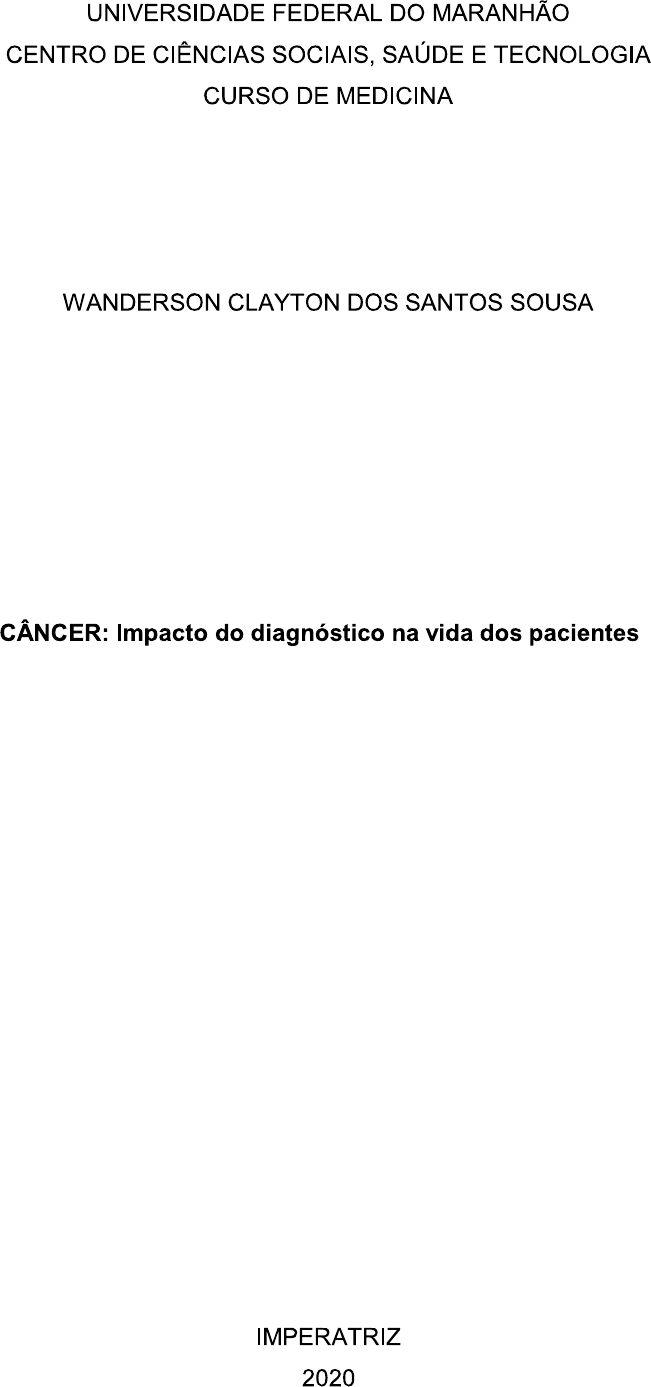 <p>UNIVERSIDADE FEDERAL DO MARANHÃO CENTRO DE CIÊNCIAS SOCIAIS, SAÚDE E TECNOLOGIA CURSO DE MEDICINA WANDERSON CLAYTON DOS SANTOS SOUSA CÂNCER: Impacto do diagnóstico na vida dos pacientes IMPERATRIZ 2020</p><p>WANDERSON CLAYTON DOS SANTOS SOUSA CÂNCER: Impacto do diagnóstico na vida dos pacientes Trabalho de Conclusão de Curso apresentado ao Curso de Medicina da Universidade Federal do Maranhão, Campus Imperatriz, como parte dos requisitos para a obtenção do título de Bacharel em Medicina. Orientadora: Dra. Cecilma Miranda de Sousa IMPERATRIZ 2020</p><p>FICHA CATALOGRÁFICA Ficha gerada por meio do SIGAA/Biblioteca com dados fornecidos pelo(a) autor(a). Núcleo Integrado de Bibliotecas/UFMA Sousa, Wanderson Clayton dos Santos. CÂNCER: Impacto do diagnóstico na vida dos pacientes / Wanderson Clayton dos Santos Sousa. - 22 p. Orientador (a) : Cecilma Miranda de Sousa Teixeira. Curso de Medicina, Universidade Federal do Maranhão, Imperatriz, 2020. 1. Câncer. 2. Impactos do Diagnóstico. 3. Pacientes. I. Teixeira, Cecilma Miranda de Sousa. II. Título.</p><p>WANDERSON CLAYTON DOS SANTOS SOUSA CÂNCER: IMPACTO DO DIAGNÓSTICO NA VIDA DOS PACIENTES. Trabalho de conclusão de curso apresentado ao curso de Medicina da Universidade Federal doMaranhão, Campus Imperatriz, como parte dos requisitos para obtenção do título de Bacharel em Medicina. Orientadora: Dra. Cecilma Miranda de Sousa Teixeira Universidade Federal do Maranhão - Curso de Medicina/CCSST A Banca Julgadora de trabalho de Defesa do Trabalho de Conclusão de Curso, em sessão pública realizada em 07/01/2021, considerou: ( ) Aprovado Reprovado Banca examinadora: Esp. Elaine Rocha Meirelles Rodrigues Universidade Federal do Maranhão - Curso de Medicina/CCSST Jaisane Santos Melo Lobato Universidade Federal do Maranhão - Curso de Medicina/CCSST Imperatriz, MA. 07 de Janeiro de 2021</p><p>SUMÁRIO 1. Introdução 07 2. Metodologia 10 3. Resultados e discussão 11 4. Considerações finais 19 Referências 21 Anexo I: Normas da revista 23 Anexo II: Parecer do Comitê de Ética 34 Apêndice I: Termo de Assentimento Livre e Esclarecido 35 Apêndice II: Termo de Consentimento Livre e Esclarecido 37</p><p>Título: CÂNCER: IMPACTO DO DIAGNÓSTICO NA VIDA DOS PACIENTES Autores: Wanderson Clayton dos Santos Sousa, Silmar Custódio Gonçalves, Carlos Alberto de Sousa Nogueira, Cecilma Miranda de Sousa Teixeira Status: Submetido Revista: Científica Multidisciplinar Núcleo do Conhecimento ISSN: 2448-0959 Fator de Impacto: Qualis B3 DOI:</p><p>RESUMO O câncer corresponde a um conjunto de mais de 100 doenças que têm em comum o crescimento desordenado de células, que invadem tecidos e órgãos. O diagnóstico do câncer exacerba uma série de reações comportamentais, emocionais e psicológicas indesejáveis, tanto nos pacientes como em seus familiares. Nesse contexto, o presente artigo tem como questão norteadora: qual o impacto do câncer na vida do paciente a partir do diagnóstico de uma patologia que estigmatiza e desperta uma diversidade de sentimentos negativos? Dessa forma, a presente pesquisa possui como objetivo principal investigar o impacto do diagnóstico de câncer em pacientes adolescentes, adultos e idosos e sua repercussão no tratamento. Metodologia: estudo descritivo exploratório de abordagem qualitativa com pacientes adolescentes, adultos e idosos com diagnóstico de câncer que estavam em atendimento na Clínica Oncoradium. Parecer do Comitê de ética número 3.643.866. Os dados sociais, socioeconômicos e clínicos foram analisados pelo Microsoft Excel 2010 e os dados qualitativos pelo software DSCsoft. Resultados e discussão: neste estudo, o câncer de colo do útero e de próstata foram os mais prevalentes, assim como a associação de radioterapia e quimioterapia como escolha de tratamento. A expressão mais referida no momento do diagnóstico de câncer foi o "medo". Quanto ao impacto do câncer, evidenciou-se que no adolescente foram mais afetadas a rotina de estudos, as interações sociais e a ânsia por novas descobertas. Para os adultos, a questão financeira foi o pior impacto. Referente aos idosos, a limitação direcionou-se mais às tarefas domésticas. Considerações finais: o impacto do diagnóstico de câncer tem particularidades para cada fase da vida. Agrupou-se a abordagem dessas repercussões evidenciadas por idade para uma visão mais global do problema. Percebeu-se a influência de múltiplos contextos na decisão sobre a aceitação e continuidade do tratamento. Contudo, recomenda-se novos estudos que possam endossar esses achados. E almeja-se estimular condutas mais eficazes na rotina de clínicas e hospitais com vistas à abordagem multidisciplinar e individualizada, levando em consideração as particularidades de cada faixa etária. Palavras-chave: Câncer; Impactos do Diagnóstico; Pacientes.</p><p>7 1. INTRODUÇÃO Câncer é o nome dado a um conjunto de mais de 100 doenças que têm em comum o crescimento desordenado de células, que invadem tecidos e órgãos. Dividindo-se rapidamente, estas células tendem a ser muito agressivas e incontroláveis, determinando a formação de tumores malignos que podem espalhar- se para outras regiões do corpo. Estima-se que no Brasil, para os anos de 2020 a 2022, ocorram 625 mil novos casos de câncer para cada ano. Porém, com o cálculo global corrigido para os sub-registros pode chegar a 685 mil novos casos. Sendo que o perfil predominante no país são os cânceres de próstata, pulmão, mama feminina, cólon e reto, entretanto ainda apresenta altas taxas para os cânceres de colo do útero, estômago e esôfago (INCA, 2019). É uma doença caracterizada por altas taxas de prevalência entre pessoas de ambos os sexos, incluindo todas as faixas etárias e, por essa razão, tem representado uma das principais causas de mortalidade em todo o mundo. Aliado a isso, o fato de ser uma doença crônica com prognóstico muito desfavo