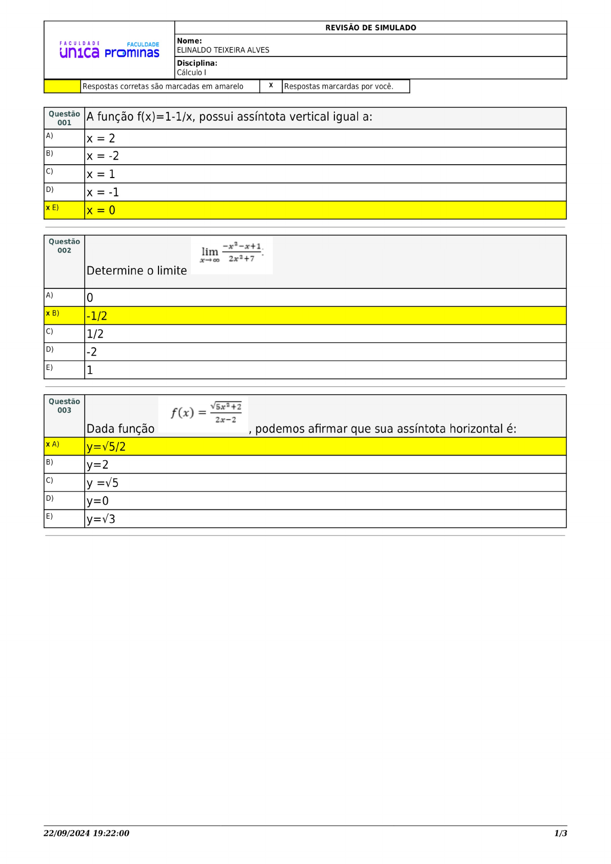 <p>REVISÃO DE SIMULADO FACULDADE Nome: FACULDADE unica prominas ELINALDO TEIXEIRA ALVES Disciplina: Cálculo Respostas corretas são marcadas em amarelo X Respostas marcardas por você. Questão 001 A função possui assíntota vertical igual a: A) X = 2 B) C) D) x E) Questão 002 lim x-00 Determine o limite A) 0 x B) -1/2 C) 1/2 D) -2 E) 1 Questão 003 2x-2 Dada função , podemos afirmar que sua assíntota horizontal é: x A) y=v5/2 B) y=2 C) D) y=0 E) y=v3 22/09/2024 19:22:00 1/3</p><p>Questão Observe a função f(x) = 2 + 2/x e a sua representação gráfica: 004 5 3 Julgue as afirmativas em verdadeiras ou falsas. ( ) A função possui assíntota vertical ( ) A função possui assíntota horizontal y=2 ( ) limite lim ( ) O A sequência correta para as afirmativas acima é: A) x B) C) D) E) Questão Determine o limite da função 4 / (x-3) para X 3 pela esquerda 005 A) 0 x B) -00 C) -3 D) +3 E) 22/09/2024 19:22:00 2/3</p><p>Questão 006 = 2x+2 As afirmações abaixo são sobre a função e sua representação gráfica. y 7 6 5 4 3 2 1 x -2 -1 1 2 3 4 5 6 7 -1 -2 I. A função possui uma assíntota vertical II. O limite lim 2x+2 III. limite lim x A) Apenas a afirmativa está correta. B) Apenas a afirmativa está correta. C) Todas as afirmativas estão erradas. D) Apenas a afirmativa III está correta. E) Todas as afirmativas estão corretas Questão 007 A função = 6/x possui assíntota vertical igual a: A) x=3 B) x=6 C) x=0 D) x=2 E) x=1 Questão Dada função f(x)=(2x+1)/(x-3), = podemos afirmar que sua assíntota horizontal é 008 A) 1 B) -3 2 D) 0 E) -2 22/09/2024 19:22:00 3/3</p>