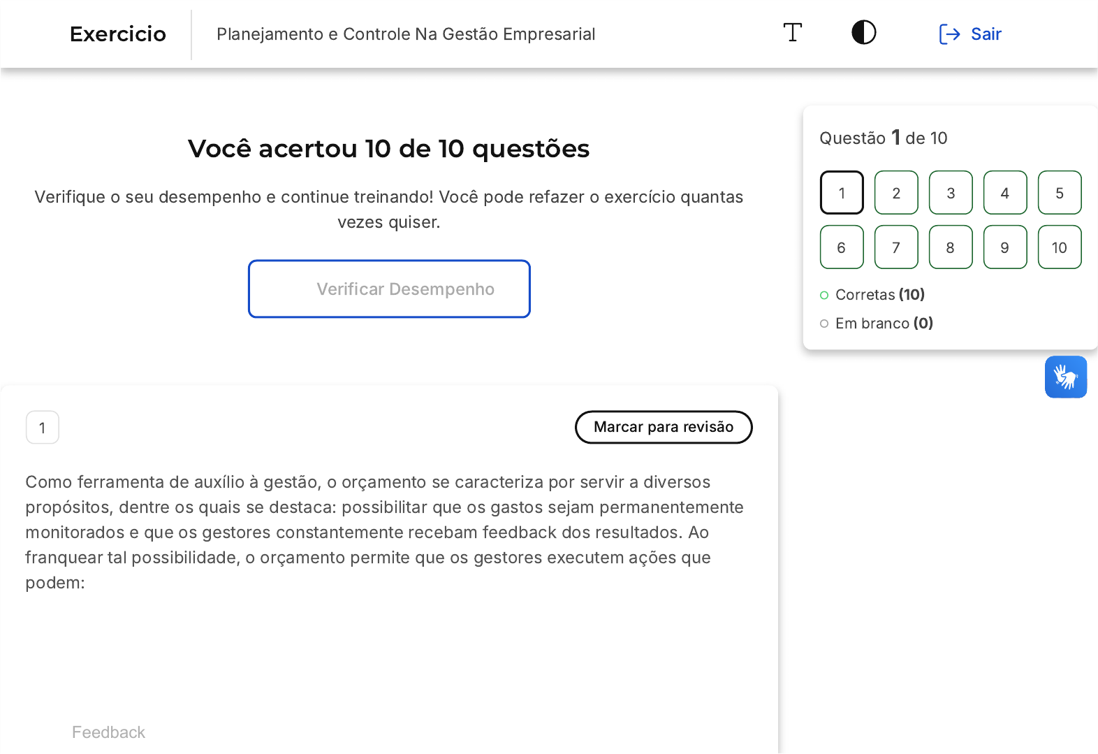 <p>Você acertou 10 de 10 questões</p><p>Verifique o seu desempenho e continue treinando! Você pode refazer o exercício quantas</p><p>vezes quiser.</p><p>Verificar Desempenho</p><p>1 Marcar para revisão</p><p>Como ferramenta de auxílio à gestão, o orçamento se caracteriza por servir a diversos</p><p>propósitos, dentre os quais se destaca: possibilitar que os gastos sejam permanentemente</p><p>monitorados e que os gestores constantemente recebam feedback dos resultados. Ao</p><p>franquear tal possibilidade, o orçamento permite que os gestores executem ações que</p><p>podem:</p><p>Questão 1 de 10</p><p>Corretas �10�</p><p>Em branco �0�</p><p>1 2 3 4 5</p><p>6 7 8 9 10</p><p>Feedback</p><p>Exercicio Planejamento e Controle Na Gestão Empresarial Sair</p><p>A</p><p>B</p><p>C</p><p>D</p><p>E</p><p>Aumentar o fluxo de entrada das receitas.</p><p>Reduzir o fluxo de saída de recursos financeiros.</p><p>Otimizar a alocação de recursos.</p><p>Assegurar um resultado econômico positivo.</p><p>Reduzir os custos diretos de fabricação.</p><p>Resposta correta</p><p>Parabéns, você selecionou a alternativa correta. Confira o gabarito comentado!</p><p>Gabarito Comentado</p><p>O orçamento é uma ferramenta essencial para a gestão financeira de uma empresa.</p><p>Ele permite que os gestores monitorem constantemente os gastos e recebam</p><p>feedback regular sobre os resultados. Isso, por sua vez, possibilita a execução de</p><p>várias ações, incluindo a otimização da alocação de recursos, que é a resposta correta</p><p>para esta questão �Alternativa C�. A otimização da alocação de recursos é um</p><p>processo que envolve a distribuição eficiente dos recursos disponíveis, com o objetivo</p><p>de maximizar a eficiência e a eficácia. Isso pode ser alcançado através do controle</p><p>rigoroso das receitas e despesas, permitindo que a empresa alcance seus objetivos</p><p>A</p><p>B</p><p>C</p><p>D</p><p>E</p><p>financeiros e operacionais. Portanto, o orçamento desempenha um papel crucial na</p><p>facilitação deste processo.</p><p>2 Marcar para revisão</p><p>Uma empresa de manufatura está planejando expandir suas operações, incluindo a adoção</p><p>de automação para aumentar a produção. Este plano busca melhorar a eficiência</p><p>operacional, mantendo a qualidade dos produtos fabricados.</p><p>Qual é o foco principal da adoção de automação pela empresa de manufatura?</p><p>Redução significativa da força de trabalho.</p><p>Aumento da diversidade de produtos oferecidos.</p><p>Melhoria na eficiência da produção.</p><p>Expansão para novos mercados geográficos.</p><p>Redução dos custos de marketing.</p><p>Resposta correta</p><p>Parabéns, você selecionou a alternativa correta. Confira o gabarito comentado!</p><p>Gabarito Comentado</p><p>O foco principal da implementação da automação na empresa de manufatura é a</p><p>melhoria na eficiência da produção. Isso permite que a empresa aumente sua</p><p>capacidade de produção mantendo ou até melhorando a qualidade dos produtos, o</p><p>que é essencial para sustentar o crescimento e a expansão.</p><p>3 Marcar para revisão</p><p>A principal fonte de dados para elaboração do orçamento é a contabilidade, pois sem os</p><p>dados fornecidos pelo setor contábil a área de orçamento teria dificuldade para elaborar</p><p>relatórios com informações essenciais para o efetivo controle da produção. Nessa</p><p>perspectiva de subsidiar os controles produtivos, a contabilidade se apresenta como um</p><p>instrumento indispensável porque</p><p>A</p><p>B</p><p>C</p><p>D</p><p>E</p><p>A contabilidade e o orçamento na verdade compõem o mesmo processo de</p><p>gestão que geralmente é coordenado pelo setor de controladoria das empresas.</p><p>Os princípios contábeis estabelecem que a contabilidade deve dar todo suporte</p><p>que for solicitado pela área de orçamento.</p><p>A contabilidade segue regras rígidas que determinam que devem ser produzidos</p><p>todos os dados necessários à implementação dos controles orçamentários.</p><p>A contabilidade financeira, não precisa seguir regras nem princípios, o que dá a</p><p>flexibilidade necessária para gerar todas as informações que a área de orçamento</p><p>necessita para implantar os controles de produção.</p><p>A metodologia contábil se caracteriza por coletar e armazenar dados relativos aos</p><p>fenômenos que alteram ou possam vir a alterar o patrimônio da empresa,</p><p>inclusive aqueles relativos às previsões e aos custos de produção.</p><p>Resposta correta</p><p>Parabéns, você selecionou a alternativa correta. Confira o gabarito comentado!</p><p>Gabarito Comentado</p><p>A contabilidade é um instrumento indispensável para a elaboração do orçamento e</p><p>controle da produção. Isso se deve à sua metodologia, que consiste em coletar e</p><p>armazenar dados relativos aos fenômenos que alteram ou possam vir a alterar o</p><p>A</p><p>B</p><p>C</p><p>patrimônio da empresa. Esses dados incluem informações sobre previsões e custos de</p><p>produção. Sem essas informações, a área de orçamento teria dificuldades para</p><p>elaborar relatórios com informações essenciais para o controle efetivo da produção.</p><p>Portanto, a alternativa correta é a E, que afirma que a metodologia contábil se</p><p>caracteriza por coletar e armazenar dados relativos aos fenômenos que alteram ou</p><p>possam vir a alterar o patrimônio da empresa, inclusive aqueles relativos às previsões</p><p>e aos custos de produção.</p><p>4 Marcar para revisão</p><p>Em uma empresa de tecnologia, o planejamento estratégico foca na inovação e adaptação</p><p>rápida às mudanças do mercado. Eles implementaram uma nova ferramenta de gestão para</p><p>alinhar as metas de longo prazo com as ações cotidianas, assegurando a participação de</p><p>todos os departamentos.</p><p>Qual é o principal objetivo dessa 