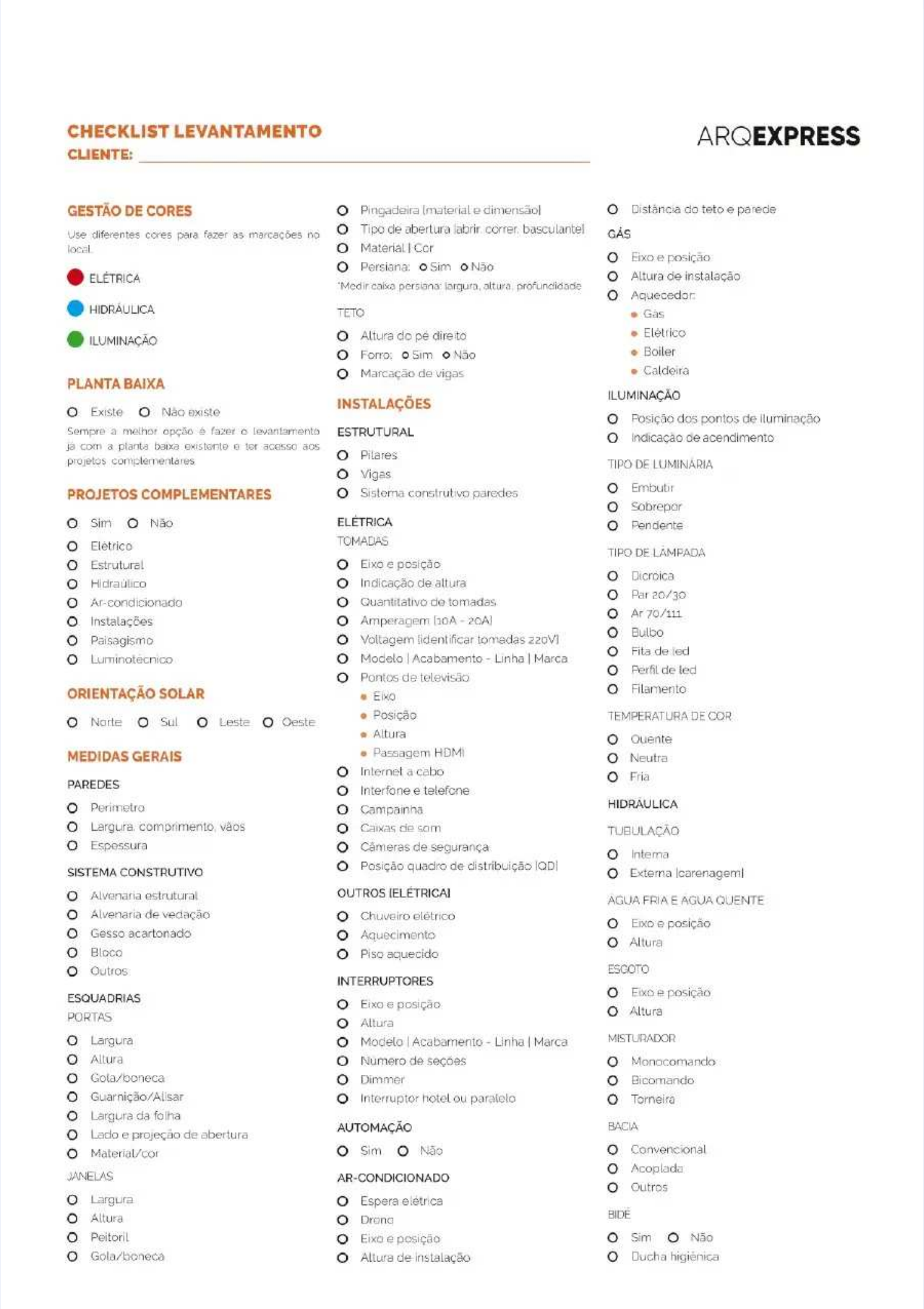 <p>CHECKLIST LEVANTAMENTO ARQEXPRESS CLIENTE: GESTÃO DE CORES Pingadeira (material e do teto e parede Use diferentes cores para fazer as marcações no Tipo de abertura basculantel GÁS Material Cor Eixo e posição Persiana: Sim Não ELÉTRICA Altura de instalação caixa largura, profundidade Aquecedor HIDRÁULICA TETO Gas Altura de direito Elétrico ILUMINAÇÃO Forro: Sim Não Boiler Marcação de vigas Caldeira PLANTA BAIXA INSTALAÇÕES ILUMINAÇÃO Existe Não existe Posição dos pontos de Sempre a opção fazer ESTRUTURAL de acendimento com a planta baixa existente e acesso aos Pilares projetos complementares TIPO DE Vigas PROJETOS COMPLEMENTARES Sistema construtivo paredes Embutir Sobrepar Sim Não Pendente Elétrico TOMADAS TIPO DE LAMPADA Estrutural Eixo e posição Dicroica Hidraúlico Indicação de Par 20/30 Ar-condicionado Quantitativo de tomadas Ar 70/111 Instalações Amperagem 20A] Bulbo Paisagismo Voltagem tomadas 220V] Fita de led Modelo Acabamento Linha Marca Perfil de led Pontos de televisão ORIENTAÇÃO SOLAR Filamento Eixo Posição Norte Sul Leste Oeste TEMPERATURA DE COR Altura Quente MEDIDAS GERAIS Passagem HDMI Neutra Internet a cabo Fria PAREDES Interfone e telefone Perimetro HIDRAULICA Campainha vãos de sam TUBULAÇÃO Espessura Câmeras de segurança SISTEMA CONSTRUTIVO Posição quadro de distribuição Externa Alvenaria estrutural OUTROS AGUA FRIA E AGUA QUENTE Alvenaria de vedação Chuveiro elétrico Eixo e posição Gesso acartonado Aquecimento Altura Bloco Piso aquecido Outros ESCOTO INTERRUPTORES ESQUADRIAS Fixo e posição Eixo e posição PORTAS Altura Altura Largura Modelo Acabamento Linha Marca MISTURADOR Altura Numero de seções Gota/boneca Dimmer Bicomando Guarnição/Alisar Interruptor hotel ou Torneira Largura da folha AUTOMAÇÃO BACIA Lado e projeção de abertura Sim Não Convencional Acoplada JANELAS AR-CONDICIONADO Outros Largura Espera elétrica Altura BIDE Peitoril Eixo e Sim Não Altura de instalação Ducha higiénica</p><p>CHECKLIST LEVANTAMENTO ARQEXPRESS CHUVEIRO Acabamento Cor Tipo de fixação Teto Espessura ESPELHOS Parede RODAPÉ Posição Elétrico Modelo: Largura altura Ducha de apoio Convencional BOX CUBA Embutido Modelo Medidas Invertido Correr Modelo Sem Abrir Embutir Material Acabamento Sanfonado Sobrepor Altura Até teto Semi-encaixe Indicação de Para ducha Piso NICHOS Outros Esculpida Material MÓVEIS SOLTOS LXAXP Material MOVEIS EXISTENTES RALO TETO Largura TIPO DE FORRO Altura Eixo e posição Profundidade Dimensão Laje Material Modelo Madeira Convencional Acabamento Gesso convencional Tecido Linear Gesso acartonado Cor Oculto Pvc Outros Outros Outros Acabamento DETALHES FORRO CHECKLIST INÍCIO DE OBRA CAIXA DE GORDURA Sanca LXAXP INFORMAÇÕES COMPLETAS DO CLIENTE Eixo e posição Cortineiro LXAXP NOME/RAZÃO SOCIAL: Dimensão Outros CNPJ/CPF RODA FORRO E-MAIL MATERIALIZAR Sim Não CEP: PISO Medidas LOGRADOURO: Tipo de piso Material NUMERO/COMPLEMENTO Porcelanato BAIRRO/CIDADE Laminado MOBILIAR INFORMAÇÕES ADM PRÉDIO MÓVEIS FIXOS Horários de acesso Pedra Local para colocação do entulho MARCENARIA Documentação Madeira Indicação de mobiliario existente Liberação de equipe Outros Medidas LXAXP Cadastro responsável de niveis Acabamentos Transição entre Sistema de abertura EMISSÃO DE DOCUMENTO Soleira ART projeto MARMORARIA Mureta Tento ART execução Medidas LXAXP Indicação de inclinação ou caimento Outros Material INÍCIO DE OBRA Sistema de fixação PAREDE Cadastro responsável Cadastro de equipe Tipo de revestimento SERRALHERIA Nome Tinta Medidas LXAXP RG ou CPF Tijolinho Material Empresa Porcelanato Seção espessuras montantes Entrega de documentação Previsão de inicio e fim Madeira Laminado Medidas LXAXP local sempre de 4 Material se todas janetas foram fechadas ao</p>