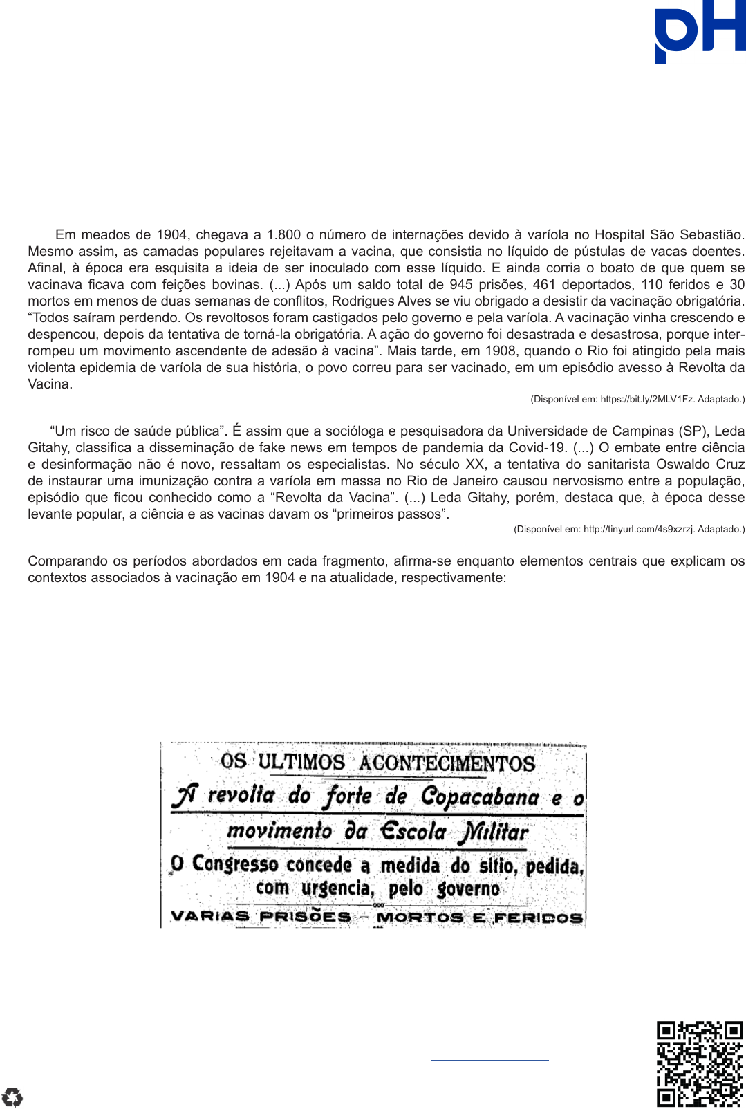 <p>pH 05</p><p>História</p><p>EM2</p><p>Nome: ............................................................................................................................................ Código da Prova: 21105</p><p>Unidade: ......................................................................................................................... RA: ................................................</p><p>Não se esqueça de inserir seu RA e o Código da Prova no seu cartão-resposta.</p><p>O pH só utiliza papéis certificados FSC,</p><p>produzidos a partir de fontes renováveis.</p><p>Precisa de uma ajuda nos pHs da semana? Experimente o Caminho das Pedras!</p><p>Aqui você encontra vídeos que te dão aquele empurrãozinho, ajudando a fazer as questões.</p><p>Acesse a playlist através do código QR ou do link ao lado. https://bit.ly/463YwLk</p><p>01) Leia os textos e responda à questão.</p><p>Em meados de 1904, chegava a 1.800 o número de internações devido à varíola no Hospital São Sebastião.</p><p>Mesmo assim, as camadas populares rejeitavam a vacina, que consistia no líquido de pústulas de vacas doentes.</p><p>Afinal, à época era esquisita a ideia de ser inoculado com esse líquido. E ainda corria o boato de que quem se</p><p>vacinava ficava com feições bovinas. (...) Após um saldo total de 945 prisões, 461 deportados, 110 feridos e 30</p><p>mortos em menos de duas semanas de conflitos, Rodrigues Alves se viu obrigado a desistir da vacinação obrigatória.</p><p>“Todos saíram perdendo. Os revoltosos foram castigados pelo governo e pela varíola. A vacinação vinha crescendo e</p><p>despencou, depois da tentativa de torná-la obrigatória. A ação do governo foi desastrada e desastrosa, porque inter-</p><p>rompeu um movimento ascendente de adesão à vacina”. Mais tarde, em 1908, quando o Rio foi atingido pela mais</p><p>violenta epidemia de varíola de sua história, o povo correu para ser vacinado, em um episódio avesso à Revolta da</p><p>Vacina.</p><p>(Disponível em: https://bit.ly/2MLV1Fz. Adaptado.)</p><p>“Um risco de saúde pública”. É assim que a socióloga e pesquisadora da Universidade de Campinas (SP), Leda</p><p>Gitahy, classifica a disseminação de fake news em tempos de pandemia da Covid-19. (...) O embate entre ciência</p><p>e desinformação não é novo, ressaltam os especialistas. No século XX, a tentativa do sanitarista Oswaldo Cruz</p><p>de instaurar uma imunização contra a varíola em massa no Rio de Janeiro causou nervosismo entre a população,</p><p>episódio que ficou conhecido como a “Revolta da Vacina”. (...) Leda Gitahy, porém, destaca que, à época desse</p><p>levante popular, a ciência e as vacinas davam os “primeiros passos”.</p><p>(Disponível em: http://tinyurl.com/4s9xzrzj. Adaptado.)</p><p>Comparando os períodos abordados em cada fragmento, afirma-se enquanto elementos centrais que explicam os</p><p>contextos associados à vacinação em 1904 e na atualidade, respectivamente:</p><p>a) inexistência de campanha informativa – proliferação de notícias falaciosas.</p><p>b) vários mortos no surto posterior de varíola – superação dos critérios etários.</p><p>c) possiblidade de adquirir feições de animais – fake news desvalorizando a imunização.</p><p>d) descrença nos argumentos fantasiosos – necessidade de ampliar o discurso científico.</p><p>e) impossibilidade de superar a epidemia à época – urgência na vacinação em massa.</p><p>02)</p><p>(Correio da Manhã, 06/07/1922. Disponível em: http://tinyurl.com/3tvah3kj.)</p><p>Assim o jornal carioca Correio da Manhã noticiava as consequências do episódio conhecido como Revolta dos 18 do</p><p>Forte, aquele que deu origem ao chamado “movimento tenentista”.</p><p>Mobile User</p><p>pH 05</p><p>História</p><p>EM2</p><p>2</p><p>Pode-se afirmar que o tenentismo</p><p>a) defendeu um programa de reformas e atuou pela moralidade política, com o fim do voto aberto.</p><p>b) procurou defender os ideais efetivamente pátrios e buscou expulsar os comunistas do Brasil.</p><p>c) expressou a aspiração da baixa oficialidade militar, que buscava superar os castigos físicos.</p><p>d) propôs uma ampla reforma institucional, com a implantação da “política do café com leite”.</p><p>e) representou a única forma de oposição às fraudes da chamada República Oligárquica.</p><p>03) “Na Europa, cada nação tinha, assim, o sentimento de ser vítima de catástrofes e de estar rodeada de inimigos que lhe</p><p>invejavam a prosperidade, o desenvolvimento e mesmo a existência. Assim, o sentimento patriótico tornava-se numa</p><p>das formas da reação coletiva da sociedade em face dos fenômenos originados pela unificação econômica do mundo;</p><p>o movimento das nacionalidades era uma variante desse sentimento que não estava só ligada à opressão étnica e</p><p>religiosa.”</p><p>(Tradução de: FERRO, Marc. La Grande Guerre (1914–1918). Paris: Gallimard, 1990.)</p><p>No texto acima, o historiador Marc Ferro aponta como o nacionalismo era um componente fundamental da política</p><p>europeia no período anterior à Grande Guerra. Esse fenômeno esteve relacionado à eclosão do conflito na medida em</p><p>que as rivalidades nacionais</p><p>a) causaram revoluções internas em países como a Rússia.</p><p>b) levaram as populações a evitarem o início da guerra.</p><p>c) tornaram Inglaterra e Alemanha aliadas no conflito.</p><p>d) foram as causadoras dos choques imperialistas.</p><p>e) impulsionaram os países em direção à guerra.</p><p>04)</p><p>(Disponível em: http://tinyurl.com/mvn9xyhf.)</p><p>O tanque de guerra foi uma das inovações bélicas criadas durante a Primeira Guerra Mundial. Essa invenção foi deci-</p><p>siva para os rumos da guerra, pois era uma arma contra</p><p>a) a guerra de posição, última fase da Primeira Guerra Mundial.</p><p>b) as cavalarias de guerra, principal força bélica durante o 