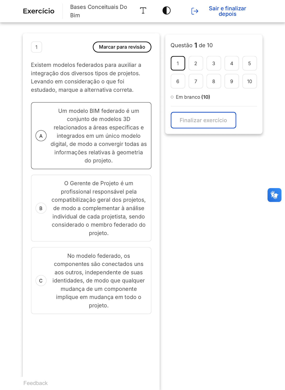<p>A</p><p>B</p><p>C</p><p>1 Marcar para revisão</p><p>Existem modelos federados para auxiliar a</p><p>integração dos diversos tipos de projetos.</p><p>Levando em consideração o que foi</p><p>estudado, marque a alternativa correta.</p><p>Um modelo BIM federado é um</p><p>conjunto de modelos 3D</p><p>relacionados a áreas específicas e</p><p>integrados em um único modelo</p><p>digital, de modo a convergir todas as</p><p>informações relativas à geometria</p><p>do projeto.</p><p>O Gerente de Projeto é um</p><p>profissional responsável pela</p><p>compatibilização geral dos projetos,</p><p>de modo a complementar à análise</p><p>individual de cada projetista, sendo</p><p>considerado o membro federado do</p><p>projeto.</p><p>No modelo federado, os</p><p>componentes são conectados uns</p><p>aos outros, independente de suas</p><p>identidades, de modo que qualquer</p><p>mudança de um componente</p><p>implique em mudança em todo o</p><p>projeto.</p><p>Questão 1 de 10</p><p>Em branco �10�</p><p>Finalizar exercício</p><p>1 2 3 4 5</p><p>6 7 8 9 10</p><p>Feedback</p><p>Exercício</p><p>Bases Conceituais Do</p><p>Bim</p><p>Sair e finalizar</p><p>depois</p><p>D</p><p>E</p><p>O modelo federado é o responsável</p><p>pelo trabalho de interoperabilidade</p><p>dos projetos BIM.</p><p>O fluxo de trabalho no modelo</p><p>federado deve seguir as normas</p><p>definidas pelo PMBOK, permitindo a</p><p>comunicação instantânea entre os</p><p>diferentes membros do projeto,</p><p>agilizando assim, o desenvolvimento</p><p>deste.</p><p>2 Marcar para revisão</p><p>O BIM não é apenas uma representação 3D</p><p>de um projeto. Ele também pode agregar</p><p>diferentes dimensões, conforme a proposta</p><p>de cada empreendimento. Por isso, vamos às</p><p>definições de cada uma dessas dimensões.</p><p>I. 5D: orçamento. No BIM 5D os elementos</p><p>são atrelados aos parâmetros de custo.</p><p>Quando o modelo é organizado, esses dados</p><p>podem ser sincronizados com um banco de</p><p>dados dos custos de construção, mantendo o</p><p>orçamento sempre atualizado.</p><p>II. 7D: operação pós obra. Nesta etapa são</p><p>incluídos ao modelo parâmetros de</p><p>manutenção, garantia e operação do</p><p>empreendimento.</p><p>III. 4D: planejamento do empreendimento.</p><p>Aqui é adicionado o parâmetro tempo</p><p>possibilitando verificar a evolução da obra de</p><p>forma virtual.</p><p>Está correto o que se afirma em:</p><p>A</p><p>B</p><p>C</p><p>D</p><p>E</p><p>I e II, apenas.</p><p>I, apenas.</p><p>I e III, apenas.</p><p>I, II e III, apenas.</p><p>II, apenas.</p><p>3 Marcar para revisão</p><p>O arquivo IFC � Industry Foundation Classes é</p><p>a linguagem internacional dos arquivos</p><p>digitais do BIM. Ele possibilita a comunicação</p><p>entre as diferentes ferramentas, de forma que</p><p>todos os envolvidos na construção possam</p><p>trabalhar no mesmo projeto sem depender de</p><p>um único software. Sobre esse tema, analise</p><p>as afirmativas:</p><p>I. Essa possibilidade também é conhecida</p><p>como openBIM, sinônimo para</p><p>interoperabilidade entre softwares.</p><p>II. Todo software, para ser considerado BIM,</p><p>precisa importar e exportar as informações</p><p>do modelo através de arquivos compatíveis</p><p>.IFC.</p><p>III. Em detalhes, o arquivo IFC é um modelo</p><p>de dados não padronizado que adapta, de</p><p>maneira lógica, um arquivo de uma extensão</p><p>em outro.</p><p>Está correto o que se afirma em:</p><p>A</p><p>B</p><p>C</p><p>D</p><p>E</p><p>I e II, apenas.</p><p>I, apenas.</p><p>I e III, apenas.</p><p>II e III, apenas.</p><p>II, apenas.</p><p>4 Marcar para revisão</p><p>O gerenciamento de projetos relacionado à</p><p>Indústria 4.0 é considerado uma inovação</p><p>que visa aumentar a probabilidade de</p><p>sucesso de um determinado produto ou</p><p>serviço. Em relação aos conceitos de projetos</p><p>4.0, analise as afirmativas:</p><p>I. A Indústria 4.0 é a digitalização de todos os</p><p>dados, ou seja, todos os desenhos técnicos</p><p>antes realizados à mão devem ser</p><p>digitalizados para serem armazenados nas</p><p>nuvens.</p><p>II. A Indústria 4.0 é um conceito que</p><p>representa a automação industrial e a</p><p>integração de diferentes tecnologias com o</p><p>objetivo de promover a digitalização das</p><p>atividades industriais, melhorando os</p><p>processos e aumentando a produtividade.</p><p>III. A ferramenta AutoCad ainda é muito</p><p>utilizada por arquitetos e engenheiros para</p><p>criarem desenhos e projetos, mas já existem</p><p>diversas outras ferramentas mais atualizadas</p><p>e que acompanham os conceitos da indústria</p><p>4.0 no mercado.</p><p>A</p><p>B</p><p>C</p><p>D</p><p>E</p><p>Está correto o que se afirma em:</p><p>I, apenas.</p><p>II, apenas.</p><p>I e II, apenas.</p><p>I e III, apenas.</p><p>II e III, apenas.</p><p>5 Marcar para revisão</p><p>Dificilmente os softwares voltados às</p><p>tecnologias BIM �Building Information</p><p>Modeling) conseguem suportar</p><p>exclusivamente todas as tarefas associadas a</p><p>um projeto e à produção de uma construção.</p><p>Uma das maneiras de resolver isso é o</p><p>intercâmbio consistente de informações entre</p><p>os softwares. Sobre esse contexto, analise as</p><p>afirmativas:</p><p>I. A interoperabilidade entre os programas é</p><p>importante porque mantém fiel a importação</p><p>de dados paramétricos sem perda de</p><p>informações.</p><p>II. Todos os programas de BIM já trabalham</p><p>na mesma plataforma, sendo desnecessário</p><p>qualquer tipo de exportação ou importação</p><p>de arquivos.</p><p>III. Alguns plugins permitem os programas de</p><p>BIM exportar e importar arquivos, porém o</p><p>mais recomendado é que os programas criem</p><p>base de dados comunicáveis a fim de não</p><p>perder informações nestas trocas.</p><p>A</p><p>B</p><p>C</p><p>D</p><p>E</p><p>Está correto o que se afirma