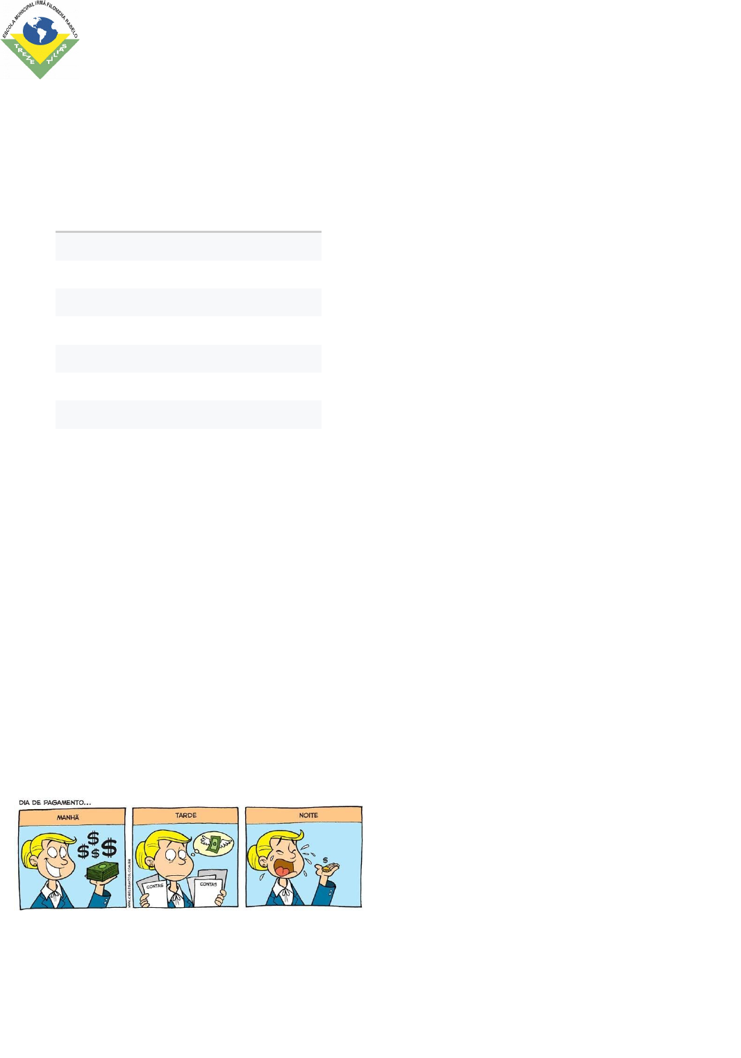 <p>ESCOLA MUNICIPAL IRMÃ FILOMENA RABELO</p><p>TREZE TÍLIAS – SC</p><p>Nota:</p><p>Nome: __________________________________________ 6º ano ____</p><p>Avaliação 2 - Ed. Financeira</p><p>1) A tabela abaixo mostra os gastos que Ana Clara tem em um mês.</p><p>Tipo de despesa</p><p>Valor em reais</p><p>Energia</p><p>R$ 90,00</p><p>Água</p><p>R$ 30,00</p><p>Gás</p><p>R$ 25,00</p><p>Supermercado</p><p>R$ 450,00</p><p>Internet</p><p>R$ 90,00</p><p>Saúde</p><p>R$ 100,00</p><p>Outros</p><p>R$ 120,00</p><p>Supondo que ela receba um salário mínimo no valor de R$ 1 412,00 e que não tenha mais nenhuma despesa além das listadas. Qual o valor máximo que ela poderia pagar pelo aluguel de uma casa?</p><p>a) Ela poderia pagar no máximo R$ 500,00 pelo aluguel.</p><p>b) Ela poderia pagar no máximo R$ 407,00 pelo aluguel.</p><p>c) Ela poderia pagar no máximo R$ 507,00 pelo aluguel.</p><p>d) Ela poderia pagar no máximo R$ 505,00 pelo aluguel.</p><p>2) Esta é uma cena muito comum no dia a dia, aplicando os conhecimentos de educação financeira, qual seria a melhor estratégia para que, de forma definitiva, essa pessoa não gaste todo o salário só em contas e fique sem dinheiro?</p><p>a) Realizando Compras.</p><p>b) Realizando Empréstimos.</p><p>c) Pagando as dívidas que já existem, e realizando planejamento financeiro.</p><p>d) Não pagando as contas.</p><p>e) Adquirindo novos cartões de crédito.</p><p>3) A mãe de João pediu para que ele fosse até o supermercado para comprar a Maionese H de 250g. E sua mãe pediu para que ele realizasse uma pesquisa nos supermercados próximos a sua casa e comprasse onde a maionese fosse mais barata.</p><p>- No SUPERMERCADO B a maionese H de 250g custa R$ 5,19</p><p>- No SUPERMERCADO C a maionese H de 200g custa R$ 4,30</p><p>- O SUPERMERCADO D não vende a maionese H</p><p>- No SUPERMERCADO E a maionese H com 250g custa R$ 4,80</p><p>- No SUPERMERCADO F a maionese H de 500g custa R$ 15,59</p><p>Atendendo ao pedido da sua mãe, João comprou a maionese em qual Supermercado?</p><p>a) SUPERMERCADO B</p><p>b) SUPERMERCADO C</p><p>c) SUPERMERCADO D</p><p>d) SUPERMERCADO E</p><p>e) SUPERMERCADO F</p><p>4) Aline comprou um celular em 6 parcelas de R$ 195,50. Depois de um ano, ele vendeu este celular para um amigo por R$ 1420,00. Ela teve lucro ou prejuízo? Qual foi esse lucro ou prejuízo?</p><p>5) Gabriela comprou um terreno para construir sua casa. Ela deu uma entrada de R$ 21.000,00 e parcelou o restante em 12 de R$ 13.500,00. Depois de dois anos ela conseguiu um emprego em outra cidade e decidiu vender seu terreno. Ela vendeu por R$ 160.000,00. Gabriela lucrou ou teve prejuízo? De quanto?</p><p>6) Fernanda comprou 60 quilos de batata por R$ 1,20 o quilo. Em seu mercado ela vendeu cada quilo por R$ 2,00. Ela teve lucro ou prejuízo? De quanto?</p><p>7) Raul comprou 23 bolsas para revender, ele pagou R$ 60,00 cada. Em sua loja ele vendeu cada bolsa por R$ 76,50. Qual foi o lucro da venda de cada bolsa? Quanto Raul lucrou depois de vender todas as bolsas?</p><p>8) Thaís pretende comprar um celular e tem duas opções: à vista o aparelho custa R$ 2.000,00 e a prazo ele pode ser adquirido em 15 prestações de R$ 150,00. Sabendo que Thaís pretende pagar o mínimo possível, qual opção ela deveria escolher e quanto ela pagaria?</p><p>a) Thaís deveria comprar a prazo. Ela pagaria pelo celular R$ 2.000,00.</p><p>b) Thaís deveria comprar a prazo. Ela pagaria pelo celular R$ 2.300,00.</p><p>c) Thaís deveria comprar à vista. Ela pagaria pelo celular R$ 2.300,00.</p><p>d) Thaís deveria comprar a prazo. Ela pagaria pelo celular R$ 2.250,00.</p><p>e) Thaís deveria comprar à vista. Ela pagaria pelo celular R$ 2.000,00.</p><p>9) Organize o fluxo de caixa pessoal de Maria e informe quais os valores de entradas e saídas encontradas de acordo com os dados abaixo:</p><p>DESCRIÇÃO VALOR</p><p>Cinema R$ 24,00</p><p>Gratificação salarial R$ 200,00</p><p>Alimentação R$ 450,00</p><p>Material escolar R$ 80,00</p><p>Salário R$ 1.200,00</p><p>Lanche R$ 12,00</p><p>Rendimento investimento R$ 230,00</p><p>Sapato R$ 50,00</p><p>a) Entradas: R$ 1.400,00 / Saídas: R$ 846,00</p><p>b) Entradas: R$ 1.430,00 / Saídas: R$ 816,00</p><p>c) Entradas: R$ 1.630,00 / Saídas: R$ 616,00</p><p>d) Entradas: R$ 1.200,00 / Saídas: R$ 1.046,00</p><p>e) Entradas: R$ 1.480,00 / Saídas: R$ 766,00</p><p>10) Responda:</p><p>a) Em geral, a compra à vista é mais recomendada que a compra a prazo. Existem três bons motivos que justificam esse fato, quais são?</p><p>b) Se for bem planejada não existe problema em comprar a prazo. Explique o motivo da compra a prazo precisar ser consciente?</p><p>image1.png</p><p>image2.jpeg</p>