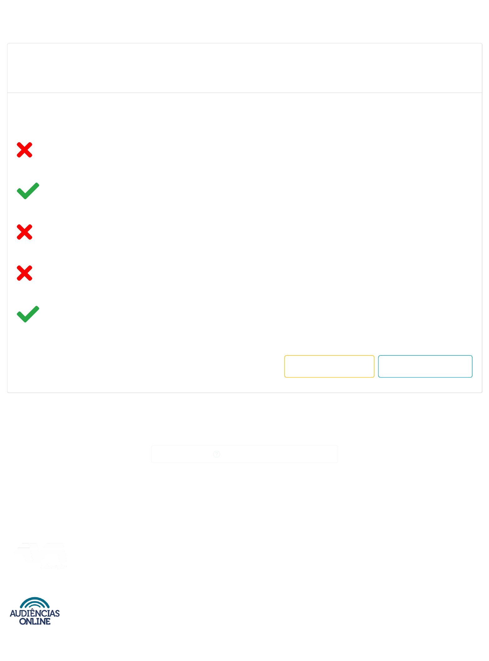 <p>Avaliação de Conhecimento : Justiça Comum Criminal Audiências de Instrução</p><p>Audiência Criminal de Instrução 13</p><p>Audiência Criminal de Instrução 13</p><p>Processo: 0000596-15.2016.8.12</p><p>Tentar novamente Voltar para a home</p><p>Que pena, você não atingiu a pontuação mínima.</p><p>Segundo a magistrada, quantas testemunhas de outra comarca faltavam ser intimadas ?</p><p>1</p><p>Por qual razão a testemunha ausente na audiência não foi ouvida?</p><p>Não foi intimada</p><p>Segundo a magistrada que preside a sessão, quantos acusados já foram ouvidos em juízo?</p><p>Apenas três</p><p>Quantos advogados estavam presentes na audiência?</p><p>2 advogados</p><p>Segundo a magistrada que preside a sessão, após a expedição das cartas precatórias, qual seria o</p><p>próximo ato processual?</p><p>Despacho abrindo vistas às partes para se manifestarem sobre as testemunhas restantes</p><p>contato@avaeducacao.com.br</p><p>CENTRAL DE DUVIDAS</p><p>contato@avaeducacao.com.br</p><p>Central de ajuda</p><p>CONECTE-SE</p><p>Apoio</p><p>©2024 Audiencias Online.</p><p>23/09/2024, 09:46 Audiências online</p><p>https://audienciasonline.com.br/#/avaliacao/5c82cec078b3e14e4721909e 1/2</p><p>mailto:contato@audienciasonline.com.br</p><p>mailto:contato@audienciasonline.com.br</p><p>https://www.facebook.com/joseandradeaudienciasonline/</p><p>https://www.facebook.com/joseandradeaudienciasonline/</p><p>https://www.youtube.com/channel/UC0VPVc46sgqyslyCuEOk0Lw</p><p>https://www.youtube.com/channel/UC0VPVc46sgqyslyCuEOk0Lw</p><p>https://www.instagram.com/joseandradeao/?hl=pt</p><p>https://www.instagram.com/joseandradeao/?hl=pt</p><p>https://t.me/juizjoseandrade</p><p>https://t.me/juizjoseandrade</p><p>Política de Privacidade</p><p>23/09/2024, 09:46 Audiências online</p><p>https://audienciasonline.com.br/#/avaliacao/5c82cec078b3e14e4721909e 2/2</p>