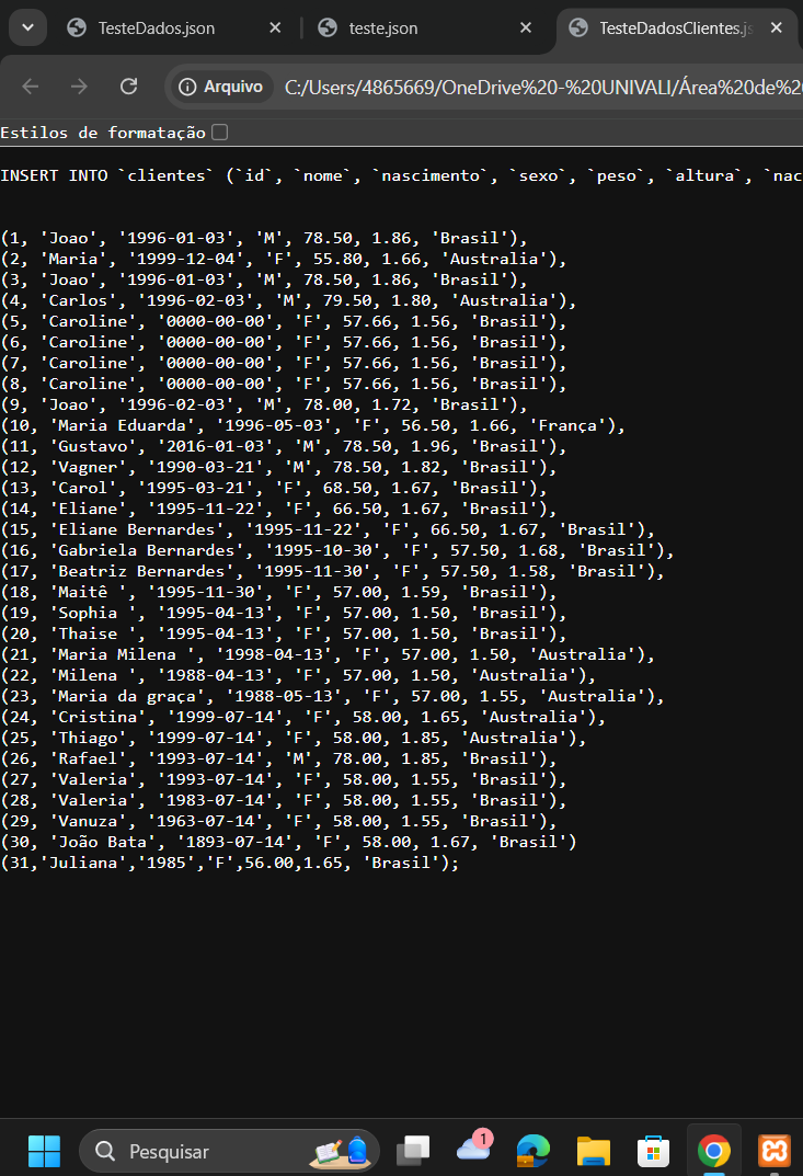 <p>TesteDados.json x 3 teste.json x C Arquivo Estilos de formatação INSERT INTO (`id`, nome`, nascimento , altura`, nac (1, 1996-01-03 'M', 78.50, 1.86, (2, Maria' 1999-12-04 'F' 55.80, 1.66, (3, Joao 1996-01-03 'M', 78.50, 1.86, 'Brasil'), (4, Carlos 1996-02-03' 'M', 79.50, 1.80, Australia') (5, Caroline' 57.66, 1.56, (6, Caroline' 'F', 57.66, 1.56, Brasil'), (7, (8, 'F', 57.66, 1.56, Brasil'), (9, Joao', 1996-02-03', 'M', 78.00, 1.72, 'Brasil'), (10, Maria 1996-05-03', 56.50, 1.66, (11, 'Gustavo' 78.50, 1.96, 'Brasil'), (12, 1990-03-21 78.50, 1.82, Brasil'), (13, 1995-03-21 'F', 68.50, 1.67, Brasil'), (14, 1995-11-22' 'F', 66.50, 1.67, 'Brasil'), (15, 'Eliane 1995-11-22' 'F', 66.50, 1.67, Brasil'), (16, Gabriela 'F', 57.50, 1.68, (17, 1995-11-30' 'F', 57.50, 1.58, 'Brasil'), (18, 1995-11-30 1.59, (19, Sophia 1995-04-13 'F', 57.00 1.50, (20, 'Thaise F', 57.00, 1.50, (21, Maria Milena 1998-04-13', 'F', 57.00, 1.50, Australia'), (22, Milena 'F', 57.00, 1.50, (23, 'Maria da 1988-05-13 'F', 57.00, 1.55, (24, Cristina' 1999-07-14 'F', 58.00, 1.65, Australia'), (25, 1999-07-14 'F', 58.00, 1.85, Australia'), (26, 'Rafael' 1993-07-14 78.00, 1.85, (27, 'Valeria' 1993-07-14 'F', 58.00, 1.55, (28, 1983-07-14 'F', 58.00, 1.55, Brasil'), (29, 'Vanuza 1963-07-14 58.00, 1.55, Brasil'), (30, João Bata 1893-07-14 'F', 58.00, 1.67, Brasil') (31,'Juliana' 1985' F', 56.00,1.65, Pesquisar</p>