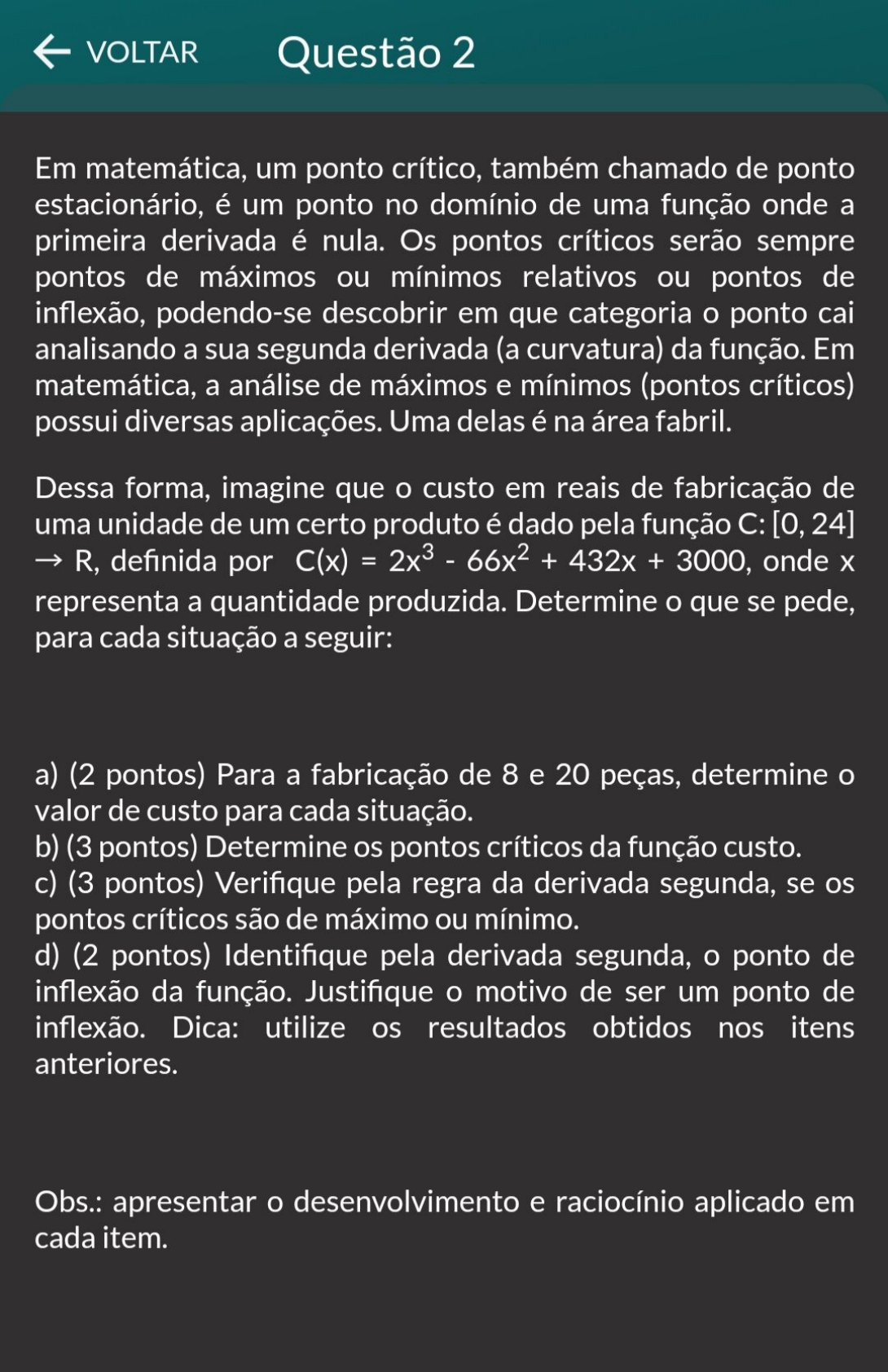 <p>VOLTAR Questão 2 Em matemática, um ponto crítico, também chamado de ponto estacionário, é um ponto no domínio de uma função onde a primeira derivada é nula. Os pontos críticos serão sempre pontos de máximos ou mínimos relativos ou pontos de inflexão, podendo-se descobrir em que categoria O ponto cai analisando a sua segunda derivada (a curvatura) da função. Em matemática, a análise de máximos e mínimos (pontos críticos) possui diversas aplicações. Uma delas é na área fabril. Dessa forma, imagine que O custo em reais de fabricação de uma unidade de um certo produto é dado pela função C: [0, 24] R, definida por C(x) = - 66x2 + 432x + 3000, onde X representa a quantidade produzida. Determine O que se pede, para cada situação a seguir: a) (2 pontos) Para a fabricação de 8 e 20 peças, determine O valor de custo para cada situação. b) (3 pontos) Determine os pontos críticos da função custo. c) (3 pontos) Verifique pela regra da derivada segunda, se os pontos críticos são de máximo ou mínimo. d) (2 pontos) Identifique pela derivada segunda, O ponto de inflexão da função. Justifique O motivo de ser um ponto de inflexão. Dica: utilize os resultados obtidos nos itens anteriores. Obs.: apresentar O desenvolvimento e raciocínio aplicado em cada item.</p><p>Resposta esperada: a) (2 pontos) Qual custo de cada produto, caso a fábrica produza 8 unidades? E se fabricar 20 unidades? Solução: Para determinar estes valores, basta aplicar na função custo. Logo, Para = 8 - + 3000 C(8) = 1024 - 4224 + 3456 + 3000 C(8) = 3256 reais cada unidade. Para X = 20 C(20) = - + 432.20 + 3000 C(20) = 16000 - 26400 + 8640 + 3000 C(20) = 1240 reais cada unidade. b) (3 pontos) Determine os pontos críticos da função custo. Solução: Para determinar os pontos críticos, devemos resolver C'(x) = 6x2 - 132x + 432 = Podemos simplificar a equação por 6, x2 - Aqui acadêmico pode resolver por qualquer método conhecido, porém, é imprescindível que ele encontre os dois pontos críticos em X = 4 e X = 18. c) (3 pontos) Verifique pela regra da derivada segunda, se os pontos críticos são de máximo ou mínimo. Solução: Devemos aplicar os pontos críticos na derivada segunda e observar seu resultado. C"(x) = 12x - 132</p><p>Verificando para X = 8 C"(4) = 12.4 - 132 -84 < Logo, = 4 é pontos de máximo. Verificando para x = 18 C"(8) = 12.18 - 132 = 84 > Logo, = 18 é pontos de mínimo. d) (2 pontos) Identifique pela derivada segunda, ponto de inflexão da função. Justifique motivo de ser um ponto de inflexão, baseado em resultados obtidos nos itens anteriores. Solução: Como já temos resultado da derivada segunda, vamos identificar quanto essa função é zero, C"(x) = 12x - 132 = 12x = 132 11 Como já sabemos dos resultados do item b e item C, podemos afirmar que = 11, é um ponto de inflexão. Minha resposta: O custo de fabricação de 8 peças é de R$3.848,00 custo de fabricação de 20 peças é de R$10.000,00 Os pontos críticos da função custo são X = = 18 sendo X = 4 um ponto de máximo e X = 18</p><p>Anexo: discursivares2.pdf Clique aqui para baixar o arquivo Retorno da correção: Parabéns, acadêmico, sua resposta atingiu os objetivos da questão e você contemplou esperado, demonstrando a competência da análise e síntese do assunto abordado, apresentando excelentes argumentos próprios, com base nos materiais disponibilizados.</p>