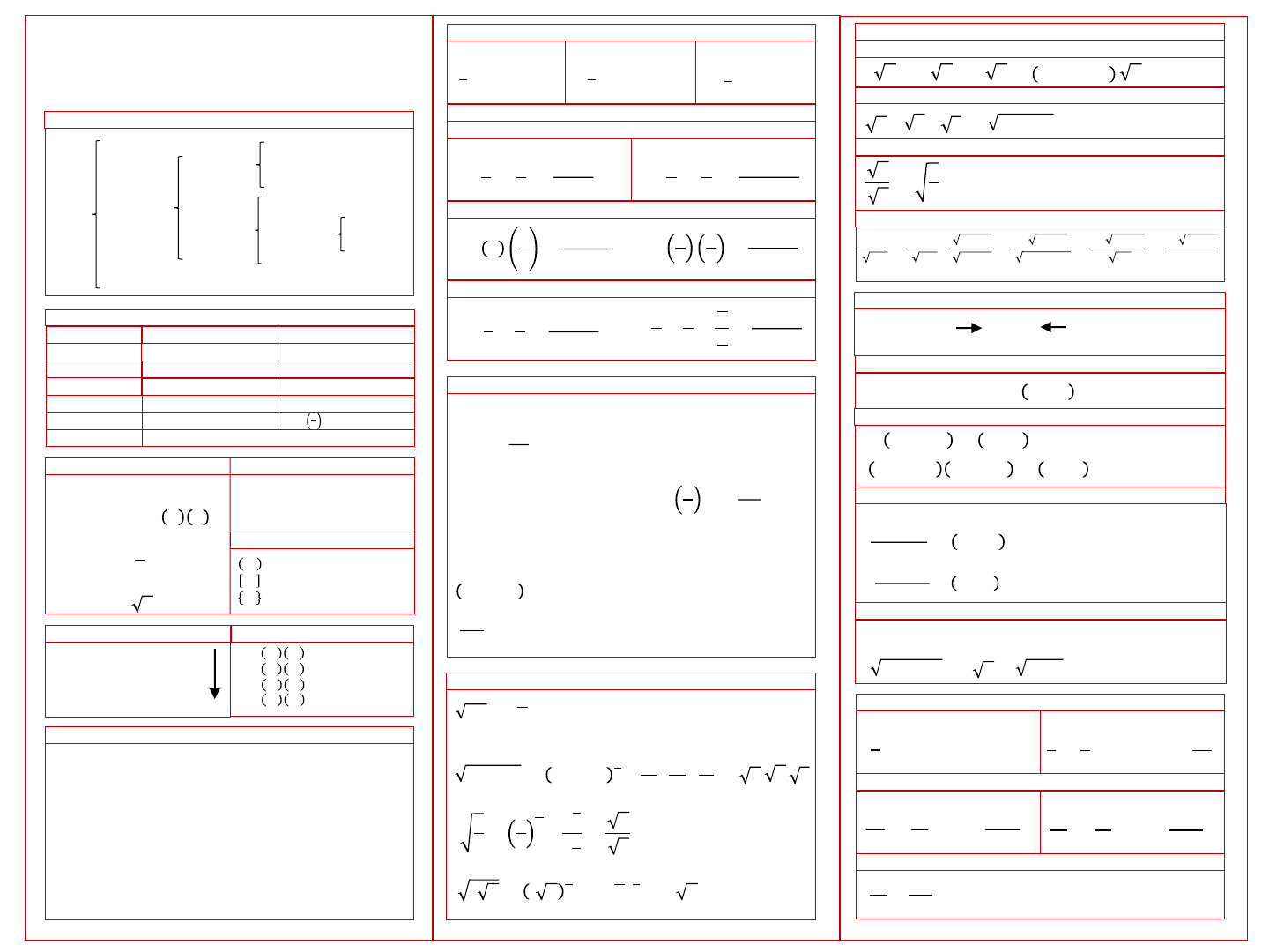 <p>Clasificación de los números reales</p><p>ARITMETICA</p><p>FORMULARIO</p><p>UNIDAD DE APRENDIZAJE</p><p>ALGEBRA</p><p>Propiedades de los números reales</p><p>Signos de agrupación</p><p>Leyes de los signosJerarquía de operaciones</p><p>Cerradura</p><p>Distributiva</p><p>Elemento Neutro</p><p>Inverso</p><p>Propiedad</p><p>Conmutativa</p><p>Asociativa</p><p>a + b ∈ 𝑅</p><p>Suma</p><p>a + b = b + a</p><p>a + (b + c) = (a + b) + c</p><p>a + 0 = a</p><p>a + (-a) = 0</p><p>a (b+c) = ab + ac</p><p>a * b ∈ 𝑅</p><p>Multiplicación</p><p>a * b = b * a</p><p>a (b * c) = (a * b) c</p><p>a * 1 = a</p><p>a * 1</p><p>𝑎</p><p>= 0</p><p>Números Racionales</p><p>+ + = (+)</p><p>− − = (+)</p><p>+ − = (−)</p><p>− + = (−)</p><p>Fracciones Propias Fracciones Impropias Fracciones Mixtas</p><p>Suma – resta</p><p>Multiplicación</p><p>Radicación</p><p>Teoremas</p><p>Signos de agrupación</p><p>Potencia y raíz</p><p>Multiplicación y división</p><p>Suma y resta</p><p>Suma - resta</p><p>Multiplicación</p><p>División</p><p>Racionalización</p><p>Racionales</p><p>(Q)</p><p>Irracionales</p><p>(I)</p><p>Enteros (Z)</p><p>Naturales(N)</p><p>Decimales</p><p>Decimales</p><p>puros</p><p>Signos de operación</p><p>Suma</p><p>Resta</p><p>Multiplicación</p><p>División</p><p>Potencia</p><p>Raíz</p><p>𝑎 + 𝑏</p><p>𝑎 − 𝑏</p><p>𝑎𝑏, 𝑎 𝑏 ,</p><p>𝑎</p><p>𝑏</p><p>, 𝑎/𝑏</p><p>𝑎 ∗ 𝑏, 𝑎 𝑥 𝑏</p><p>𝑎𝑛</p><p>𝑎</p><p>Signos de relación</p><p>𝑎 < 𝑏 "𝑎 𝑚𝑒𝑛𝑜𝑟 𝑞𝑢𝑒 𝑏"</p><p>𝑎 > 𝑏 "𝑎 𝑚𝑎𝑦𝑜𝑟 𝑞𝑢𝑒 𝑏"</p><p>𝑎 = 𝑏 "𝑎 𝑚𝑎𝑦𝑜𝑟 𝑞𝑢𝑒 𝑏"</p><p>Paréntesis</p><p>Corchetes</p><p>Llaves</p><p>Criterios de divisibilidad</p><p>Divisibilidad entre 2</p><p>Divisibilidad entre 3</p><p>Si termina en números pares</p><p>Si la suma de sus dígitos es múltiplo</p><p>de 3</p><p>Si sus últimos dos dígitos son 0 o</p><p>múltiplo de 4</p><p>Si su ultimo digito es 0 o 5</p><p>Si es divisible entre 2 y 3</p><p>Si su ultimo digito es 0</p><p>Divisibilidad entre 4</p><p>Divisibilidad entre 5</p><p>Divisibilidad entre 6</p><p>Divisibilidad entre 10</p><p>𝑎</p><p>𝑏</p><p>𝑐𝑜𝑛 𝑎 < 𝑏</p><p>𝑎</p><p>𝑏</p><p>𝑐𝑜𝑛 𝑎 ≥ 𝑏 𝑎</p><p>𝑏</p><p>𝑐</p><p>𝑐𝑜𝑛 𝑏 < 𝑐</p><p>Con mismo denominador Con diferente denominador</p><p>𝑎</p><p>𝑏</p><p>±</p><p>𝑐</p><p>𝑑</p><p>=</p><p>𝑎𝑑 ± 𝑏𝑐</p><p>𝑏𝑑</p><p>𝑎</p><p>𝑏</p><p>±</p><p>𝑐</p><p>𝑏</p><p>=</p><p>𝑎 ± 𝑐</p><p>𝑏</p><p>División</p><p>𝑎</p><p>𝑏</p><p>𝑐</p><p>𝑑</p><p>=</p><p>(𝑎)(𝑐)</p><p>(𝑏)(𝑑)</p><p>𝑎</p><p>𝑏</p><p>÷</p><p>𝑐</p><p>𝑑</p><p>=</p><p>(𝑎)(𝑑)</p><p>(𝑏)(𝑐)</p><p>𝑎</p><p>𝑏</p><p>÷</p><p>𝑐</p><p>𝑑</p><p>=</p><p>𝑎</p><p>𝑏</p><p>𝑐</p><p>𝑑</p><p>=</p><p>(𝑎)(𝑑)</p><p>(𝑏)(𝑐)</p><p>Potenciación</p><p>𝑎𝑛 = 𝑎 ∙ 𝑎 ∙ 𝑎…𝑑𝑜𝑛𝑑𝑒 𝑎 𝑒𝑠 𝑙𝑎 𝑏𝑎𝑠𝑒 𝑦 𝑛 𝑒𝑙 𝑒𝑥𝑝𝑜𝑛𝑒𝑛𝑡𝑒</p><p>𝑎−𝑛 =</p><p>1</p><p>𝑎𝑛</p><p>𝑎𝑚 ∙ 𝑎𝑛 = 𝑎𝑚+𝑛</p><p>𝑎𝑚</p><p>𝑎𝑛</p><p>= 𝑎𝑚−𝑛</p><p>𝑎</p><p>𝑏</p><p>𝑚</p><p>=</p><p>𝑎𝑚</p><p>𝑏𝑚</p><p>𝑎0 = 1</p><p>(𝑎𝑚)𝑛 = 𝑎𝑚𝑛</p><p>𝑎 ∙ 𝑏 ∙ 𝑐 𝑚 = 𝑎𝑚 ∙ 𝑏𝑚 ∙ 𝑐𝑚</p><p>𝑛</p><p>𝑎𝑚 = 𝑎</p><p>𝑚</p><p>𝑛 ,</p><p>𝑑𝑜𝑛𝑑𝑒 𝑎 𝑒𝑠 𝑙𝑎 𝑏𝑎𝑠𝑒,𝑚 𝑒𝑙 𝑒𝑥𝑝𝑜𝑛𝑒𝑛𝑡𝑒 𝑦</p><p>𝑛 𝑒𝑙 𝑖𝑛𝑑𝑖𝑐𝑒</p><p>𝑛</p><p>𝑎 ∙ 𝑏 ∙ 𝑐 = 𝑎 ∙ 𝑏 ∙ 𝑐</p><p>1</p><p>𝑛=</p><p>1</p><p>𝑎𝑛</p><p>∙</p><p>1</p><p>𝑏𝑛</p><p>∙</p><p>1</p><p>𝑐𝑛</p><p>= 𝑛 𝑎</p><p>𝑛</p><p>𝑏𝑛 𝑐</p><p>𝑛 𝑎</p><p>𝑏</p><p>=</p><p>𝑎</p><p>𝑏</p><p>1</p><p>𝑛</p><p>=</p><p>𝑎</p><p>1</p><p>𝑛</p><p>𝑏</p><p>1</p><p>𝑛</p><p>=</p><p>𝑛 𝑎</p><p>𝑛</p><p>𝑏</p><p>𝑛 𝑚 𝑎 = 𝑚 𝑎</p><p>1</p><p>𝑛 = (𝑎</p><p>1</p><p>𝑚)</p><p>1</p><p>𝑛 = 𝑛𝑚 𝑎</p><p>𝑎</p><p>𝑛</p><p>𝑑 + 𝑏</p><p>𝑛</p><p>𝑑 − 𝑐</p><p>𝑛</p><p>𝑑 = 𝑎 + 𝑏 − 𝑐</p><p>𝑛</p><p>𝑑</p><p>𝑛 𝑎 ∙</p><p>𝑛</p><p>𝑏 ∙ 𝑛 𝑐 =</p><p>𝑛</p><p>𝑎 ∙ 𝑏 ∙ 𝑐</p><p>𝑛 𝑎</p><p>𝑛</p><p>𝑏</p><p>=</p><p>𝑛 𝑎</p><p>𝑏</p><p>𝑐</p><p>𝑛</p><p>𝑎𝑚</p><p>=</p><p>𝑐</p><p>𝑛</p><p>𝑎𝑚</p><p>∙</p><p>𝑛</p><p>𝑎𝑛−𝑚</p><p>𝑛</p><p>𝑎𝑛−𝑚</p><p>=</p><p>𝑐∙</p><p>𝑛</p><p>𝑎𝑛−𝑚</p><p>𝑛</p><p>𝑎𝑚+𝑛−𝑚</p><p>=</p><p>𝑐∙</p><p>𝑛</p><p>𝑎𝑛−𝑚</p><p>𝑛</p><p>𝑎𝑛</p><p>=</p><p>𝑐∙</p><p>𝑛</p><p>𝑎𝑛−𝑚</p><p>𝑎</p><p>𝑏 𝑥 10𝑛</p><p>𝑎</p><p>= 𝑏 ÷ 𝑎 𝑥 10𝑛</p><p>𝑎</p><p>𝑏</p><p>𝑐</p><p>=</p><p>(𝑎)(𝑏)</p><p>(𝑐)</p><p>𝑎</p><p>𝑥</p><p>=</p><p>100</p><p>%</p><p>Enteros Negativos</p><p>Cero</p><p>exactos</p><p>Decimales</p><p>periódicos mixtos</p><p>Operaciones</p><p>Teoremas</p><p>Operaciones con raíces</p><p>Regla de tres simple</p><p>Notación científica</p><p>Suma - resta</p><p>Multiplicación</p><p>División</p><p>Potencias - raíces</p><p>𝑎 𝑥 10𝑛 ± 𝑐 𝑥 10𝑛 = 𝑎 ± 𝑐 𝑥 10𝑛</p><p>Razones y proporciones</p><p>𝑎 𝑏 𝑥 10𝑛 = 𝑎 𝑥 𝑏 𝑥 10𝑛</p><p>(𝑎 𝑥 10𝑚)𝑛= 𝑎𝑛 𝑥 10𝑚𝑥𝑎</p><p>Razón</p><p>Tanto por ciento</p><p>𝑎</p><p>𝑏</p><p>𝑜 𝑎: 𝑏 𝑐𝑜𝑛 𝑏 ≠ 0</p><p>Proporción</p><p>𝑎</p><p>𝑏</p><p>=</p><p>𝑐</p><p>𝑑</p><p>𝑒𝑛𝑡𝑜𝑛𝑐𝑒𝑠 𝑏 =</p><p>𝑎𝑑</p><p>𝑏</p><p>Directa Inversa</p><p>𝑎1</p><p>𝑎2</p><p>=</p><p>𝑏1</p><p>𝑥</p><p>∴ 𝑥 =</p><p>𝑎2