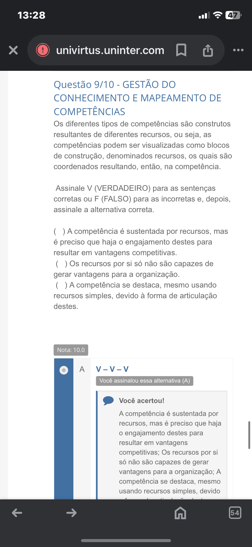 <p>13:28 47 univirtus.uninter.com Questão 9/10 - GESTÃO DO CONHECIMENTO E MAPEAMENTO DE COMPETÊNCIAS Os diferentes tipos de competências são construtos resultantes de diferentes recursos, ou seja, as competências podem ser visualizadas como blocos de construção, denominados recursos, os quais são coordenados resultando, então, na competência. Assinale V (VERDADEIRO) para as sentenças corretas ou F (FALSO) para as incorretas e, depois, assinale a alternativa correta. ( ) A competência é sustentada por recursos, mas é preciso que haja o engajamento destes para resultar em vantagens competitivas. ( ) Os recursos por si só não são capazes de gerar vantagens para a organização. ( ) A competência se destaca, mesmo usando recursos simples, devido à forma de articulação destes. Nota: 10.0 A V-V-V Você assinalou essa alternativa (A) Você acertou! A competência é sustentada por recursos, mas é preciso que haja o engajamento destes para resultar em vantagens competitivas; Os recursos por si só não são capazes de gerar vantagens para a organização; A competência se destaca, mesmo usando recursos simples, devido 54</p>