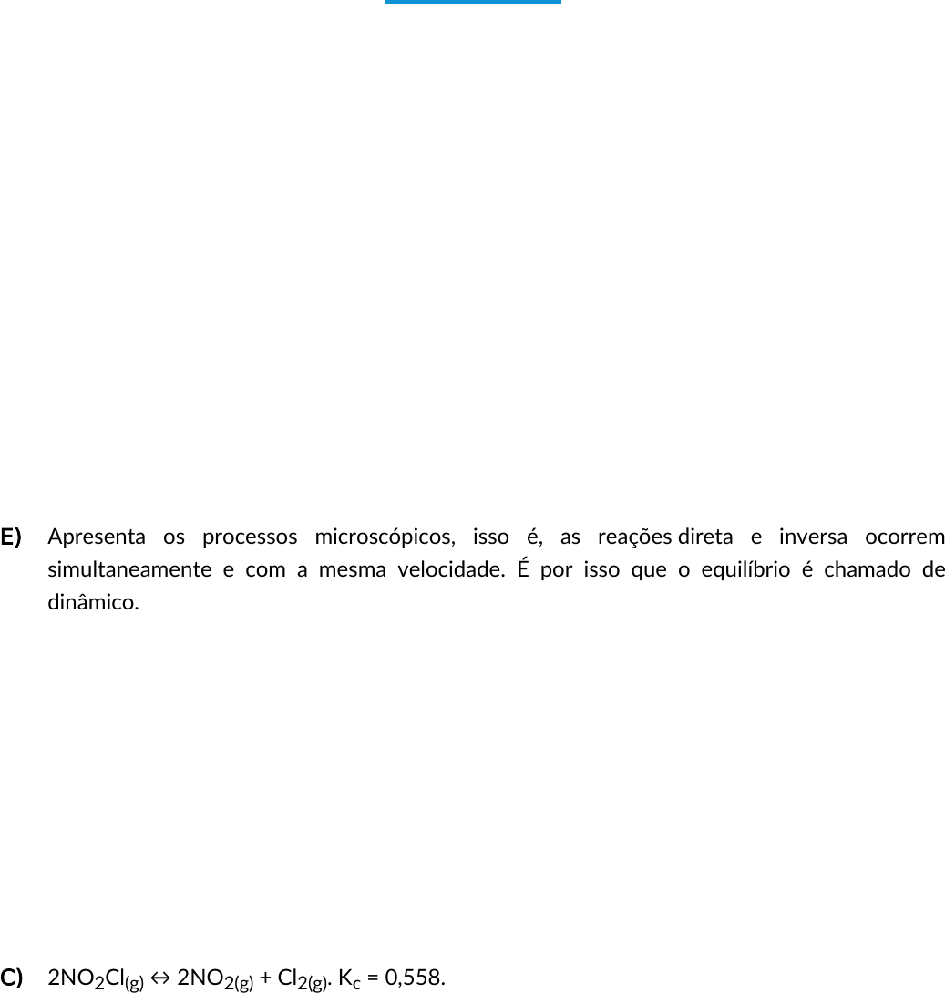 <p>Exercícios</p><p>1) Entre as afirmativas a seguir, qual delas representa a definição correta de um sistema em</p><p>equilíbrio?</p><p>A) O sistema reacional pode estar aberto ou fechado, desde que o equilíbrio seja dinâmico.</p><p>B) Apresenta apenas produtos, pois uma reação em equilíbrio se processa por completo em alta</p><p>velocidade, com deslocamento para a direita, no sentido dos produtos.</p><p>C) Apresenta propriedades microscópicas, isso é, aquelas que podem ser medidas, como</p><p>temperatura, pressão e concentração constante.</p><p>D) O equilíbrio do sistema não se modifica quando for alterada a concentração de algum dos</p><p>produtos ou reagentes, pois o sistema está em equilíbrio e isso nunca se altera.</p><p>E) Apresenta os processos microscópicos, isso é, as reações direta e inversa ocorrem</p><p>simultaneamente e com a mesma velocidade. É por isso que o equilíbrio é chamado de</p><p>dinâmico.</p><p>2) A reação de decomposição do cloreto de nitrilo, NO2Cl(g), está em equilíbrio com o NO2(g) e</p><p>o Cl2(g). Monte a reação química e calcule a constante de equilíbrio, Kc. Para isso, considere</p><p>que as concentrações no equilíbrio são [NO2Cl] = 0,00106 mol, [NO2] = 0,0108 mol e [Cl2] =</p><p>0,00538 mol e não se esqueça de realizar o balanceamento da equação química.</p><p>A) 2NO2Cl(g) → 2NO2(g) + Cl2(g). Kc =4,080.</p><p>B) 2NO2Cl(g) ↔ 2NO2(g) + Cl2(g). Kc = 4,080.</p><p>C) 2NO2Cl(g) ↔ 2NO2(g) + Cl2(g). Kc = 0,558.</p><p>D) NO2Cl(g) ↔ NO2(g) + Cl2(g). Kc = 4,080.</p><p>E) 2NO2Cl(g) → NO2(g) + Cl2(g). Kc = 0,558.</p><p>Em um recipiente de 1 litro são introduzidos 5,0 mol de N2O4 que se transformam em NO2,</p><p>segundo a equação N2O4(g) ↔ 2NO2(g), em temperatura de 30 °C e pressão de 1 atm. Uma</p><p>vez atingindo o equilíbrio, resta no sistema 1,3 mol de reagente. Calcule Kc na temperatura e</p><p>3)</p><p>Edivaldo</p><p>Destacar</p><p>Edivaldo</p><p>Destacar</p><p>pressão desse experimento, utilizando a tabela que faz a contabilidade das quantidades que</p><p>participam do processo:</p><p>N2O4(g) ↔ 2NO2(g)</p><p>Início 5,0 -</p><p>Reagiu 3,7 -</p><p>Formou - 7,4</p><p>No equilíbrio 1,3 7,4</p><p>Fórmulas exercício 3</p><p>A) 42,00.</p><p>B) 3,846.</p><p>C) 0,023.</p><p>D) 5,562.</p><p>E) 0,175.</p><p>4) Utilizando as mesmas condições da reação em equilíbrio do exercício anterior, calcule o grau</p><p>de equilíbrio da reação: N2O4(g) ↔ 2NO2(g), conforme indica a tabela a seguir.</p><p>N2O4(g) ↔ 2NO2(g)</p><p>Início 5,0 -</p><p>Reagiu 3,7 -</p><p>Formou - 7,4</p><p>No equilíbrio 1,3 7,4</p><p>A) 1,35.</p><p>B) 0,17.</p><p>Edivaldo</p><p>Destacar</p><p>C) 0,74.</p><p>D) 0,47.</p><p>E) 0,5.</p><p>5) O gráfico a seguir se refere às concentrações de Br2(g), Cl2(g) e BrCl(g) dentro de um sistema com</p><p>volume e temperatura constante. Inicialmente, dentro do sistema, existe o seguinte equilíbrio:</p><p>Analise o gráfico e responda o que ocorre entre o tempo A e o tempo B?</p><p>A) O equilíbrio químico da reação se desloca para a direita, pois mais Cl2 foi adicionado ao</p><p>sistema e, assim, ele busca um novo equilíbrio.</p><p>B) O equilíbrio químico se desloca para a esquerda, ou seja, para a formação dos reagentes, pois</p><p>a concentração de BrCl foi elevada. Dessa forma, aumentam também as concentrações de</p><p>Br2 e Cl2.</p><p>C) Alguma perturbação ocorreu no sistema, mas não é possível identificar para onde o equilíbrio</p><p>químico se deslocará.</p><p>D) O equilíbrio químico se desloca para a direita, pois o equilíbrio foi deslocado pelo efeito do</p><p>aumento da concentração de Br2.</p><p>Edivaldo</p><p>Destacar</p><p>Edivaldo</p><p>Destacar</p><p>E) O equilíbrio se desloca para a esquerda, a fim de consumir a quantidade de Cl2 adicionada ao</p><p>sistema, restabelecendo o equilíbrio.</p>