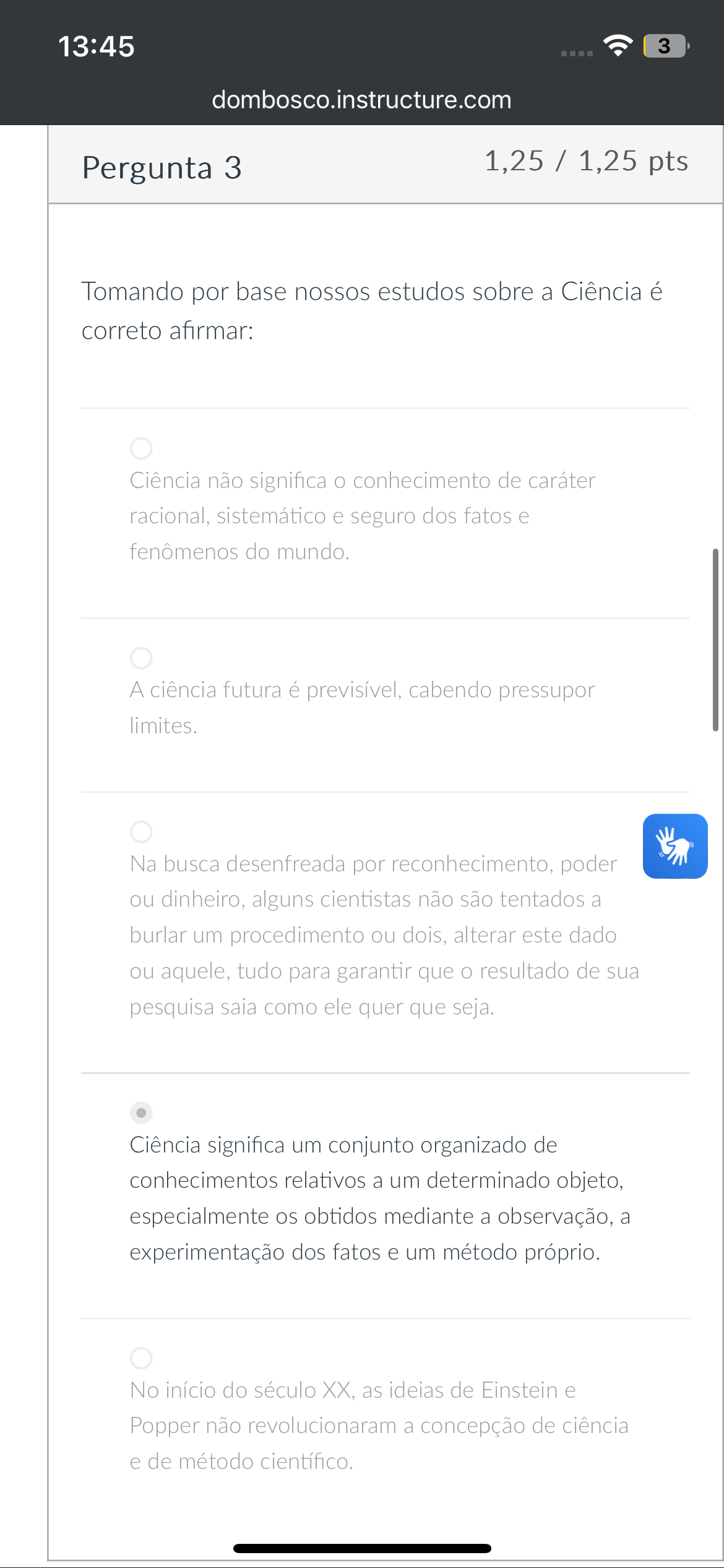 <p>13:45 3 dombosco.instructure.com Pergunta 3 1,25 / 1,25 pts Tomando por base nossos estudos sobre a Ciência é correto afirmar: Ciência não significa conhecimento de caráter racional, sistemático e seguro dos fatos e fenômenos do mundo. A ciência futura é previsível, cabendo pressupor limites. Na busca desenfreada por reconhecimento, poder ou dinheiro, alguns cientistas não são tentados a burlar um procedimento ou dois, alterar este dado ou aquele, tudo para garantir que O resultado de sua pesquisa saia como ele quer que seja. Ciência significa um conjunto organizado de conhecimentos relativos a um determinado objeto, especialmente os obtidos mediante a observação, a experimentação dos fatos e um método próprio. No início do século XX, as ideias de Einstein e Popper não revolucionaram a concepção de ciência e de método científico.</p>