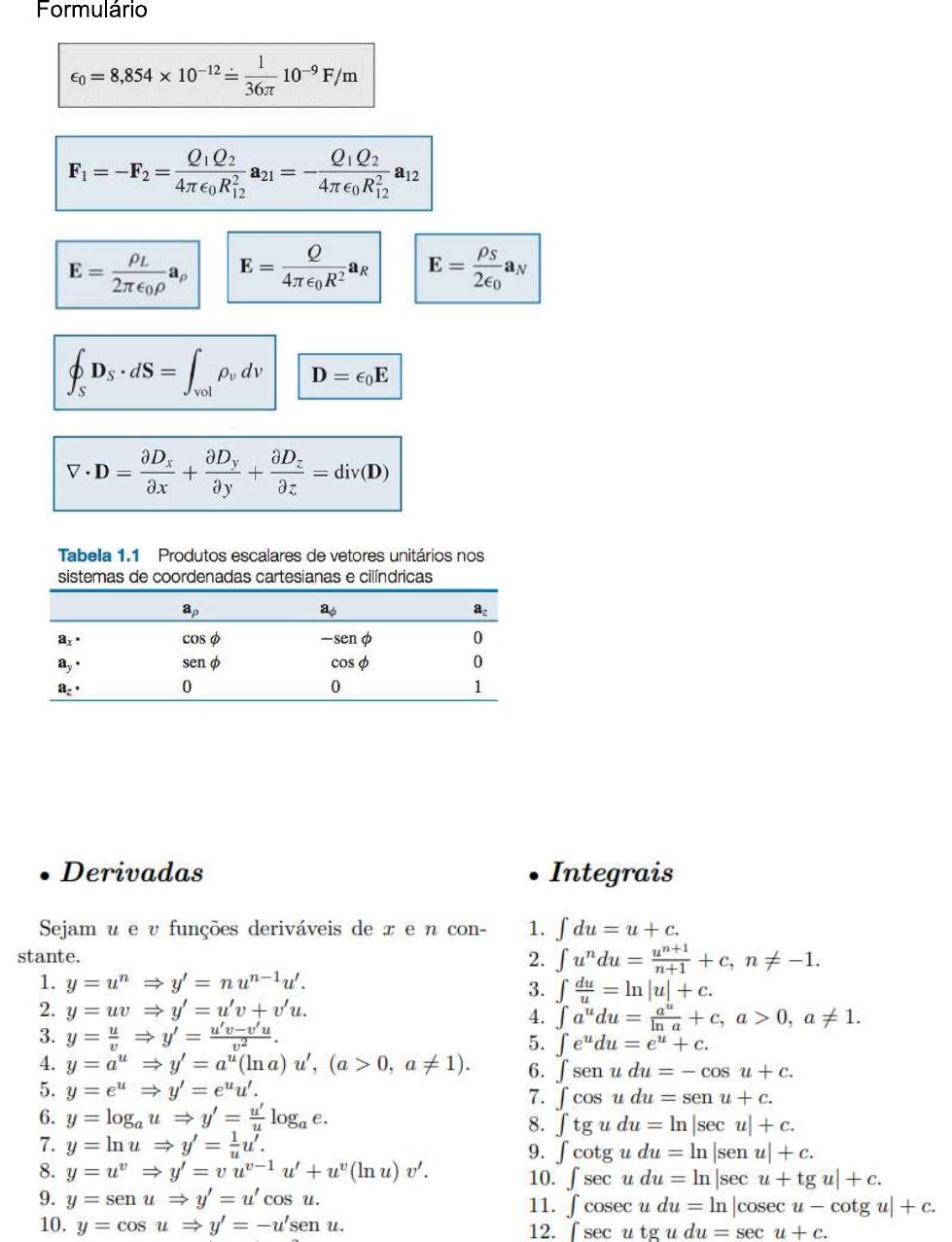 <p>Formulário V.D = Tabela 1.1 Produtos escalares de vetores unitários nos sistemas de coordenadas cartesianas e cilíndricas ap -sen 0 cos 0 0 0 1 Derivadas Integrais Sejam funções deriváveis con- 1. stante. 2. 1. y' 2. 3. 5. y' 6. 5. y' 7. du = 6. y' 8. 9. 8. = 10. sec = 9. = sen 11. cosec 10. = 12. sec =</p>