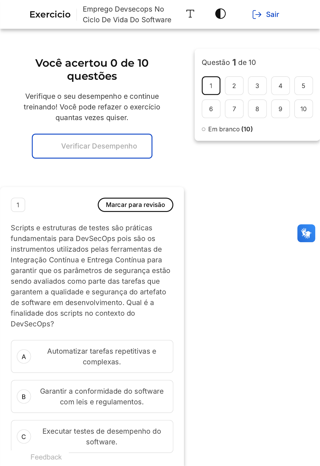 <p>Você acertou 0 de 10</p><p>questões</p><p>Verifique o seu desempenho e continue</p><p>treinando! Você pode refazer o exercício</p><p>quantas vezes quiser.</p><p>Verificar Desempenho</p><p>A</p><p>B</p><p>C</p><p>1 Marcar para revisão</p><p>Scripts e estruturas de testes são práticas</p><p>fundamentais para DevSecOps pois são os</p><p>instrumentos utilizados pelas ferramentas de</p><p>Integração Contínua e Entrega Contínua para</p><p>garantir que os parâmetros de segurança estão</p><p>sendo avaliados como parte das tarefas que</p><p>garantem a qualidade e segurança do artefato</p><p>de software em desenvolvimento. Qual é a</p><p>finalidade dos scripts no contexto do</p><p>DevSecOps?</p><p>Automatizar tarefas repetitivas e</p><p>complexas.</p><p>Garantir a conformidade do software</p><p>com leis e regulamentos.</p><p>Executar testes de desempenho do</p><p>software.</p><p>Questão 1 de 10</p><p>Em branco �10�</p><p>1 2 3 4 5</p><p>6 7 8 9 10</p><p>Feedback</p><p>Exercicio</p><p>Emprego Devsecops No</p><p>Ciclo De Vida Do Software</p><p>Sair</p><p>D</p><p>E</p><p>Integrar ferramentas de segurança ao</p><p>pipeline de entrega contínua.</p><p>Automatizar as tarefas do ciclo de</p><p>vida.</p><p>Questão não respondida</p><p>Opa! A alternativa correta é a letra</p><p>D. Confira o gabarito comentado!</p><p>Gabarito Comentado</p><p>Scripts são importantes no contexto de</p><p>DevSecOps porque eles permitem integrar</p><p>ferramentas de segurança ao pipeline de</p><p>entrega contínua, melhorando a eficiência</p><p>do processo de desenvolvimento e</p><p>segurança do produto de software.</p><p>2 Marcar para revisão</p><p>Em uma conferência recente sobre Segurança</p><p>da Informação, uma discussão se desencadeou</p><p>sobre o conceito de conformidade no campo.</p><p>Isso gerou uma série de definições potenciais.</p><p>Qual é a definição de conformidade no contexto</p><p>de Segurança da Informação?</p><p>A</p><p>B</p><p>C</p><p>D</p><p>E</p><p>Cumprimento das leis, regulamentos e</p><p>padrões estabelecidos para garantir a</p><p>segurança dos dados e informações.</p><p>Gerenciamento e controle da</p><p>segurança da informação em uma</p><p>organização.</p><p>Implementação de práticas</p><p>recomendadas de segurança da</p><p>informação.</p><p>Estabelecimento de processos claros</p><p>e comunicação efetiva dentro da</p><p>organização.</p><p>Estabelecimento de processo de</p><p>desenvolvimento de software.</p><p>Questão não respondida</p><p>Opa! A alternativa correta é a letra</p><p>A. Confira o gabarito comentado!</p><p>Gabarito Comentado</p><p>A conformidade envolve a realização de</p><p>auditorias, monitoramento de riscos e</p><p>implementação de controles internos. Por</p><p>outro lado, a segurança da informação é</p><p>uma abordagem mais abrangente para</p><p>proteger as informações e sistemas de uma</p><p>organização contra ameaças e</p><p>vulnerabilidades. No contexto de</p><p>Segurança da Informação, a conformidade</p><p>inclui cumprimento das leis, regulamentos</p><p>A</p><p>B</p><p>C</p><p>e padrões estabelecidos para garantir a</p><p>segurança dos dados e informações.</p><p>3 Marcar para revisão</p><p>Os Scripts de Teste podem assumir a forma de</p><p>instruções de texto documentadas e</p><p>executadas manualmente ou de instruções que</p><p>podem ser lidas pelo computador para ativar a</p><p>execução automática do teste. Nesse contexto,</p><p>avalie as afirmativas relativas à importância dos</p><p>scripts de teste no desenvolvimento de</p><p>software?</p><p>I. Permitem a automação de tarefas de</p><p>segurança, como análise estática de código.</p><p>II. Garantem que as vulnerabilidades de</p><p>segurança sejam identificadas e corrigidas com</p><p>mais eficiência.</p><p>III. Permitem a execução repetitiva e</p><p>consistente de testes, melhorando a eficácia do</p><p>processo de desenvolvimento e segurança.</p><p>Está correto o que se afirma em:</p><p>I, II e III.</p><p>I e II.</p><p>I e III.</p><p>D</p><p>E</p><p>II e III.</p><p>Somente em III.</p><p>Questão não respondida</p><p>Opa! A alternativa correta é a letra</p><p>A. Confira o gabarito comentado!</p><p>Gabarito Comentado</p><p>Os scripts de teste no desenvolvimento de</p><p>software permitem a automação de tarefas</p><p>de segurança, garantem que as</p><p>vulnerabilidades de segurança sejam</p><p>identificadas e corrigidas com mais</p><p>eficiência, além de permitir a execução</p><p>repetitiva e consistente de testes,</p><p>melhorando a eficácia do processo de</p><p>desenvolvimento e segurança.</p><p>4 Marcar para revisão</p><p>Durante todo o desenvolvimento do conteúdo</p><p>citamos diversos regulamentos e padrões que</p><p>ajudam empresas a se prepararem para lidar</p><p>com os riscos e ameaças de segurança.</p><p>Regulamentos e Padrões de Segurança são</p><p>documentos estabelecidos por governos e</p><p>organizações com o objetivo de definir</p><p>requisitos e diretrizes de segurança que as</p><p>empresas devem seguir, fornecendo um</p><p>conjunto de regras, normas técnicas e práticas</p><p>recomendadas para garantir que as empresas</p><p>implementem medidas de segurança</p><p>adequadas para proteger suas operações,</p><p>sistemas e dados. Qual é a norma que define</p><p>A</p><p>B</p><p>C</p><p>D</p><p>E</p><p>os requisitos para um Sistema de Gestão de</p><p>Segurança da Informação �SGSI�?</p><p>ISO 27001.</p><p>NIST SP 800�53.</p><p>GDPR.</p><p>LGPD.</p><p>SANS Institute.</p><p>Questão não respondida</p><p>Opa! A alternativa correta é a letra</p><p>A. Confira o gabarito comentado!</p><p>Gabarito Comentado</p><p>A norma ISO 27001 é o padrão e a</p><p>referência Internacional para a gestão da</p><p>Segurança da informação.</p><p>5 Marcar para revisão</p><p>Modelagem de ameaças é uma técnica utilizada</p><p>em DevSecOps para identificação e avaliação</p><p>de possívei