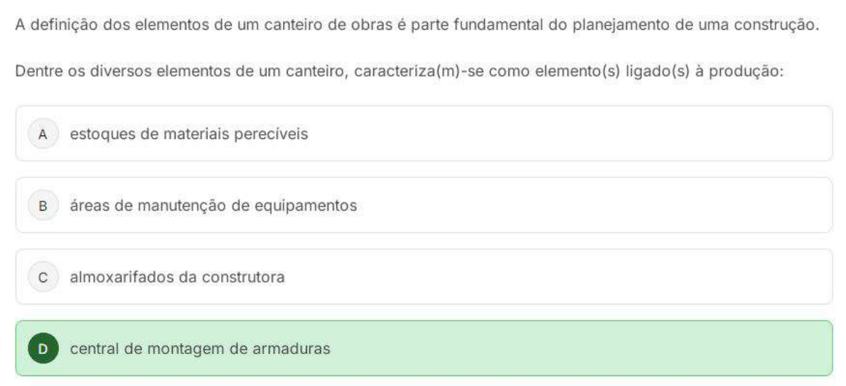 <p>A definição dos elementos de um canteiro de obras é parte fundamental do planejamento de uma construção. Dentre os diversos elementos de um canteiro, caracteriza(m)-se como elemento( (s) ligado(s) à produção: A estoques de materiais perecíveis B áreas de manutenção de equipamentos C almoxarifados da construtora D central de montagem de armaduras</p><p>Todas afirmativas se aplicam a definição de canteiro de obras, EXCETO: A Uma área de trabalho permanente B Uma área de trabalho fixa C Uma área onde se desenvolvem as operações de apoio a execução da obra D Um conjunto de áreas destinadas ao apoio aos trabalhos da construção</p><p>Os canteiros de obra podem ser classificados nos tipos Restrito, Amplo e Longo e estreito. Todas são características dos canteiros do tipo Longo e estreito, EXCETO: A Apresentam espaços significantes para o fluxo de materiais B Possuem poucas vias de acesso ao canteiro C Há dificuldade no fluxo ideal de trabalhadores para a execução da obra D Apresentam complexidade da organização física</p><p>Trabalhos em estrada de ferro ou rodovias, redes de gás e algumas obras de edificações em zonas urbanas, com limitação em uma das dimensões, são exemplos de canteiro de obras do tipo: A parciais. B amplos. C restritos. D longos e estreitos.</p><p>Os canteiros de obra podem ser classificados nos tipos Restrito, Amplo e Longo e estreito. Todas são características dos canteiros do tipo Amplo, EXCETO: A Exigem complexa organização física B Ocupam uma pequena parte do terreno completo C Possuem espaços significantes para fluxo de materiais e pessoas D Tem disponibilidade áreas para estocagem</p><p>Em um canteiro de obras, são elementos ligados à produção e ao apoio administrativo, respectivamente, a: A manutenção de equipamentos e a garagem de veículos pesados B central de concreto e a manutenção de equipamentos C central de concreto e o escritório técnico D sala de treinamento e a central de produção de formas</p><p>Os canteiros de obra podem ser classificados nos tipos Restrito, Amplo e Longo e estreito. Todas são características dos canteiros do tipo Restrito, EXCETO: A o planejamento da logística é facilitado B São encontrados com mais frequência nos grandes centros urbanos C formato costuma ser retangular D A obra é executada dentro do limite do canteiro</p><p>As melhorias das condições e o meio ambiente do trabalho exigem planejamento, conhecimento e qualificação, tendo como meta acidente zero. Todas são características do planejamento, EXCETO: A Atenção dos trabalhadores do que ocorre no espaço físico de trabalho B Análise dos equipamentos e materiais C Avaliação das condições D Elaboração de cronograma</p><p>De acordo com a NR-18, a elaboração e o cumprimento do Programa de Condições e Meio Ambiente de Trabalho na Indústria da Construção PCMA são obrigatórios nos estabelecimentos com: A Vinte funcionários ou mais. B Dez funcionários ou mais. C Quinze funcionários ou D Cinco funcionários ou</p><p>As melhorias das condições e o meio ambiente do trabalho exigem planejamento, conhecimento e qualificação, tendo como meta acidente zero. Todas são características da qualificação, EXCETO: A Otimização da alocação dos recursos disponíveis B Cursos de segurança C Motivação para adoção nova postura no trabalho D Explicação de como funcionam as normas de segurança</p><p>Quem é diretamente responsável pela orientação e controle das medidas preventivas adotadas pelas equipes sob sua supervisão, devendo contribuir para que os trabalhos sejam desenvolvidos sem acidentes? A Mestre de obras B Gerente de contrato C CIPA D Operários</p><p>Assinale a alternativa que apresenta a norma que refere-se a Condições e Meio Ambiente de Trabalho na Indústria da Construção. A NR10. B NR19. C NR16. D NR17. E NR18.</p><p>As melhorias das condições e meio ambiente do trabalho exigem planejamento, conhecimento e qualificação, tendo como meta acidente zero. Todas são características do conhecimento que os trabalhadores devem ter, EXCETO: A Etapas do cronograma da obra B Conhecimento das normas de segurança C Compreensão das técnicas de segurança do trabalho D Atenção ao que acontece no espaço físico de trabalho</p><p>A NR 18 (Condições e Meio Ambiente de Trabalho na Indústria da Construção - PCMAT) estabelece que a área mínima necessária para a utilização de cada chuveiro é de 1,00 m, com altura de 2,20 A m do piso, de acordo com a área de vivência. as escavações com mais de 2,00 m de profundidade devem possuir duas escadas em locais B diferentes, a fim de permitir, em caso de emergência, a saida rápida dos os alojamentos dos canteiros de obra devem ter área de ventilação de, no mínimo, 1/5 da área do C piso. os vasos sanitários devem ser do tipo bacia turca ou sifonados e ligados à rede geral de esgoto ou à D fossa séptica, com interposição de sifões hidráulicos.</p><p>o diagnóstico dos canteiros de obras deve ser a primeira atividade executada em um programa de melhorias, de modo a gerar subsídios para tomada de decisão. diagnóstico demanda a aplicação de uma lista de verificação. A lista de verificação permite a análise qualitativa do canteiro. Todos são aspectos envolvidos nessa análise qualitativa, EXCETO: A Depreciação dos equipamentos B Instalações provisórias C Segurança no trabalho D Sistema de movimentação</p><p>Para que tudo dê certo e a obra comece e termine bem e no prazo, é necessário que haja um gerente no canteiro de obras para administrar todos os detalhes como: A Acompanhamento individual de todos os operários. B Escolha e acompanhamento do uso de materiais, evitando o C Garantia do cumprimento do cronograma, prevenindo atrasos. D Zelar pela execução do projeto como previsto. E Todas as afirmativas estão corretas</p><p>É comum que exista entre os profissionais da construção civil a perc