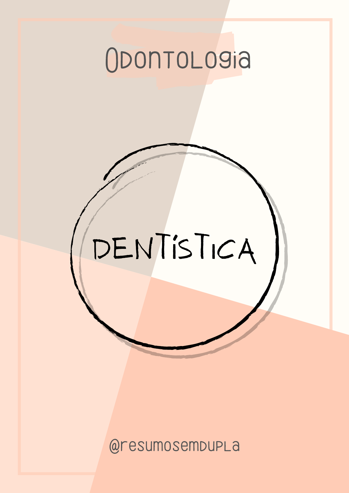 <p>dentística</p><p>Odontologia</p><p>@resumosemdupla</p><p>Dentística</p><p>Dentística é a parte da odontologia restauradora que nos</p><p>convém a restaurar diretamente sobre a boca, ou seja,</p><p>utilizando um material restaurador direto. Atualmente o</p><p>material mais utilizado para restauração direta é a resina</p><p>composta.</p><p>A nomenclatura dental indica de forma simples e precisa o</p><p>elemento dental, suas partes constituintes e seu</p><p>posicionamento na arcada. Existe dois tipos de</p><p>nomenclatura: descritiva e numérica.</p><p>• Nomenclatura descritiva: é definida por característica de</p><p>classe, tipo, conjunto, arcada e posição em relação ao plano</p><p>sagital mediano. As características de classe dividem os</p><p>dentes em quatro grandes grupos: molares, pré-molares,</p><p>caninos e incisivos. As características de tipo, por sua vez,</p><p>diferenciam os dentes dentro de cada uma das classes:</p><p>incisivo central ou lateral; 1º, 2º ou 3º molar; 1º ou 2º pré-</p><p>molar. As características de conjunto dividem os dentes em</p><p>permanentes e decíduos. Para uma descrição precisa do</p><p>dente em questão, ainda devem ser consideradas a arcada</p><p>(superior ou inferior) e a posição do dente em relação ao</p><p>plano sagital mediano (direito ou esquerdo.</p><p>• Nomenclatura numérica: indica de maneira simples, rápida</p><p>e prática, os elementos dentários, utilizando números.</p><p>Nomenclatura das partes constituintes das</p><p>cavidades</p><p>Em linhas gerais, as cavidades são constituídas de paredes</p><p>circundantes, paredes de fundo, ângulos internos diedros,</p><p>ângulos internos triedros e ângulos cavossuperficiais.</p><p>Paredes circundantes: são as paredes que chegam até a</p><p>superfície externa das cavidades, definindo seu contorno.</p><p>Paredes de fundo: são paredes internas que nunca atingem</p><p>a superfície.</p><p>Ângulos diedros: localizados na região de transição entre</p><p>duas paredes.</p><p>Ângulos triedros: são os ângulos localizados na junção de</p><p>três paredes.</p><p>Ângulos cavossuperficiais: localizados na margem entre a</p><p>superfície externa do dente e o preparo.</p><p>Nomenclatura e classificação</p><p>de lesões e das cavidades</p><p>Classificação das cavidades quanto à</p><p>complexidade</p><p>De acordo com o número das faces envolvidas, as cavidades</p><p>podem ser denominadas simples (1 face), composta (2</p><p>faces) ou complexas (3 ou mais faces).</p><p>Quanto à face envolvida</p><p>Quanto à forma e extensão</p><p>Intracoronárias (inlay): cavidades confinadas no interior da</p><p>coroa dentária.</p><p>Extracoronárias parciais (onlay): cavidades que apresentam</p><p>cobertura de cúspide e/ou de outras faces dos dentes.</p><p>Extracoronárias totais: cavidades que apresentam</p><p>cobertura de todas as faces (axial e oclusal ou incisal).</p><p>Quanto à finalidade</p><p>Terapêuticas: nos casos em que a estrutura dentária</p><p>coronária foi acometida parcial ou totalmente por lesão</p><p>cariosa, abrasão, erosão, abfração, fratura ou outras</p><p>lesões.</p><p>Protéticas: cavidades preparadas para servir como</p><p>retentores ou apoio para prótese fixa ou removível.</p><p>Classificação das cavidades</p><p>Essa classificação complementa a classificação de black.</p><p>• Classe I do tipo ponto: pré-molares</p><p>e molares, quando apenas um ponto do sulco</p><p>principal foi atingido pela cárie.</p><p>• Classe I do tipo risco: em pré-</p><p>molares e molares, quando apenas o sulco</p><p>principal foi atingido pela cárie.</p><p>• Classe I do tipo shot gun: molares</p><p>inferiores com minicavidades na superfície</p><p>oclusal.</p><p>• Classe II do tipo slot vertical: pré-molares e</p><p>molares, quando apenas a face proximal</p><p>cariada foi incluída na preparação, com</p><p>acesso pela crista marginal.</p><p>• Classe II do tipo slot horizontal: pré-molares</p><p>e molares, quando apenas a face proximal</p><p>cariada foi incluída na preparação, com</p><p>acesso pelas superfícies vestibular ou</p><p>lingual/palatina.</p><p>• Classe VI: proposta por Howard e Simon,</p><p>inclui as cavidades atípicas preparadas nas bordas</p><p>incisais e nas pontas de cúspides.</p><p>O preparo cavitário é o tratamento biomecânico da estrutura</p><p>dental que objetiva proporcionar melhor desempenho para o</p><p>conjunto dente-material restaurador.</p><p>Sequência Lógica de Black</p><p>Forma de contorno: é a área da superfície do dente que</p><p>deve ser incluída no preparo cavitário uma restauração. Quando</p><p>realizado para amálgama em classe I todo o sulco principal era</p><p>desgastado mesmo que a cárie não abrangesse toda a área, isso</p><p>era chamado de extensão preventiva.</p><p>Forma de resistência: são as características da cavidade</p><p>para que as estruturas remanescentes e a restauração sejam</p><p>capazes de resistir às forças mastigatórias. Dois pontos</p><p>importantes a serem destacados:</p><p> Existem estruturas nos dentes formadas por uma</p><p>quantidade de esmalte muito grande que fazem parte</p><p>da resistência do elemento dental. Por exemplo: cristas</p><p>marginais e pontes de esmalte são áreas de grande</p><p>concentração de esmalte.</p><p> Sabe-se que o esmalte tem vantagem de fornecer</p><p>resistência, porém, todo material que possui grande</p><p>resistência também se torna friável. Ou seja, é a</p><p>capacidade do material de se modificar sem distorção.</p><p>No esmalte a cárie apresenta progressão lenta devido à alta</p><p>mineralização, crescendo de forma maior na dentina por</p><p>apresentar material orgânico.</p><p>Forma de retenção: é a forma dada à cavidade para</p><p>torna-la capaz de reter a restauração e evitar seu</p><p>deslocamento. Essa forma não é mais utilizada, pois atualmente</p><p>se têm adesão. Esse método foi