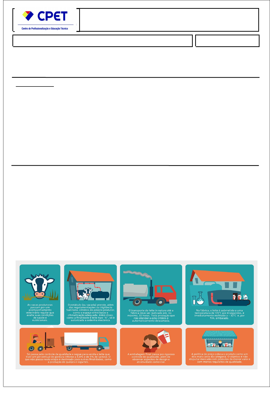 <p>(</p><p>GESTÃO DA QUALIDADE TOTAL</p><p>)</p><p>(</p><p>Data</p><p>:</p><p>) (</p><p>Aluno(a):</p><p>)</p><p>Atividade Prática I</p><p>INSTRUÇÕES:</p><p>· Esta Atividade contém questão de análise totalizando 10 (dez) pontos;</p><p>· Você deve preencher os dados no cabeçalho para sua identificação:</p><p>· Nome / Data de entrega.</p><p>· As respostas devem ser digitadas abaixo de cada pergunta;</p><p>· As respostas não devem ser copiadas de qualquer que seja o lugar e sim expressar o conhecimento/opinião adquirido pelo aluno;</p><p>· Cópias de respostas da internet serão zeradas;</p><p>· Ao terminar salve o arquivo no formato PDF ou DOC;</p><p>· Envio o arquivo pelo sistema no local indicado;</p><p>· As atividades postadas devem estar de acordo com as instruções acima; e</p><p>· Em caso de dúvidas consulte o seu Tutor.</p><p>Atividade Prática I</p><p>Nome:</p><p>CPF:</p><p>Em qualquer processo produtivo, a qualidade tem suas especificidades, conforme as necessidades esperadas pelos clientes. Vamos dar o exemplo do leite, que pode ser avaliado por meio de atributos sensoriais (cor, sabor, textura, viscosidade, aparência), nutricionais (quanto tem de gordura, vitaminas, açúcares, se tem cálcio), higiênicos (níveis de coliformes fecais, limite de toxinas provindas de defensivos agrícolas, micróbios), etc.</p><p>Imagine que você foi contratado por uma empresa para analisar a cadeia produtiva de determinada indústria de leite, visando a confrontar com as abordagens de Garvin. Investigue e encontre possibilidades de implementação. A empresa utiliza muito a qualidade sob a linha de controle. Vendo as abordagens</p><p>centradas em fabricação, observamos critério de fabricação e armazenagem,</p><p>acompanhamento veterinário, tamanho das baias e temperatura, sendo que a ótica</p><p>centrada no produto é contemplada principalmente na abordagem centrada na fabricação</p><p>quanto aos aspectos nutricionais como 5% de gordura, que atende a requisitos com base</p><p>no produto é um pouco com abordagem por clientes, o paladar . Poderiam ser utilizados os</p><p>fundos para ajudar empresas amigas das crianças podendo fazer doações de uma boa</p><p>parte da produção para creche. Mantendo as abordagens transcendentais, como case em</p><p>custos, com base no produto, com base no usuário e com base na fabricação.</p><p>(</p><p>Atividade Prática</p><p>I</p><p>)</p><p>(</p><p>Serviços de Turismo e Viagens - GUI</p><p>)</p><p>image1.jpeg</p><p>image3.jpeg</p><p>image4.jpeg</p><p>image2.png</p>