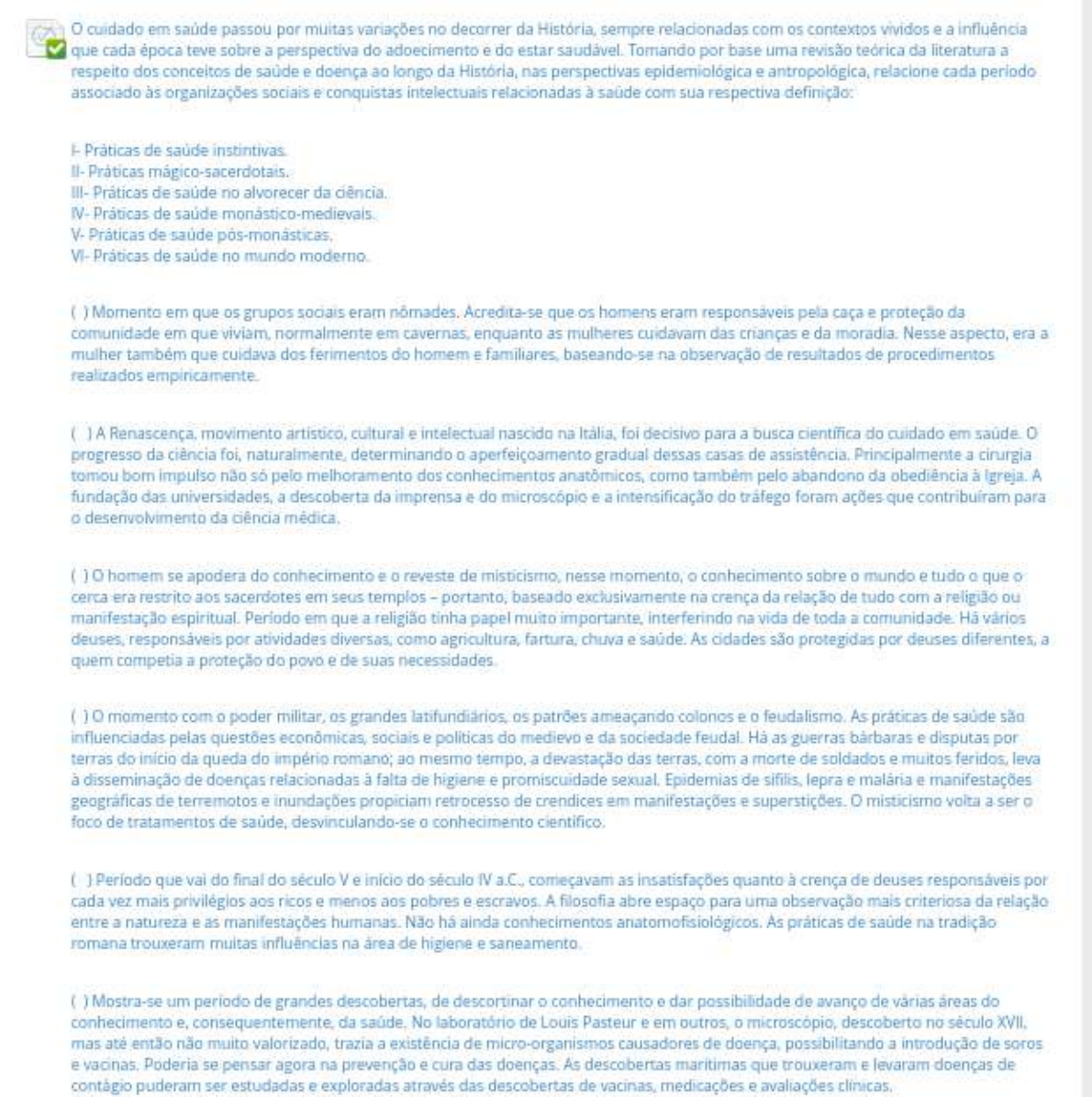 <p>o cuidado em saúde passou por muitas variações no decorrer da História, sempre relacionadas com os contextos vividos e a influência que cada época teve sobre a perspectiva do adoecimento e do estar Tomando por base uma revisão teórica da literatura a respeito dos conceitos de saúde e doença ao longo da História, nas perspectivas epidemiológica e relacione cada associado às organizações sociais e conquistas intelectuais relacionadas à saúde com sua respectiva definição: Práticas de saúde Práticas Práticas de saúde no alvorecer da IV- Práticas de saúde Práticas de saúde Práticas de saúde no mundo Momento em que os grupos sociais eram Acredita-se que os homens eram pela caça e proteção da comunidade em que viviam, normalmente em enquanto as mulheres cuidavam das crianças e da moradia. Nesse aspecto, era a mulher também que cuidava dos ferimentos do homem E familiares, baseando-se na observação de resultados de procedimentos realizados A movimento cultural e intelectual nascido na Itália, foi decisivo para a busca científica do cuidado em o progresso da ciência foi, naturalmente, determinando o aperfeiçoamento gradual dessas casas de Principalmente a cirurgia born impulso não só pelo melhoramento dos conhecimentos anatômicos, como pelo abandono da obediência à A fündação das universidades, a descoberta da imprensa e do e a intensificação do tráfego foram ações que contribuiram para da ciência homem se apodera do conhecimento e o reveste de misticismo, nesse momento, o sabre o mundo e tudo que o cerca era restrito aos sacerdotes em seus templos portanto baseado exclusivamente na crença da relação de com a religião ou manifestação em que a religião tinha papel muito importante, interferindo na vida de toda a comunidade. vários deuses, responsáveis por atividades diversas, como agricultura, fartura, chuya e saúde. As cidades são protegidas por deuses diferentes, a quem competia a proteção do povo e de suas momento com o poder militar, os grandes os patrões ameaçando colonos e o As práticas de saúde são influenciadas pelas questões econômicas, sociais e do medievo e da sociedade feudal. as guerras bárbaras e disputas por terras do da queda do império romano; ao mesmo tempo, a devastação das com a morte de soldados e muitos feridos, leva à disseminação de doenças relacionadas à falta de higiene e promiscuidade sexual. Epidemias de lepra e malária e manifestações geográficas de terremotos e inundações retrocesso de crendices em manifestações e o misticismo volta a ser foco de tratamentos de desvincularido-se conhecimento Período que vai do final do século y e início do século IV as insatisfações quanto à crença de deuses responsáveis por cada vez mais privilégios aos ricos e menos aos pobres e A filosofia abre espaço para uma observação mais criteriosa da relação entre a natureza as Não há ainda conhecimentos As práticas de saúde na tradição romana trouxeram influências na área de higiene e Mostra-se um de grandes descobertas, de descortinar o conhecimento e dar possibilidade de avanço de várias áreas do conhecimento e, da saúde. No laboratório de Louis Pasteur e em outros, o microscópio, descoberto no século XVII. mas até então não muito valorizado, trazia a existência de causadores de doença, possibilitando a introdução de soros e Poderia se pensar agora na prevenção e cura das As descobertas maritimas que trouxeram E levaram doenças de contágio puderam ser estudadas e exploradas através das descobertas de vacinas, medicações e avaliações</p><p>Assinale a alternativa correta, que relaciona a sequência do periodo de saúde com sua definição Resposta a. II. VI Respostas: a. VI b. I, d. da Resposta Correta: A resposta: Comentário: A resposta correta é a apresenta o processo saúde e doença que foi evoluindo se adequando às influencias sociais vigentes, refletindo costumes e ideias de médicos e teóricos de seu Pergunta 2 0,5 em 0,5 pontos Florence Nightingale é considerada a fundadora da Enfermagem Moderna, obteve maior importância durante sua participação como voluntária na Guerra da Crimeia, em Além de quebrar o preconceito que existia em torno da mulher no Exército, ela reorganizou a enfermagem salvou Seu nome era sinónimo de docura, eficiência e heroismo, a visão da sociedade em relação à enfermagem e ao estabelecimento de uma ocupação para a mulher da época, Sobre a História da Enfermagem, assinale a alternativa Resposta d. Selecionada: longo da descrição histórica da evolução das práticas de se aborda a com relatos de cuidadores com habilidades especificas ou conhecimento Geralmente, a figura de realizando cuidados com doentes está relacionada a pessoas com Respostas: a. A Enfermagem uma relação com sociedade permeada pelos conceitos, preconceitos e estereótipos que se estabeleceram na sua trajetória histórica e que influenciam até hoje compreensão de seu significado enquanto profissão da saúde composta de gente que cuida de b. Os saberes e práticas de enfermagem que contribuiram para que Nightingale seja considerada a fundadora da Moderna em todo mundo foram oriundos também de suas educação aristocrática que lhe ter acesso a vários idiomas, à religião e e seus estágios com as de Caridade, onde aprendeu os passos da disciplina na enfermagem (regras, horários religiosidade E divisão do ensino por classes Florence Nigthingale e seus pressupostos, de uma forma ou de outra, sempre estiveram ligados à história da enquanto profissão, considerando que apenas a partir da fundação da Escola de Enfermagem no Hospital Saint Thomas, inicia-se o periodo conhecido como Enfermagem Moderna em todo</p><p>d. longo da descrição histórica da evolução das práticas de se aborda a com relatos de cuidadores com habilidades especificas ou conhecimento técnico. Geralmente, a figura de alguém realizando cuidados com 