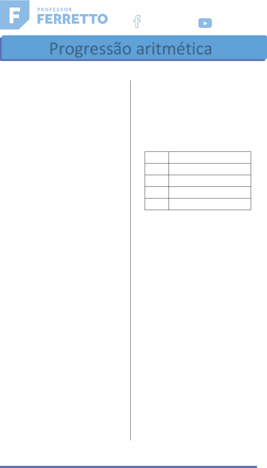 <p>1</p><p>M0218 - (Enem) Um ciclista participará de uma</p><p>competição e treinará alguns dias da seguinte maneira:</p><p>no primeiro dia, pedalará 60 km; no segundo dia, a</p><p>mesma distância do primeiro mais r km; no terceiro</p><p>dia, a mesma distância do segundo mais r km; e, assim,</p><p>sucessivamente, sempre pedalando a mesma distância</p><p>do dia anterior mais r km. No último dia, ele deverá</p><p>percorrer 180 km, completando o treinamento com um</p><p>total de 1560 km.</p><p>A distância r que o ciclista deverá pedalar a mais a cada</p><p>dia, em km, é</p><p>a) 3.</p><p>b) 7.</p><p>c) 10.</p><p>d) 13.</p><p>e) 20.</p><p>M0219 - (Enem) Para um principiante em corrida, foi</p><p>estipulado o seguinte plano de treinamento diário:</p><p>correr 300 metros no primeiro dia e aumentar 200</p><p>metros por dia, a partir do segundo. Para contabilizar</p><p>seu rendimento, ele utilizará um chip, preso ao seu</p><p>tênis, para medir a distância percorrida nos treinos.</p><p>Considere que esse chip armazene, em sua memória,</p><p>no máximo 9,5 km de corrida/caminhada, devendo ser</p><p>colocado no momento do início do treino e descartado</p><p>após esgotar o espaço para reserva de dados.</p><p>Se esse atleta utilizar o chip desde o primeiro dia de</p><p>treinamento, por quantos dias consecutivos esse chip</p><p>poderá armazenar a quilometragem desse plano de</p><p>treino diário?</p><p>a) 7</p><p>b) 8</p><p>c) 9</p><p>d) 12</p><p>e) 13</p><p>M0220 - (Enem) As projeções para a produção de arroz</p><p>no período de 2012–2021, em uma determinada região</p><p>produtora, apontam para uma perspectiva de</p><p>crescimento constante da produção anual. O quadro</p><p>apresenta a quantidade de arroz, em toneladas, que</p><p>será produzida nos primeiros anos desse período, de</p><p>acordo com essa projeção.</p><p>Ano Projeção da produção (t)</p><p>2012 50,25</p><p>2013 51,50</p><p>2014 52,75</p><p>2015 54,00</p><p>A quantidade total de arroz, em toneladas, que deverá</p><p>ser produzida no período de 2012 a 2021 será de</p><p>a) 497,25.</p><p>b) 500,85.</p><p>c) 502,87.</p><p>d) 558,75.</p><p>e) 563,25.</p><p>M0221 - (Enem) O número mensal de passagens de</p><p>uma determinada empresa aérea aumentou no ano</p><p>passado nas seguintes condições: em janeiro foram</p><p>vendidas 33 000 passagens; em fevereiro, 34 500; em</p><p>março, 36 000. Esse padrão de crescimento se mantém</p><p>para os meses subsequentes.</p><p>Quantas passagens foram vendidas por essa empresa</p><p>em julho do ano passado?</p><p>a) 38 000</p><p>b) 40 500</p><p>c) 41 000</p><p>d) 42 000</p><p>e) 48 000</p><p>www.professorferretto.com.br</p><p>ProfessorFerretto ProfessorFerretto</p><p>Progressão aritmética</p><p>2</p><p>M0222 - (Enem) Uma professora realizou uma</p><p>atividade com seus alunos utilizando canudos de</p><p>refrigerante para montar figuras, onde cada lado foi</p><p>representado por um canudo. A quantidade de</p><p>canudos (C) de cada figura depende da quantidade de</p><p>quadrados (Q) que formam cada figura. A estrutura de</p><p>formação das figuras está representada a seguir.</p><p>Que expressão fornece a quantidade de canudos em</p><p>função da quantidade de quadrados de cada figura?</p><p>a) C = 4Q</p><p>b) C = 3Q + 1</p><p>c) C = 4Q – 1</p><p>d) C = Q + 3</p><p>e) C = 4Q – 2</p><p>M0223 - (Enem) O trabalho em empresas exige dos</p><p>profissionais conhecimentos de diferentes áreas. Na</p><p>semana passada, todos os funcionários de uma dessas</p><p>empresas estavam envolvidos na tarefa de determinar</p><p>a quantidade de estrelas que seriam utilizadas na</p><p>confecção de um painel de Natal.</p><p>Um dos funcionários apresentou um esboço das</p><p>primeiras cinco linhas do painel, que terá, no total, 150</p><p>linhas.</p><p>Após avaliar o esboço, cada um dos funcionários</p><p>esboçou sua resposta:</p><p>Funcionário I: aproximadamente 200 estrelas.</p><p>Funcionário II: aproximadamente 6 000 estrelas.</p><p>Funcionário III: aproximadamente 12 000 estrelas.</p><p>Funcionário IV: aproximadamente 22 500 estrelas.</p><p>Funcionário V: aproximadamente 22 800 estrelas.</p><p>Qual funcionário apresentou um resultado mais</p><p>próximo da quantidade de estrelas necessária?</p><p>a) I</p><p>b) II</p><p>c) III</p><p>d) IV</p><p>e) V</p><p>M0224 - (Enem) Nos últimos anos, a corrida de rua</p><p>cresce no Brasil. Nunca se falou tanto no assunto como</p><p>hoje, e a quantidade de adeptos aumenta</p><p>progressivamente, afinal, correr traz inúmeros</p><p>benefícios para a saúde física e mental, além de ser um</p><p>esporte que não exige um alto investimento financeiro.</p><p>Um corredor estipulou um plano de treinamento</p><p>diário, correndo 3 quilômetros no primeiro dia e</p><p>aumentando 500 metros por dia, a partir do segundo.</p><p>Contudo, seu médico cardiologista autorizou essa</p><p>atividade até que o corredor atingisse, no máximo, 10</p><p>km de corrida em um mesmo dia de treino. Se o atleta</p><p>cumprir a recomendação médica e praticar o</p><p>treinamento estipulado corretamente em dias</p><p>consecutivos, pode-se afirmar que esse planejamento</p><p>de treino só poderá ser executado em, exatamente,</p><p>a) 12 dias.</p><p>b) 13 dias.</p><p>c) 14 dias.</p><p>d) 15 dias.</p><p>e) 16 dias.</p><p>M0225 - (Uerj) Uma farmácia recebeu 15 frascos de um</p><p>remédio. De acordo com os rótulos, cada frasco</p><p>contém 200 comprimidos, e cada comprimido tem</p><p>massa igual a 20 mg.</p><p>Admita que um dos frascos contenha a quantidade</p><p>indicada de comprimidos, mas que cada um destes</p><p>comprimidos tenha 30 mg. Para identificar esse frasco,</p><p>cujo rótulo está errado, são utilizados os seguintes</p><p>procedimentos:</p><p>- numeram-se os frascos de 1 a 15;</p><p>- retira-se de cada frasco a quantidade de comprimidos</p><p>correspondente à sua numeração;</p><p>- verifica-se, usando uma balança, que a ma