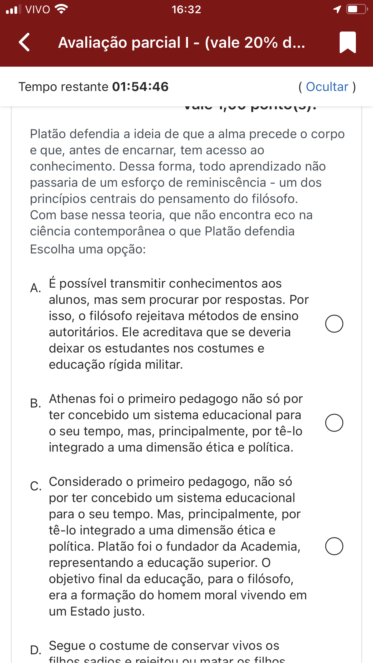 <p>VIVO 16:32 Avaliação parcial - (vale 20% d... Tempo restante 01:54:46 ( Ocultar) Platão defendia a ideia de que a alma precede o corpo e que, antes de encarnar, tem acesso ao conhecimento. Dessa forma, todo aprendizado não passaria de um esforço de reminiscência - um dos princípios centrais do pensamento do filósofo. Com base nessa teoria, que não encontra eco na ciência contemporânea o que Platão defendia Escolha uma opção: A. É possível transmitir conhecimentos aos alunos, mas sem procurar por respostas. Por isso, o filósofo rejeitava métodos de ensino autoritários. Ele acreditava que se deveria deixar os estudantes nos costumes e educação rígida militar. B. Athenas foi o primeiro pedagogo não só por ter concebido um sistema educacional para o seu tempo, mas, principalmente, por tê-lo integrado a uma dimensão ética e política. C. Considerado o primeiro pedagogo, não só por ter concebido um sistema educacional para o seu tempo. Mas, principalmente, por tê-lo integrado a uma dimensão ética e política. Platão foi o fundador da Academia, representando a educação superior. O objetivo final da educação, para o filósofo, era a formação do homem moral vivendo em um Estado justo. D. Segue o costume de conservar vivos os</p>