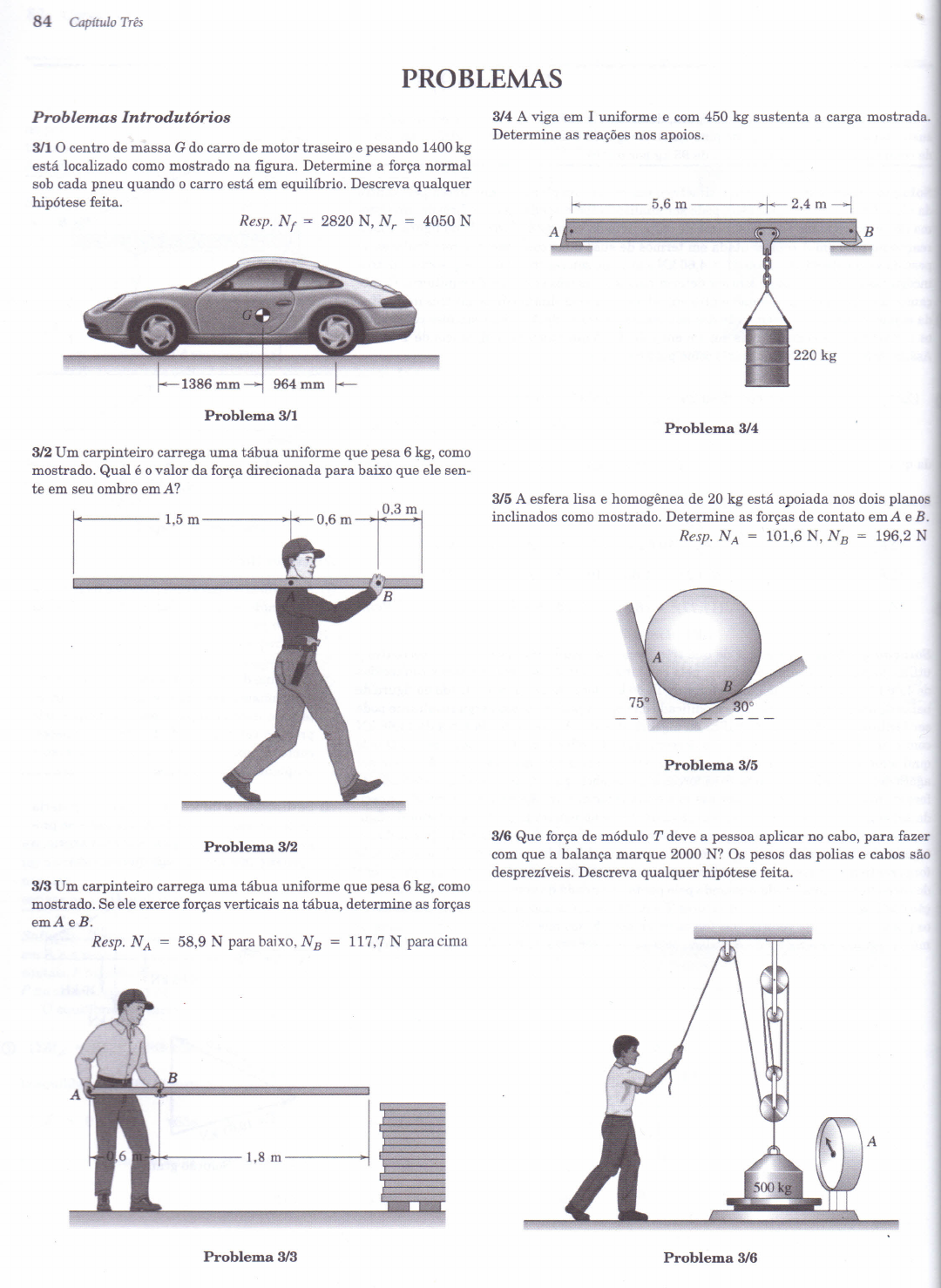 <p>84 Capítulo Três</p><p>Problemas Introdutórios</p><p>PROBLEMAS</p><p>3/10 centro de massa G do carro de motor traseiro e pesando 1400 kg</p><p>está localizado como mostrado na figura. Determine a força normal</p><p>sob cada pneu quando o carro está em equilíbrio. Descreva qualquer</p><p>hipótese feita.</p><p>Resp. Nr = 2820 N, n, = 4050 N</p><p>Problema 3/1</p><p>3/2 Um carpinteiro carrega uma tábua uniforme que pesa 6 kg, como</p><p>mostrado. Qual é o valor da força direcionada para baixo que ele sen-</p><p>te em seu ombro emA?</p><p>0.6mil</p><p>Problema 3/2</p><p>3/3 Um carpinteiro carrega uma tábua uniforme que pesa 6 kg, como</p><p>mostrado. Se ele exerce forças verticais na tábua, determine as forças</p><p>emAeB.</p><p>Resp. NA = 58,9 N para baixo.Jvj, = 117,7 N para cima</p><p>B</p><p>~-1.8m---J</p><p>Problema 3/3</p><p>3/4 A viga em I uniforme e com 450 kg sustenta a carga mostrada</p><p>Determine as reações nos apoios.</p><p>f.<-1'---5,6m---"""f.<-I'-2,4m-1</p><p>Problema 3/4</p><p>3/5 A esfera lisa e homogênea de 20 kg está apoiada nos dois planos</p><p>inclinados como mostrado. Determine as forças de contato emA e B.</p><p>Resp. NA = 101,6 N, NB = 196,2 N</p><p>Problema 3/5</p><p>3/6 Que força de módulo T deve a pessoa aplicar no cabo, para fazer</p><p>com que a balança marque 2000 N? Os pesos das polias e cabos são</p><p>desprezíveis. Descreva qualquer hipótese feita.</p><p>Problema 3/6</p><p>317Que força horizontal P deve um trabalhador exercer na corda para</p><p>posicionar o caixote de 50 kg sobre o trailer?</p><p>Resp. P = 126,6 N</p><p>1</p><p>4m~---1</p><p>1m</p><p>Problema 3/7</p><p>o tambor de 275 kg está sendo erguido por um dispositivo que está</p><p>80 às suas extremidades. Determine a força trativa T em cada uma</p><p>barras de comprimento igual, que formam os dois elementos em</p><p>.arma de U do dispositivo.</p><p>25~-LA</p><p>Problema 3/8</p><p>Que fração n do.peso W de um avião ajato corresponde ao empuxo</p><p>tivo (o empuxo na exaustão da turbina T menos a resistência do ar</p><p>para que o avião suba com velocidade constante fazendo um ãngu-</p><p>com a horizontal?</p><p>Resp. n = sen e</p><p>R</p><p>Problema 3/9</p><p>Equilíúrio 85</p><p>3/10 Determine o módulo da força P necessário para levantar uma</p><p>extremidade do caixote de 250 kg com o carrinho, como mostrado.</p><p>Descreva qualquer hipótese feita.</p><p>Problema 3/10</p><p>3/11 Para o cilindro liso, ache o ãngulo de inclinação e com a horizon-</p><p>tal, de modo que a força de contato em B seja metade daquela em A.</p><p>Resp. (J = 18,43°</p><p>Problema 3/11</p><p>3/12 Determine ovalor P da força vertical necessária para levantar o</p><p>carrinho de mão do solo no ponto B. O peso combinado do carrinho e</p><p>de sua carga é de 110 kg e seu centro de gravidade está em G.</p><p>P</p><p>475mm 525 mm 200mm</p><p>Problema 3/12</p><p>3/13 Para facilitar a mudança de posição de um gancho para levantar</p><p>carga quando ele está descarregado, usa-se o suporte deslizante mos-</p><p>86 Capítulo Três</p><p>trado. Os ressaltos emA e B se prendem aos flanges de uma viga-cai-</p><p>xão quando uma carga é aplicada, e ogancho se projeta através de uma</p><p>fenda horizontal na viga. Calcule as forças emA e B quando o gancho</p><p>sustenta uma massa de 300 kg.</p><p>Resp. A = 4,91 kN, B = 1,962 kN</p><p>Problema 3/13</p><p>3/14 Três cabos estão unidos no anel de junção C. Determine as forças</p><p>trativas nos cabos AC e BC causadas pelo peso do cilindro de 30 kg.</p><p>A</p><p>B</p><p>Problema 3/14</p><p>3/15 A roda de 100 kg está em repouso sobre uma superfície rugosa e</p><p>empurra o roleteA quando um momento M é aplicado. Se M = 60 N'm</p><p>e a roda não escorrega, calcule a força de reação no rolete A.</p><p>Resp. FA = 231 N</p><p>Problema 3/15</p><p>3/16 A viga uniforme tem uma massa de 50 kg por metro de compri-</p><p>mento. Calcule as reações no suporte O. Os carregamentos mostrados</p><p>estão no plano vertical.</p><p>1,4kN</p><p>Problema 3/16</p><p>3/17 Para acomodar a subida e descida da maré, uma ponte de pedes-</p><p>tres entre um cais e um flutuador é sustentada por dois roletes, como</p><p>mostrado. Se o centro de massa da ponte de 300 kg está em G, calcule</p><p>a força trativa T no cabo horizontal que está preso ao gancho e ache a</p><p>força no rolete em A.</p><p>Resp. T = 850 N, A = 1472 N</p><p>Problema 3/17</p><p>Problemas Representativos</p><p>3/18 Determine o módulo P da força que o homem deve exercer per-</p><p>pendicularmente à manopla do lavador de alta pressão para causar</p><p>perda de contato no suporte frontal B. Observe que o operador previne</p><p>movimento da roda com seu pé esquerdo. A máquina de 60 kg tem seu</p><p>centro de massa no ponto G. Trate o problema como bidimensional.</p><p>310 125</p><p>mmmm</p><p>Problema 3/18</p>