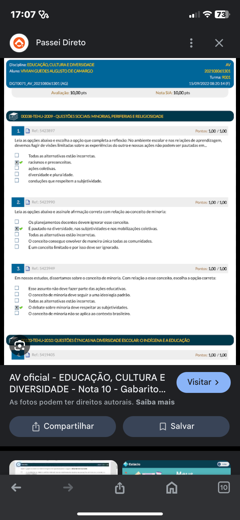 <p>17:07 73 Passei Direto X EDUCAÇÃO, DIVERSIDADE AV Aluno: VIVIAN GUEDES AUGUSTO DE CAMARGO 202108061301 DGT0071_AV_202108061301 (AG) Avaliação: 10,00 pts Nota SIA: 10,00 pts 00038-TEHU-2009 - QUESTÕES SOCIAIS: PERIFERIAS E RELIGIOSIDADE 1 Ref: 5423897 Leia as opções abaixo e escolha a opção que completa a reflexão: No ambiente escolar e nas relações de devemos fugir de visões limitadas sobre as experiências do outro e nossas ações não podem ser pautadas em... Todas as alternativas estão racismos e ações diversidade e conduções que respeitem a 2. 5423990 Pontos Leia as opções abaixo e assinale afirmação correta com relação ao conceito de minoria: Os planejamentos docentes devem ignorar esse conceito. É pautado na nas subjetividades e nas mobilizações Todas as alternativas estão conceito consegue envolver de maneira única todas as comunidades É um conceito limitado e por isso deve ser ignorado. 3. 5423949 Em nossos estudos, dissertamos sobre a conceito de minoria. Com relação a esse escolha a opção correta: Esse assunto não deve fazer parte das ações conceito de minoria deve seguir a uma ideologia Todas as alternativas estão debate sobre minoria deve respeitar as conceito de minoria não se aplica ao contexto brasileiro. QUESTÕES ÉTNICAS NA DIVERSIDADE ESCOLAR: E A EDUCAÇÃO Ref. 5419405 AV oficial - EDUCAÇÃO, CULTURA E Visitar > DIVERSIDADE - Nota 10 - Gabarito... As fotos podem ter direitos autorais. Saiba mais Compartilhar Salvar 10</p>