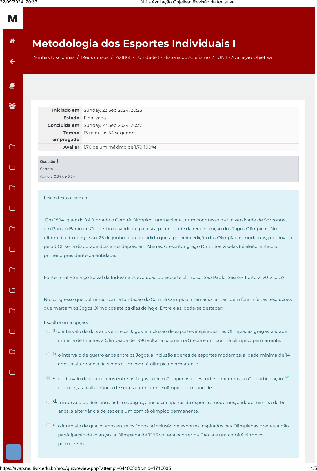 <p>Minhas Disciplinas / Meus cursos / 421861 / Unidade 1 - História do Atletismo / UN 1 - Avaliação Objetiva</p><p>Metodologia dos Esportes Individuais I</p><p>Iniciado em Sunday, 22 Sep 2024, 20:23</p><p>Estado Finalizada</p><p>Concluída em Sunday, 22 Sep 2024, 20:37</p><p>Tempo</p><p>empregado</p><p>13 minutos 54 segundos</p><p>Avaliar 1,70 de um máximo de 1,70(100%)</p><p>Questão 1</p><p>Correto</p><p>Atingiu 0,34 de 0,34</p><p>Leia o texto a seguir:</p><p>"Em 1894, quando foi fundado o Comitê Olímpico Internacional, num congresso na Universidade de Sorbonne,</p><p>em Paris, o Barão de Coubertin reivindicou para si a paternidade da reconstrução dos Jogos Olímpicos. No</p><p>último dia do congresso, 23 de junho, �cou decidido que a primeira edição das Olimpíadas modernas, promovida</p><p>pelo COI, seria disputada dois anos depois, em Atenas. O escritor grego Dimítrios Vikelas foi eleito, então, o</p><p>primeiro presidente da entidade."</p><p>Fonte: SESI – Serviço Social da Indústria. A evolução do esporte olímpico. São Paulo: Sesi-SP Editora, 2012. p. 57.</p><p>No congresso que culminou com a fundação do Comitê Olímpico Internacional, também foram feitas resoluções</p><p>que marcam os Jogos Olímpicos até os dias de hoje. Entre elas, pode-se destacar:</p><p>Escolha uma opção:</p><p>a. o intervalo de dois anos entre os Jogos, a inclusão de esportes inspirados nas Olimpíadas gregas, a idade</p><p>mínima de 14 anos, a Olimpíada de 1996 voltar a ocorrer na Grécia e um comitê olímpico permanente.</p><p>b. o intervalo de quatro anos entre os Jogos, a inclusão apenas de esportes modernos, a idade mínima de 14</p><p>anos, a alternância de sedes e um comitê olímpico permanente.</p><p>c. o intervalo de quatro anos entre os Jogos, a inclusão apenas de esportes modernos, a não participação</p><p>de crianças, a alternância de sedes e um comitê olímpico permanente.</p><p></p><p>d. o intervalo de dois anos entre os Jogos, a inclusão apenas de esportes modernos, a idade mínima de 16</p><p>anos, a alternância de sedes e um comitê olímpico permanente.</p><p>e. o intervalo de quatro anos entre os Jogos, a inclusão de esportes inspirados nas Olimpíadas gregas, a não</p><p>participação de crianças, a Olimpíada de 1996 voltar a ocorrer na Grécia e um comitê olímpico</p><p>permanente.</p><p></p><p></p><p></p><p></p><p></p><p></p><p></p><p></p><p></p><p></p><p></p><p></p><p></p><p></p><p></p><p></p><p>22/09/2024, 20:37 UN 1 - Avaliação Objetiva: Revisão da tentativa</p><p>https://avap.multivix.edu.br/mod/quiz/review.php?attempt=6440632&cmid=1716635 1/5</p><p>https://avap.multivix.edu.br/my/</p><p>https://avap.multivix.edu.br/course/view.php?id=29407</p><p>https://avap.multivix.edu.br/course/view.php?id=29407§ion=2</p><p>https://avap.multivix.edu.br/mod/quiz/view.php?id=1716635</p><p>https://avap.multivix.edu.br/my/</p><p>https://avap.multivix.edu.br/course/view.php?id=29407</p><p>https://avap.multivix.edu.br/user/index.php?id=29407</p><p>https://avap.multivix.edu.br/course/view.php?id=29407§ion=1</p><p>https://avap.multivix.edu.br/course/view.php?id=29407§ion=2</p><p>https://avap.multivix.edu.br/course/view.php?id=29407§ion=3</p><p>https://avap.multivix.edu.br/course/view.php?id=29407§ion=4</p><p>https://avap.multivix.edu.br/course/view.php?id=29407§ion=5</p><p>https://avap.multivix.edu.br/course/view.php?id=29407§ion=6</p><p>https://avap.multivix.edu.br/course/view.php?id=29407§ion=7</p><p>https://avap.multivix.edu.br/course/view.php?id=29407§ion=8</p><p>https://avap.multivix.edu.br/course/view.php?id=29407§ion=9</p><p>https://avap.multivix.edu.br/course/view.php?id=29407§ion=10</p><p>https://avap.multivix.edu.br/course/view.php?id=29407§ion=11</p><p>https://avap.multivix.edu.br/course/view.php?id=29407§ion=12</p><p>https://avap.multivix.edu.br/course/view.php?id=29407§ion=13</p><p>https://avap.multivix.edu.br/</p><p>https://avap.multivix.edu.br/</p><p>https://avap.multivix.edu.br/</p><p>https://avap.multivix.edu.br/</p><p>https://avap.multivix.edu.br/</p><p>https://avap.multivix.edu.br/</p><p>Questão 2</p><p>Correto</p><p>Atingiu 0,34 de 0,34</p><p>Leia o texto a seguir:</p><p>“O santuário de Zeus em Olímpia localiza-se na sub-região de Élis, no noroeste do Peloponeso, no vale dos rios</p><p>Alfeu e Cladeus, na antiga área denominada Pisatis – cercada pela Trifília e Messênia a sul, pela Acaia a norte e</p><p>pela Arcádia a oeste.”</p><p>Fonte: LAKY, L. A. O Santuário de Olímpia, o culto de Zeus Olímpio e os Jogos a partir de uma revisão</p><p>historiográ�ca. Hélade, Niterói, v. 2, n. 1, p. 24-38, 2016.</p><p>Os principais Jogos da Antiguidade aconteciam na cidade de Olímpia em homenagem a Zeus. A última edição</p><p>foi em 393 d.C. Considerando essas informações, qual foi o motivo da interrupção dos jogos?</p><p>Escolha uma opção:</p><p>a. A Grécia foi conquistada pelo Império Romano.</p><p>b. A erupção do Vesúvio causou o empobrecimento da região e o �m da busca atlética.</p><p>c. Zeus se enfureceu com os humanos e ordenou o �m das atividades esportivas.</p><p>d. O início das Guerras Médicas causou o �m do interesse nas atividades esportivas.</p><p>e. O imperador na época ordenou a destruição dos lugares pagãos em nome do Cristianismo. </p><p></p><p></p><p></p><p></p><p></p><p></p><p></p><p></p><p></p><p></p><p></p><p></p><p></p><p></p><p></p><p></p><p>22/09/2024, 20:37 UN 1 - Avaliação Objetiva: Revisão da tentativa</p><p>https://avap.multivix.edu.br/mod/quiz/review.php?attempt=6440632&cmid=1716635 2/5</p><p>https://avap.multivix.edu.br/my/</p><p>https://avap.multivix.edu.br/course/view.php?id=29407</p><p>https://avap.multivix.edu.br/user/index.php?id=29407</p><p>https://avap.multivix.edu.br/course/view.php?id=29407§ion=1</p><p>https://avap.multivix.edu.br/course/view.php?id=29407§ion=2</p><p>https://avap.multivix.edu.br/course/view.php?id=29407§ion=3</p><p>