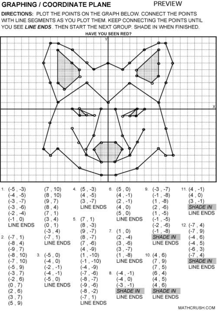 <p>GRAPHING / COORDINATE PLANE PREVIEW DIRECTIONS: PLOT THE POINTS ON THE GRAPH BELOW. CONNECT THE POINTS WITH LINE SEGMENTS AS YOU PLOT THEM. KEEP CONNECTING THE POINTS UNTIL YOU SEE LINE THEN START THE NEXT GROUP. SHADE IN WHEN FINISHED. HAVE YOU SEEN RED? Y 1. -3) (7,10) 4. -3) 6. 0) 9. (-3 -7) 11. (-4 -5) (8,10) (4 -5) (4 -1) (-1 -8) 0) (-3 -7) (9,7) -7) (2 -1) (1,-8) (3 -1) -6) (8,4) LINE ENDS (4 0) (2,-6) SHADE IN (-2 -4) (7,1) 0) (1,-5) LINE ENDS 0) (3,4) 5. (7,1) LINE ENDS (-1 -5) LINE ENDS (0,1) (8,-3) (-2 -6) 12. 4) (-3,4) (9,-7) 7. (1,0) (-1 -8) (-7 9) 2. (-7, 1) (-7, 1) (8,-7) (2 -4) SHADE IN (-4 6) (-8,4) LINE ENDS (7,-6) -6) LINE ENDS (-4, 5) (-9,7) (4 -9) -7) (-6 3) (-8 10) 3. (-5,0) -10) (1 -8) 10. (4,6) (-7 4) (-7,10) (-4,0) (-1 -10) LINE ENDS (7,9) SHADE IN (-5,9) (-2,-1) (-4 -9) 5) LINE ENDS (-3,7) (-4, -1) (-7 -6) 8. -1) 4) (-2,6) (-5 0) (-8 -7) (-4 0) (4,5) (0,7) LINE ENDS (-9 -6) (-3 -1) (4, 6) (2,6) -2) SHADE IN SHADE IN (3,7) 1) LINE ENDS LINE ENDS (5,9) LINE ENDS MATHCRUSH.COM</p><p>7 y (3,7) 6 (-3, 5) 5 4 (2, 4) 3 (4,3) (-6, 2) (-3,3) (-2,2) 2 2) (-6,-1) 1 (6,2) (-2, 0) 0 7 -6 -5 -4 -2 0 1 2 3 4 5 6 7 8 9 -1 (-5,-1) (8 -1) -2 (-4,-2) -3 -3) (-2,-3) -4 -5 -6 (2, -6)</p>