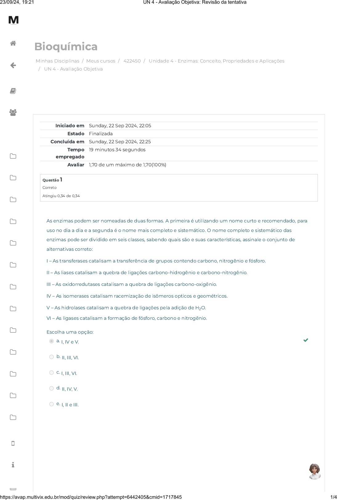 <p>Minhas Disciplinas / Meus cursos / 422450 / Unidade 4 - Enzimas: Conceito, Propriedades e Aplicações</p><p>/ UN 4 - Avaliação Objetiva</p><p>Bioquímica</p><p>Iniciado em Sunday, 22 Sep 2024, 22:05</p><p>Estado Finalizada</p><p>Concluída em Sunday, 22 Sep 2024, 22:25</p><p>Tempo</p><p>empregado</p><p>19 minutos 34 segundos</p><p>Avaliar 1,70 de um máximo de 1,70(100%)</p><p>Questão 1</p><p>Correto</p><p>Atingiu 0,34 de 0,34</p><p>As enzimas podem ser nomeadas de duas formas. A primeira é utilizando um nome curto e recomendado, para</p><p>uso no dia a dia e a segunda é o nome mais completo e sistemático. O nome completo e sistemático das</p><p>enzimas pode ser dividido em seis classes, sabendo quais são e suas características, assinale o conjunto de</p><p>alternativas correto:</p><p>I – As transferases catalisam a transferência de grupos contendo carbono, nitrogênio e fósforo.</p><p>II – As liases catalisam a quebra de ligações carbono-hidrogênio e carbono-nitrogênio.</p><p>III – As oxidorredutases catalisam a quebra de ligações carbono-oxigênio.</p><p>IV – As isomerases catalisam racemização de isômeros opticos e geométricos.</p><p>V – As hidrolases catalisam a quebra de ligações pela adição de H O.</p><p>VI – As ligases catalisam a formação de fósforo, carbono e nitrogênio.</p><p>Escolha uma opção:</p><p>a. I, IV e V. </p><p>b. II, III, VI.</p><p>c. I, III, VI.</p><p>d. II, IV, V.</p><p>e. I, II e III.</p><p>2</p><p></p><p></p><p></p><p></p><p></p><p></p><p></p><p></p><p></p><p></p><p></p><p></p><p></p><p></p><p></p><p></p><p></p><p></p><p></p><p></p><p>23/09/24, 19:21 UN 4 - Avaliação Objetiva: Revisão da tentativa</p><p>https://avap.multivix.edu.br/mod/quiz/review.php?attempt=6442405&cmid=1717845 1/4</p><p>https://avap.multivix.edu.br/my/</p><p>https://avap.multivix.edu.br/course/view.php?id=29469</p><p>https://avap.multivix.edu.br/course/view.php?id=29469§ion=5</p><p>https://avap.multivix.edu.br/mod/quiz/view.php?id=1717845</p><p>https://avap.multivix.edu.br/my/</p><p>https://avap.multivix.edu.br/course/view.php?id=29469</p><p>https://avap.multivix.edu.br/user/index.php?id=29469</p><p>https://avap.multivix.edu.br/course/view.php?id=29469§ion=1</p><p>https://avap.multivix.edu.br/course/view.php?id=29469§ion=2</p><p>https://avap.multivix.edu.br/course/view.php?id=29469§ion=3</p><p>https://avap.multivix.edu.br/course/view.php?id=29469§ion=4</p><p>https://avap.multivix.edu.br/course/view.php?id=29469§ion=5</p><p>https://avap.multivix.edu.br/course/view.php?id=29469§ion=6</p><p>https://avap.multivix.edu.br/course/view.php?id=29469§ion=7</p><p>https://avap.multivix.edu.br/course/view.php?id=29469§ion=8</p><p>https://avap.multivix.edu.br/course/view.php?id=29469§ion=9</p><p>https://avap.multivix.edu.br/course/view.php?id=29469§ion=10</p><p>https://avap.multivix.edu.br/course/view.php?id=29469§ion=11</p><p>https://avap.multivix.edu.br/course/view.php?id=29469§ion=12</p><p>https://avap.multivix.edu.br/course/view.php?id=29469§ion=13</p><p>https://avap.multivix.edu.br/hooks/portal/</p><p>https://avap.multivix.edu.br/mod/page/view.php?id=1252%2F%22%20target%3D%22_blank</p><p>https://avap.multivix.edu.br/calendar/view.php/</p><p>https://avap.multivix.edu.br/</p><p>https://avap.multivix.edu.br/</p><p>https://avap.multivix.edu.br/</p><p>https://avap.multivix.edu.br/</p><p>https://avap.multivix.edu.br/</p><p>Questão 2</p><p>Correto</p><p>Atingiu 0,34 de 0,34</p><p>Questão 3</p><p>Correto</p><p>Atingiu 0,34 de 0,34</p><p>Os agentes farmacêuticos utilizados no tratamento do HIV (Vírus da Imunode�ciência Adquirida) são criados</p><p>para inibir enzimas especí�cas que atuam na replicação do vírus no organismo. Na replicação do vírus, existem</p><p>três enzimas críticas que atuam no processo. Assinale a alternativa que contenha as três.</p><p>Escolha uma opção:</p><p>a. Transcriptase inversa, ligase e protease.</p><p>b. Transcriptase reversa, ligase e protease.</p><p>c. Transcriptase reversa, alanina-aminotransferase e protease.</p><p>d. Transcriptase reversa, integrasse e creatina-cinase.</p><p>e. Transcriptase reversa, integrasse e protease. </p><p>A atividade enzimática é controlada de várias maneiras importantes para garantir que esteja disponível na hora</p><p>certa, no lugar certo e na concentração certa. Alguns fatores físicos e químicos pode alterar a velocidade das</p><p>reações enzimáticas, in�uenciando diretamente o funcionamento das enzimas nas células vivas. Diante do</p><p>exposto, assinale a alternativa que elenca os principais fatores que alteram a velocidade das reações enzimáticas.</p><p>Escolha uma opção:</p><p>a. Osmolaridade, pH e concentração do substrato.</p><p>b. Temperatura, osmolaridade e o tamanho do sítio ativo.</p><p>c. pH, concentração do substrato e tamanho do sítio ativo.</p><p>d. pH, temperatura e osmolaridade.</p><p>e. pH, Temperatura e concentração do substrato. </p><p></p><p></p><p></p><p></p><p></p><p></p><p></p><p></p><p></p><p></p><p></p><p></p><p></p><p></p><p></p><p></p><p></p><p></p><p></p><p></p><p>23/09/24, 19:21 UN 4 - Avaliação Objetiva: Revisão da tentativa</p><p>https://avap.multivix.edu.br/mod/quiz/review.php?attempt=6442405&cmid=1717845 2/4</p><p>https://avap.multivix.edu.br/my/</p><p>https://avap.multivix.edu.br/course/view.php?id=29469</p><p>https://avap.multivix.edu.br/user/index.php?id=29469</p><p>https://avap.multivix.edu.br/course/view.php?id=29469§ion=1</p><p>https://avap.multivix.edu.br/course/view.php?id=29469§ion=2</p><p>https://avap.multivix.edu.br/course/view.php?id=29469§ion=3</p><p>https://avap.multivix.edu.br/course/view.php?id=29469§ion=4</p><p>https://avap.multivix.edu.br/course/view.php?id=29469§ion=5</p><p>https://avap.multivix.edu.br/course/view.php?id=29469§ion=6</p><p>https://avap.multivix.edu.br/course/view.php?id=29469§ion=7</p><p>https://avap.multivix.edu.br/course/view.php?id=29469§ion=8</p><p>https://