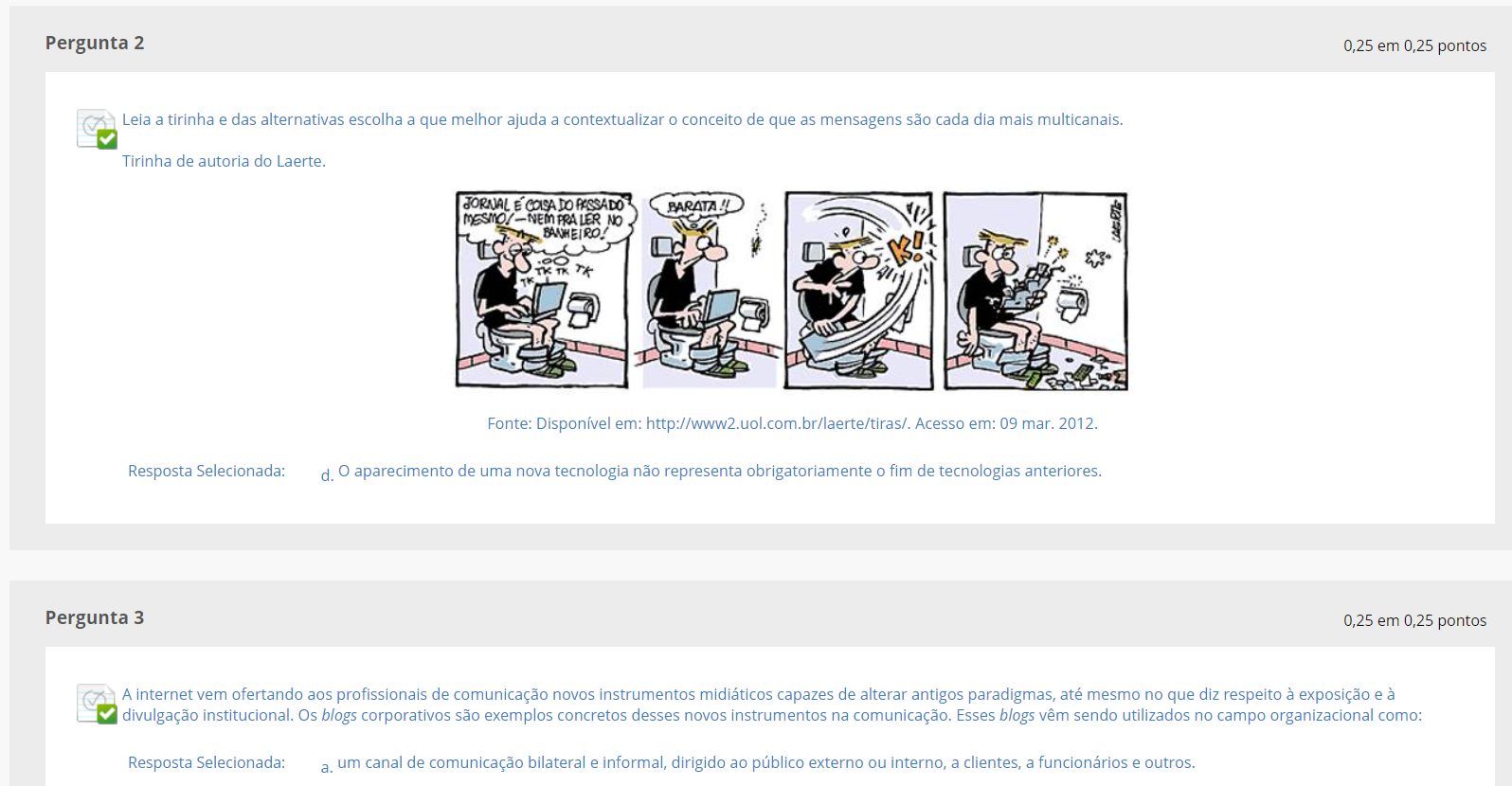 <p>Pergunta 2 0,25 em 0,25 pontos Leia a tirinha e das alternativas escolha a que melhor ajuda a contextualizar conceito de que as mensagens são cada dia mais Tirinha de autoria do JORNAL DO PASSADO BARATA NO Fonte: Disponível em: http://www2.uol.com.br/laerte/tiras/ Acesso em: 09 mar. 2012. Resposta Selecionada: d. aparecimento de uma nova tecnologia não representa obrigatoriamente fim de tecnologias anteriores. Pergunta 3 0,25 em 0,25 pontos A internet vem ofertando aos profissionais de comunicação novos instrumentos midiáticos capazes de alterar antigos paradigmas, até mesmo no que diz respeito à exposição e à divulgação institucional. Os blogs corporativos são exemplos concretos desses novos instrumentos na comunicação. Esses blogs vêm sendo utilizados no campo organizacional como: Resposta Selecionada: a. um canal de comunicação bilateral e informal, dirigido ao público externo ou interno, a clientes, a funcionários e outros.</p>