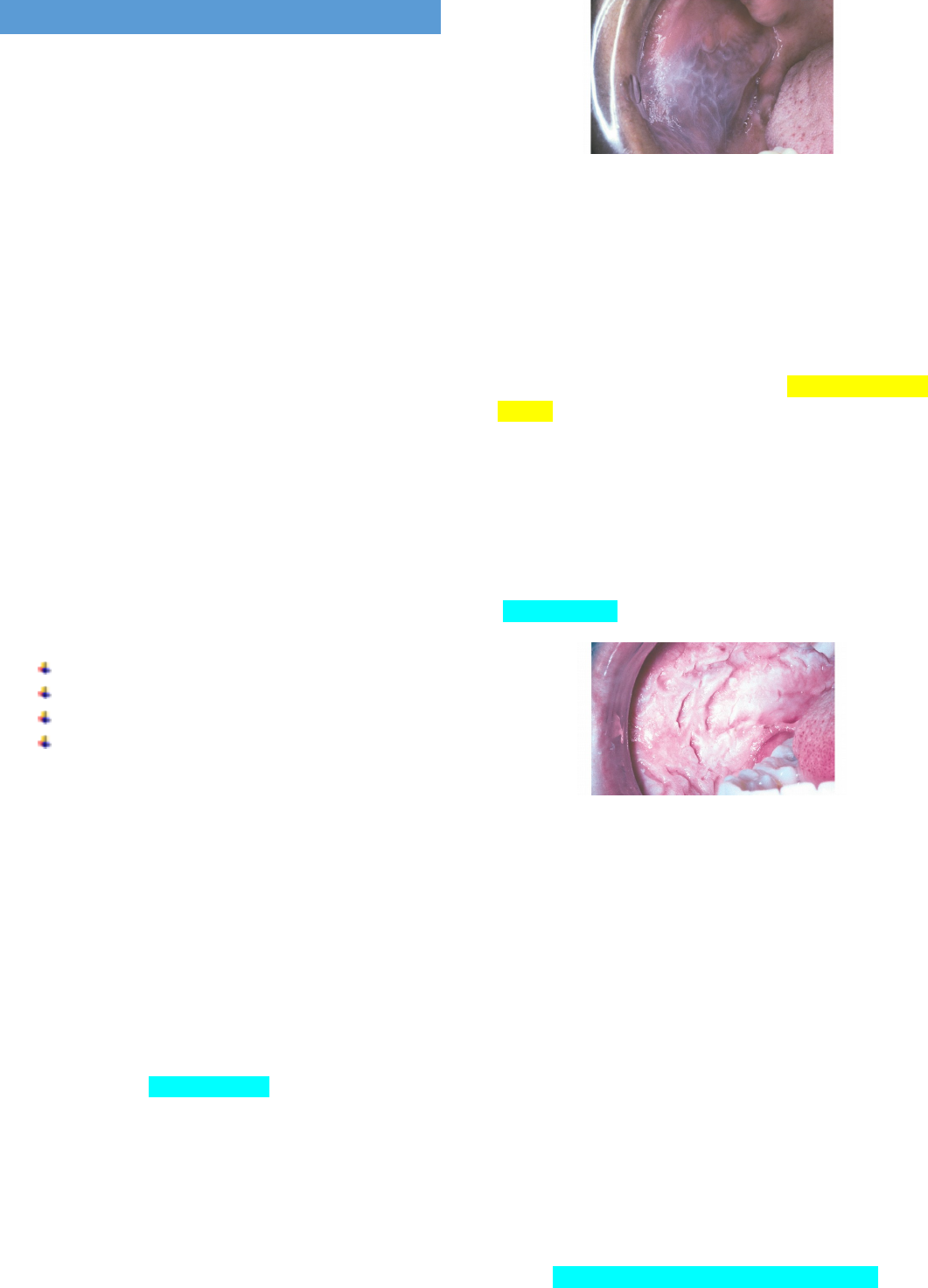 <p>AULA 3: Semiologia das Lesões Brancas</p><p>Apresentam etiologia diversas que estão associadas a um exame clínico criterioso, o qual irá nortear um diagnóstico correto.</p><p>-Determinar as causas da lesão</p><p>-Identificar as manifestações clínicas</p><p>Diagnósticos incorretos levam a tratamentos inapropriados. É por isso que precisamos saber as diferenças de diagnóstico e saber os sinais clínicos.</p><p>-Saber conhecer as colorações da mucosa</p><p>De vermelha a rosa clara. (vascularização, tecidual)</p><p>Manobras semiotécnicas das lesões brancas</p><p>· Inspeção</p><p>· Palpação</p><p>· Raspagem</p><p>· Investigação de agentes traumáticos</p><p>Classificação das lesões brancas</p><p>· Condições hereditárias</p><p>Leucoedema</p><p>Alteração de desenvolvimento encontrado com frequência na população NEGRA. (Contraste da cor da mucosa jugal e das estrias brancas)</p><p>Assintomático e distribuição simétrica.</p><p>Encontrado na mucosa jugal, como uma área esbranquiçada ou leitosa. (branco-azulado)</p><p>-Tratamento: realizar manobra de estiramento. Não se faz necessário nenhum tratamento.</p><p>Nevo branco esponjoso</p><p>Genodermatose rara de traço autossômico dominante.</p><p>Alta penetração e expressão variável.</p><p>Acredita-se que seja resultado de alterações na queratinização das mucosas, podendo estar relacionado com a mutação dos genes queratina 4 e 13.</p><p>-Mais comum em mulheres. Os sintomas se desenvolvem entre a infância e adolescência.</p><p>-Placas brancas de aspecto corrugado e esponjoso, consistência macia, assintomático e geralmente bilateral e simétrico.</p><p>-Mucosa jugal mais acometida bilateralmente.</p><p>-Diagnóstico: exames clínicos e histopatológicos. Avaliar o histórico familiar do paciente. A citopatologia oral tem um alto valor diagnóstico (observar a presença de condensação perinuclear nos queratinócitos alterados)</p><p>-Por ser uma lesão assintomática e benigna, não há tratamento indicado. (somente se o paciente se queixar da estética)</p><p>· Lesões reativas</p><p>Hiperqueratose focal (friccional)</p><p>Lesão branca provocada pelo atrito ou fricção crônica contra uma superfície da cavidade oral.</p><p>-Áreas de mucosa mais propensas a trauma como lábio, mucosa jugal e borda de língua.</p><p>(placa branca seguindo a linha alba, língua crenada)</p><p>-Bruxismo, mordiscada</p><p>-Diagnóstico clínico: confirmação da área exposta ao trauma. Pode realizar biópsia também.</p><p>-Tratamento: acompanhamento do paciente seguida de controle e do habito causador da lesão.</p><p>(aplicação de toxina botulínica nos músculos da mastigação)</p><p>Estomatite Nicotínica</p><p>Lesão encontrada no palato duro de pacientes fumantes (cachimbo e charuto)</p><p>-Homens acima de 45 anos.</p><p>-Pela exposição crônica ao calor do fumo, a queratina se torna muito espessa, com aspecto de “lama seca”.</p><p>Assintomático. A mucosa palatina se tona branca ou cinza difusa com pápulas levemente elevadas com centro vermelho pontilhado.</p><p>-Diagnóstico clínico: anamnese.</p><p>-Tratamento é reversível: com remoção do hábito, a mucosa volta à normalidade (~15 dias).</p><p>Pode estar associado à leucoplasia. (se a lesão branca permanecer, trata-se de uma leucoplasia e deve ser tratada como tal)</p><p>Leucoplasia Pilosa Oral</p><p>Doença causada pelo vírus Epstein-Barr (EBV).</p><p>Manifesta-se clinicamente como uma placa branca não removível à raspagem.</p><p>Localização preferencial: bordas laterais da língua (uni ou bilateral).</p><p>Superfície pode ser plana, corrugada ou pilosa.</p><p>-Diagnóstico: clínico, sorológico, histopatológico e citopatológico.</p><p>-Tratamento: uso local de ácido retinóico ou por cauterização química com ácido tricloacético.</p><p>-CONDIÇÃO OPORTUNISTA!!! – afeta indivíduos imunossuprimidos. (HIV, pacientes transplantados)</p><p>· Lesões branco-amareladas não epiteliais</p><p>Candidíase</p><p>É a infecção micótica mais comum na cavidade oral.</p><p>Causada pelo fungo do gênero Candida.</p><p>-AGUDA: pseudomembranosa e atrófica (atrofia papilar central e queilite angular)</p><p>-CRÔNICA: atrófica (estomatite protética) e hiperplásica</p><p>-MUCOCUTÂNEA: localizada ou associada a síndromes. (“rara”)</p><p>Tratamento: achados clínicos em conjunto com a citopatologia ou cultura.</p><p>Tratamento com antifúngicos locais ou sistêmicos.</p><p>Queimaduras mucosas</p><p>Queimaduras causadas por drogas e agentes: aspirina, peróxido de hidrogênio, nitrato de prata, fenol, materiais endodônticos, necrose anestésica.</p><p>-Clinicamente se observa a presença de área branca dolorida de necrose epitelial no local de deposição do agente causador.</p><p>-Queixa de DOR.</p><p>Essa área pode descamar e deixar uma úlcera avermelhada e sangrante.</p><p>-Tratamento: remoção do agente causador.</p><p>· Outras lesões brancas</p><p>Líquen Plano Oral</p><p>Doença mucocutânea inflamatória crônica.</p><p>Mediada por células T, de causa desconhecida. (doença autoimune)</p><p>-RETICULAR: Rendilhado fino com formação de estrias brancas (estrias de wickham).</p><p>Assintomático. Localização: mucosa jugal, língua, gengiva e lábios.</p><p>-EM PLACA: lesão branca (tipo leucoplasia). Assintomática. Dorso de língua.</p><p>-ATRÓFICA: gengivite descamativa. Pode estar associada à forma reticular ou erosiva. Gengiva.</p><p>-Diagnóstico clínico e exame anatomopatológico.</p><p>-Tratamento tem como objetivo aliviar os sintomas e minimizar o impacto funcional da doença. (não tem cura)</p><p>Higienização oral é importante, principalmente para pacientes com problemas periodontais.</p><p>Corticosteróides: tópico, orobase, bochecho e pomada.</p><p>Imunossupressores tópicos.</p><p>Queilite Actínica</p><p>É uma alteração dos lábios causada pela exposição crônica aos raios 