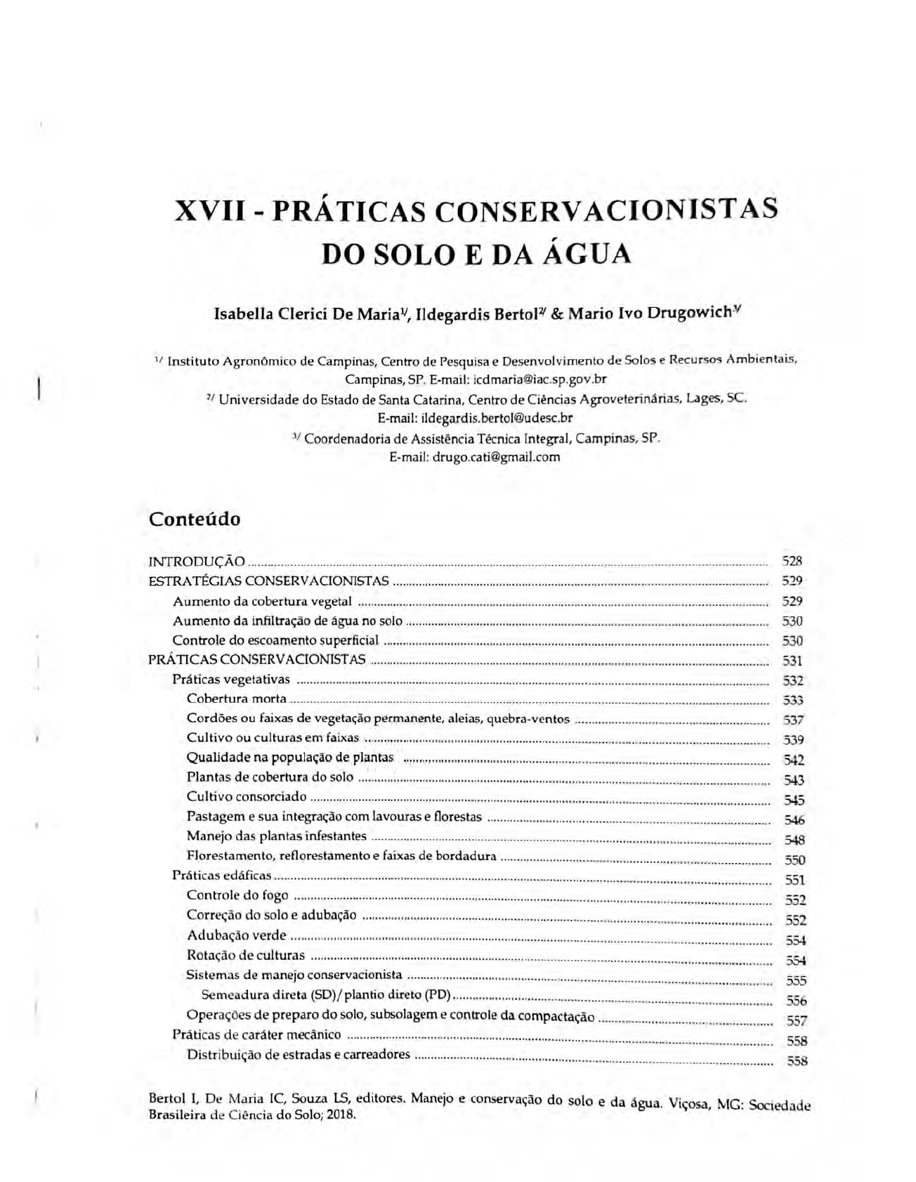 <p>XVII - PRÁTICAS CONSERV ACIONISTAS</p><p>DO SOLO E DA ÁGUA</p><p>Isabella Clerici De Marial/, Ildegardis BertoJ7/ & Mario Ivo Drugowich31</p><p>11 Instituto Agronômico de Campinas, Centro de Pesquisa e Desenvolvimento de Solos e Recursos Ambientais,</p><p>Campinas, SP. E-mail: icdmaria@iac.sp.gov.br</p><p>21 Universidade do Estado de Santa Catarina, Centro de Ciências Agroveterinárias, Lages, SC.</p><p>E-mail: ildegardis.bertol@udesc.br</p><p>31 Coordenadoria de Assistência Técnica Integral, Campinas, SP.</p><p>E-mail: drugo.cati@gmail.com</p><p>Conteúdo</p><p>INfR0DUÇÃ0 ............................................................................................................................................ ·-··-· .. ····....... 528</p><p>ESTRATÉGIAS C0NSERVAO0NISTAS .................... ....................... ....................................................................... 529</p><p>Aumento da cobertura vegetal ................................................................................................... ...................... - .. 529</p><p>Aumento da infiltração de água no solo ............................ ................................................................. ·-·-·····-···· 530</p><p>Controle do escoamento superficial ........ .. ............... .......... ................................................................................. .</p><p>PRÁTICAS C0NSERVACI0NISTAS ........................................................................................................................ .</p><p>Práticas vegetativas ............................................................................................................................................... .</p><p>Cobertura morta .......................................................................... ............................................. .......................... .</p><p>Cordões ou faixas de vegetação permanente, aleias, quebra-ventos ........................................................ ..</p><p>Cultivo ou culturas em faixas ····························· ··· ···························································································</p><p>Qualidade na população de plantas ······ ··························· ······························································-····--·········</p><p>Plantas de cobertura do solo ············· ............................................ ................................................................... .</p><p>Cultivo consorciado ··· ················ ........................................................................................................................ .</p><p>530</p><p>531</p><p>532</p><p>533</p><p>537</p><p>539</p><p>542</p><p>543</p><p>545</p><p>Pastagem e sua integração com lavouras e florestas ..................................................................................... 546</p><p>Manejo das plantas infestantes .................... .............................. ....................................................................... 548</p><p>Florestamento, reflorestamento e faixas de bordadura ............. ....................................................................</p><p>Práticas edáficas ......................................................................................... ..............................................................</p><p>Controle do fogo .......................................... .................................................................................................. ·-···</p><p>Correção do solo e adubação ........................................................................................................................... .</p><p>Adubação verde ...... ... ..... .................................... .. ............................................................................................. .</p><p>Rotação de culturas ................... .................. ........................................................................................................</p><p>Sistemas de manejo conservacionista ............................................................................................................. .</p><p>Semeadura direta (SD)/plantio direto (PD) ........................................................................................ ...... ..</p><p>Operações de preparo do solo, subsolagem e controle da compactação ............................... ·-·········• ....... .</p><p>Práticas de caráter mecânico ......................................................................................................... . , .. -.. ................ .</p><p>Distribuição de estradas e carreadores .. , ........................................................................................................ .</p><p>550</p><p>551</p><p>552</p><p>552</p><p>~</p><p>554</p><p>555</p><p>556</p><p>557</p><p>558</p><p>558</p><p>Berto! I, De Maria IC, Souza LS, editores. Manejo e conservação do solo e da água. Viçosa MG: 5oc· d d</p><p>Brasileira de Ciência do Solo; 2018. ' te ª e</p><p>528</p><p>lSABELLA CLERICI DE MARIA ET AL.</p><p>ulti ,·o em contorno cem, semeadura cm nívL•l ............. ...................... ................... .................. .... ...... .......... .</p><p>· nleiramcnto da fitomassa cultural rl'Sidual L'm ni,·cl ........................... ............ ....................... ..... ............. .</p><p>Terraceamento</p><p>···················································· ····· .. ······················ ·· ·