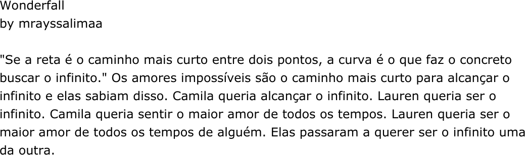 <p>Wonderfall</p><p>by mrayssalimaa</p><p>"Se a reta é o caminho mais curto entre dois pontos, a curva é o que faz o concreto</p><p>buscar o infinito." Os amores impossíveis são o caminho mais curto para alcançar o</p><p>infinito e elas sabiam disso. Camila queria alcançar o infinito. Lauren queria ser o</p><p>infinito. Camila queria sentir o maior amor de todos os tempos. Lauren queria ser o</p><p>maior amor de todos os tempos de alguém. Elas passaram a querer ser o infinito uma</p><p>da outra.</p><p>Infatuated With</p><p>Lauren's Pov</p><p>Wonderfall (n.): alguém sobre quem você se encontra pensando o tempo inteiro.</p><p>Alguém por quem você está completamente apaixonado. Alguém por quem é</p><p>maravilhoso sentir-se caindo.</p><p>O ar quente saía de seus pulmões e tocava meu rosto, acariciando minha pele e ao</p><p>mesmo tempo, corroendo-a, como enxofre. Nossos peitos subiam e desciam</p><p>ritmadamente, quase como uma dança de respirações pesadas. O meu corpo, em</p><p>cima do dela, ainda se contraía em pesados espasmos que contorciam meus</p><p>músculos, fazendo com que os encaixes do meu corpo se apertassem ainda mais</p><p>dentro das curvas do corpo dela. O líquido que escorria entre minhas pernas,</p><p>misturava-se ao dela, denunciando momento de êxtase que sentíamos juntas.</p><p>Abri os olhos para ver suas bochechas rosadas e os cabelos desgrenhados espalhados</p><p>pela cama. Era sempre uma cena adorável e que eu fazia questão de admirar. Meu</p><p>sexo sensível encostou no dela e senti-a pressionar o quadril contra o meu, buscando</p><p>por mais alguns instantes derradeiros de prazer. Em resposta, fiz o mesmo. Ela</p><p>mordeu o lábio inferior, mas cedeu ao cansaço e deixou escapar pesadamente o ar e</p><p>deixando o corpo amolecer no colchão.</p><p>- Pare de me olhar. - Ela disse docemente, ainda de olhos fechados, com a voz</p><p>levemente rouca.</p><p>Não era segredo que ela sempre sabia o que eu estava fazendo ou pensando. Ela</p><p>sempre sabia como ler o meu olhar, meus movimentos, a ausência dos meus</p><p>movimentos, o meu silêncio... E não era segredo também que eu adorava olhá-la. Em</p><p>qualquer circunstância. Eu a olhava o tempo inteiro. Eu não podia parar de olhá-la.</p><p>Eu não conseguia parar de olhá-la. Eu não queria parar.</p><p>- Impossível. - Sussurrei.</p><p>Era impossível. De todas as maneiras conhecidas; havia tanta impossibilidade naquela</p><p>ação que a simples menção daquilo me causava horror. Parar de olhá-la seria como</p><p>parar de comer. O alimento que dava vida à minha existência era ela e eu a ingeria</p><p>através do olhar. Parar de fazer aquilo me mataria gradativamente. Me consumiria de</p><p>tal forma que em algum momento, não existiria mais nada de mim.</p><p>Era tão impossível quanto nós duas ali. Nós duas não estávamos dentro do universo</p><p>das coisas prováveis. Mas ao contrário das impossibilidades que existiam nas</p><p>possibilidades de eu não poder mais olhá-la, lá estávamos nós, vivendo a nossa</p><p>improbabilidade. Lá estávamos nós, sendo impossíveis. "As coisas impossíveis são</p><p>realizáveis através do amor. E é exatamente o que sentimos. Nós somos o</p><p>impossível.", ela me disse certa vez.</p><p>A mulher mais velha, cujo corpo quente se encaixava ao meu, sempre fora admirável</p><p>para mim. Nutria, por ela, tanto encantamento e admiração que, talvez por isso,</p><p>aquela situação atual antes, fosse considerada impossível para mim. Eu nunca</p><p>imaginaria estar com ela, em sua cama, ambas entregues aos prazeres do corpo, da</p><p>carne e da alma. Nunca imaginara que poderia sequer beijá-la, quanto mais possuí-la</p><p>em meu corpo ou me deixar possuir por ela. Mas, sobre uma coisa (além de tantas</p><p>outras) ela estava certa:</p><p>"Nós éramos o impossível".</p><p>Rhinotillexomania</p><p>Rhinotillexomania. (n.): o incontrolável desejo de ser amado.</p><p>A mesa de madeira escura, trabalhada em detalhes milimetricamente desenhados,</p><p>estendia-se à minha frente, imponente. Completando o ambiente ao redor dela,</p><p>móveis renascentistas se espalhavam, dando um ar aristocrático para a sala. E lá</p><p>estava eu, brincando de ser importante, chefe de uma grande empresa, reunida com</p><p>funcionários dos quais eu sempre estava chamando a atenção por não serem</p><p>eficientes. Isso não é uma metáfora ou uma descrição sutil da minha vida. Eu</p><p>realmente estava brincando daquelas coisas. Afinal, aos nove anos de idade não dava</p><p>para, realmente, ser chefe em uma grande empresa.</p><p>Àquela altura, com nove anos de idade, um dos meus passatempos favoritos era</p><p>brincar de ser como o meu pai. Imitava todas as coisas que o via fazer quando se</p><p>reunia em reuniões em casa, com seus funcionários. Talvez por isso, ele esperasse</p><p>que eu fosse seguir a mesma carreira que ele e assumir um cargo de executiva em</p><p>sua exportadora e, posteriormente, o seu cargo. Talvez por isso, o fato de eu ter</p><p>escolhido uma área completamente diferente para seguir carreira, o tenha</p><p>decepcionado tanto.</p><p>Aos dezessete anos, em uma excursão da escola para visitar universidades e termos</p><p>contato com alunos de cursos de graduação, visitamos a Harvard Graduate School of</p><p>Design (HGSD), a escola de Arquitetura e Urbanismo da Universidade de Harvard. Um</p><p>instrutor nos acompanhou pelo campus, nos mostrando as salas e laboratórios que os</p><p>alunos do curso usavam para o seu desenvolvimento durante o curso. Passamos por</p><p>salas habituais, tradicionalmente dispostas com mesa de professores e mesas para</p><p>alunos; seguindo para as posteriores salas de pranchetas, onde havia mesas muito</p><p>maiores, que se elevavam em posição vertical e tinham equipamentos para desenho</p><p>técnico anexadas à elas. Em seguida, seguimos para as salas de maquete, onde à</p><p>primeira