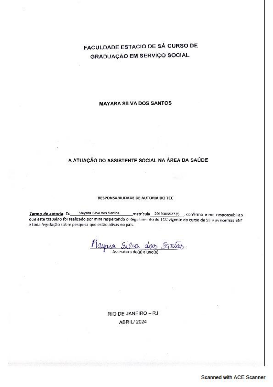 <p>Cidade</p><p>Ano</p><p>MAYARA SILVA DOS SANTOS</p><p>A ATUAÇÃO DO ASSISTENTE SOCIAL NA ÁREA DA SAÚDE</p><p>RIO DE JANEIRO</p><p>2024</p><p>RIO DE JANEIRO</p><p>2024</p><p>A ATUAÇÃO DO ASSISTENTE SOCIAL NA ÁREA DA SAÚDE</p><p>Trabalho de Conclusão de Curso apresentado</p><p>à Estácio de Sa, como requisito parcial para a</p><p>obtenção do título de graduado em Serviço</p><p>Social.</p><p>Orientador: Marcia Ramos</p><p>MAYARA SILVA DOS SANTOS</p><p>A ATUAÇÃO DO ASSISTENTE SOCIAL NA ÁREA DA SAÚDE</p><p>Trabalho de Conclusão de Curso apresentado</p><p>à (Estácio de Sa), como requisito parcial para a</p><p>obtenção do título de graduado em (Serviço</p><p>Social)</p><p>BANCA EXAMINADORA</p><p>Prof(a). Titulação Nome do Professor(a)</p><p>Prof(a). Titulação Nome do Professor(a)</p><p>Prof(a). Titulação Nome do Professor(a)</p><p>Rio de Janeiro , ____ de _________ de ___</p><p>SILVA, Mayara dos Santos. A atuação do assistente social na área da saúde.</p><p>2024. 28 folhas. Trabalho de Conclusão de Curso (Graduação em Serviço Social) –</p><p>Estácio de Sa, Rio de Janeiro, 2024.</p><p>RESUMO</p><p>O presente trabalho tem por finalidade apresentar a atuação do assistente social no</p><p>ambiente hospitalar. A profissão do assistente social é de caráter humanista e social,</p><p>que objetiva em assegurar a integridade moral dos que utilizam os serviços, a</p><p>profissão reconhece os individuos como um sujeito de direitos e de deveres. A</p><p>profissão do assistente social é regulamentada na Lei nº 8.662/93, no qual o</p><p>profissional teve ser graduado devidamente registrado no conselho de classe</p><p>CRESS de sua região assim poderá executar sua profissão em diversas áreas. este</p><p>estudo propõe contribuir de maneira significativa acerta da atuação do assistente</p><p>social no ponto de vista teórico através de uma revisão bibliográfica para que assim</p><p>conhecer esse profissional em sua atuação.</p><p>Palavras-chave: Assistente Social. Código de Ética. Atuação. Serviço Social.</p><p>SILVA, Mayara dos Santos. The role of social workers in the health sector. 2024.</p><p>28 folhas. Trabalho de Conclusão de Curso (Graduação em Serviço Social) –</p><p>Estácio de Sa, Rio de Janeiro, 2024.</p><p>ABSTRACT</p><p>The purpose of this work is to present the role of social workers in the hospital</p><p>environment. The profession of social work is humanistic and social in nature, which</p><p>aims to ensure the moral integrity of those who use services. The profession</p><p>recognizes individuals as subjects of rights and duties. The profession of social</p><p>worker is regulated by Law No. 8,662/93, in which the professional must be a</p><p>graduate duly registered with the CRESS class council in their region so they can</p><p>carry out their profession in different areas. This study proposes to contribute</p><p>significantly to the social worker's performance from a theoretical point of view</p><p>through a bibliographical review so that we can get to know this professional in his</p><p>work.</p><p>Keywords: Social Worker. Code of ethics. Acting. Social service.</p><p>13</p><p>SUMÁRIO</p><p>1. INTRODUÇÃO ................................................................................................... 14</p><p>2. A ATUAÇÃO DO SERVIÇO SOCIA .......... ERRO! INDICADOR NÃO DEFINIDO.</p><p>3. A IMPORTÂNCIA DA ATUAÇÃO DO ASSISTENTE SOCIAL NA SAÚDE......20</p><p>4. O CÓDIGO DE ÉTICA PROFISSIONAL ........................................................... 23</p><p>4. CONSIDERAÇÕES FINAIS ............................................................................... 26</p><p>REFERÊNCIAS ......................................................................................................... 28</p><p>14</p><p>1. INTRODUÇÃO</p><p>O presente estudo tem como tema A atuação do assistente social na área da</p><p>saúde. Com o inchaço populacional nos grandes centros urbanos ocasionado pela</p><p>migração em busca de emprego falta de higiene e segurança no trabalho causou o</p><p>surgimento de doenças e epidemias em decorrência das más condições sanitárias,</p><p>tornando-se necessário controlar e prevenir tais enfermidades que se tornaram uma</p><p>preocupação para sociedade. Diante disso, a saúde da sociedade é colocada em</p><p>pauta, fazendo-se indispensável à intervenção do Estado para solucionar a</p><p>problematização das precárias condições sanitárias, que ocasionava epidemias</p><p>quase incontroláveis. Diante disso, a saúde da sociedade é colocada em pauta,</p><p>fazendo-se indispensável à intervenção do Estado para solucionar a</p><p>problematização das precárias condições sanitárias, que ocasionava epidemias</p><p>quase incontroláveis.</p><p>O objetivo central que orienta esse estudo é realizar uma pesquisa</p><p>bibliográfica sobre a atuação do serviço social na área da saúde. Refletir que o</p><p>serviço social se inseriu profissionalmente com objetivo de amenizar os problemas</p><p>conflituosos entre as classes sociais (empregados e empregadores). Cabe</p><p>mencionar ainda que, a profissão apresenta-se com prática cristalizada no</p><p>assistencialismo, mas com o passar do tempo e diante exigência do mercado de</p><p>trabalho começa a surgirem os questionamentos da formação técnica, metodológica</p><p>e operativa da profissão e posteriormente veio o pensamento de regulamentação do</p><p>Serviço Social como profissão.</p><p>Nessa perspectiva a pesquisa se justifica por tratar-se da atuação do</p><p>assistente social no âmbito hospitalar contribui para a defesa das políticas públicas</p><p>na saúde, garantia dos direitos sociais, fortalecimento do SUS e também para o</p><p>fortalecimento do projeto ético-político do serviço social. O Serviço Social dispõe de</p><p>um amplo campo de atuação, contudo, o assistente social deve te