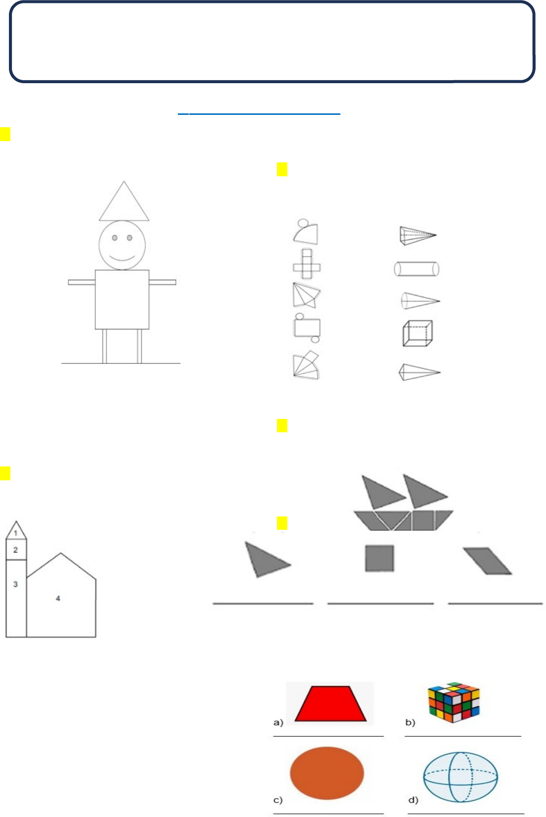 <p>DATA:_________________________________________________________, ______/______/_______</p><p>ESCOLA MUNICIPAL: ________________________________________________________________</p><p>ESTUDANTE:_______________________________________________________________________</p><p>TURMA: ______________________ NOTA:_________</p><p>Avaliação de Matemática</p><p>1) A turma de Juliana construiu um boneco utilizando formas geométricas. As formas geométricas que aparecem no boneco são</p><p>(A) círculo, quadrado, retângulo e triângulo.</p><p>(B) losango, quadrado, círculo e triângulo.</p><p>(C) quadrado, círculo, losango e retângulo.</p><p>(D) retângulo, losango, quadrado e círculo.</p><p>2) Veja esta figura formada por um pentágono, um quadrado, um retângulo e um triângulo.</p><p>Os itens nela numerados correspondem a</p><p>A) (1) triângulo, (2) pentágono, (3) quadrado e (4) retângulo.</p><p>B) (1) triângulo, (2) pentágono, (3) retângulo e (4) quadrado.</p><p>C) (1) triângulo, (2) quadrado, (3) retângulo e (4) pentágono.</p><p>D) (1) triângulo, (2) retângulo, (3) quadrado e (4) pentágono.</p><p>3) Ligue cada planificação na coluna da esquerda com a seu respectivo sólido geométrico na coluna da direita.</p><p>4) Vamos separar as figuras planas nas caixas corretas nomeando-as de acordo com suas características:</p><p>5) Classifique as figuras abaixo em Sólidos geométricos ou figuras planas:</p><p>6) Era uma vez um pirata que vivia nos mares atrás de um tesouro.</p><p>Observe no mapa a localização do baú com o tesouro. O baú está localizado na seguinte posição:</p><p>(A) 6 D (B) 6 C (C) 6 B (D) 6 A</p><p>7) Arme e calcule as adições a baixo:</p><p>A) 709 + 358 =_____ B) 337 + 494 =_______UM</p><p>UM</p><p>C) 307 - 265 =_____ D) 248 - 198 =______</p><p>UM</p><p>UM</p><p>8) Uma Engenho de rapadura produziu 935 rapaduras e recebeu um pedido de 789 rapaduras para vender na festa da rapadura da cidade. Quantas unidades de rapaduras sobraram no engenho após a entrega desse pedido?</p><p>CÁLCULO:</p><p>Reposta:</p><p>9) O interclasse da Escola Santa Cruz teve 450 estudantes assistindo a disputa na arquibancada. Desses estudantes, 289 eram meninos. Quantas meninas estavam na arquibancada assistindo a disputa?</p><p>CÁLCULO:</p><p>Reposta:</p><p>10) Resolva as multiplicações, a seguir:</p><p>4</p><p>image6.jpeg</p><p>image7.png</p><p>image8.png</p><p>image9.wmf</p><p>image10.png</p><p>image1.png</p><p>image2.jpeg</p><p>image3.png</p><p>image4.jpeg</p><p>image5.png</p>