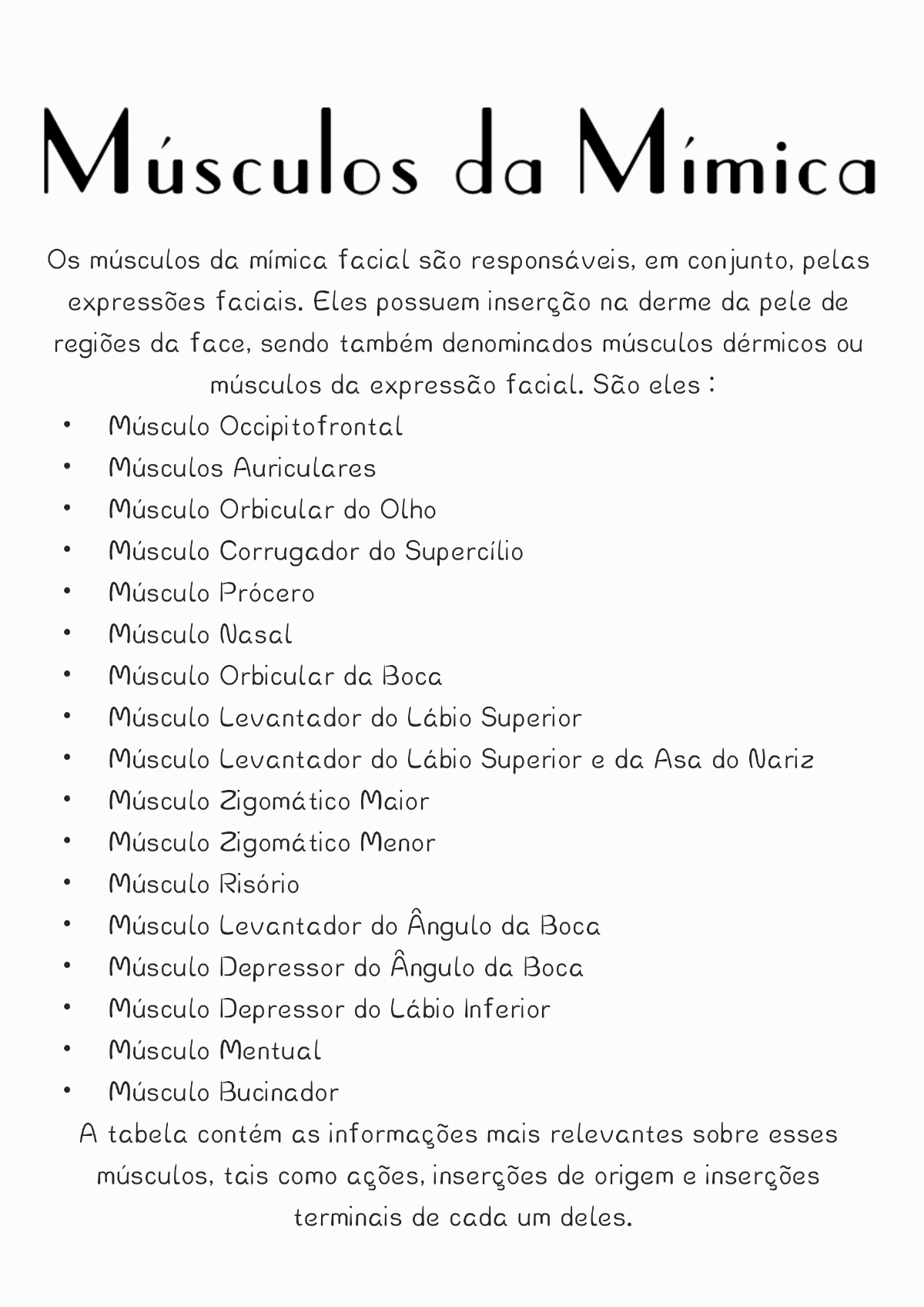<p>Músculos da Mímica Os músculos da mímica facial são responsáveis, em conjunto, pelas expressões faciais. Eles possuem inserção na derme da pele de regiões da face, sendo também denominados músculos dérmicos ou músculos da expressão facial. São eles : Músculo Occipitofrontal Músculos Auriculares Músculo Orbicular do Olho Músculo Corrugador do Supercílio Músculo Prócero Músculo Nasal Músculo Orbicular da Boca Músculo Levantador do Superior Músculo Levantador do Superior e da Asa do Nariz Músculo Zigomático Maior Músculo Zigomático Menor Músculo Risório Músculo Levantador do Ângulo da Boca Músculo Depressor do Ângulo da Boca Músculo Depressor do Inferior Músculo Mentual Músculo Bucinador A tabela contém as informações mais relevantes sobre esses músculos, tais como inserções de origem e inserções terminais de cada um deles.</p><p>Músculos da Inserção de Inserção origem terminal Ventre frontal: Ventre frontal: Eleva a Occipitofrontal Aponeurose sobrancelhas epicraniana Ventre (surpresa, atenção) Ventre occipital: aponeurose occipital: Linha nucal epicraniana (gálea superior aponeurôtica) Auriculares Aponeurose epicraniana e Região auricular Tracionam a orelha processo mastóideo Esfincter do olho, Osso lacrimal e maxila, Orbicular do olho Camadas profundas fechamento da ligamento palpebral media da pele pálpebra Corrugador do Processo frontal da Na pele das Abaixa a parte supercílio Maxila sombrancelhas medial das sobrancelhas e as aproxima da linha mediana (raiva e Osso do nariz e Na pele entre as Abaixa a pele Prócero cartilagens nasais sombrancelhas entre as sombrancelhas, formando uma prega transversal na base do nariz. Eminência alveolar do Aponeurose no dorso Dilatam ou Nasal canino nasal estreitam as narinas Orbicular da Fibras periféricas Fechamento da rima boca eminências alveolares da Ângulo da boca da boca produz uma maxila e eversão dos Músculo Levanta o levantador do Margem inferior da órbita Pele do superior superior (repugnância, superior riso franco)</p><p>Músculos da Inserção de Inserção Ação origem terminal Levantador do Processo frontal da Pele do e eversão labio superior e maxila superior do labio superior e da asa do nariz dilatação da narina Zigomático Ângulo da boca e Puxa para cima e Osso zigomático na pele lateral do para a lateral o maior labio superior da boca (riso e alegria) Zigomático Osso zigomático e na Ângulo da boca e Traciona supero- menor pele da bochecha superior lateralmente o superior Fáscia masseterica Pele do da Move lateralmente Risório boca o da boca. Auxilia o sorriso Levantador Fossa canina Músculo orbicular Acentua o sulco do da dos lábios naso- labial, o boca canino descoberto Depressor do Ângulo da boca Puxa infero- Linha obliqua da lateralmente o boca da boca Depressor do Linha obliqua Labio inferior Depressor do labio inferior inferior Eminência alveolar do Eversão do labio Mentual Pele do mento incisivo lateral inferior desprezo, bico) Processo alveolar da maxila Bucinador Ângulo da boca e na Comprime o conteúdo e dos molares, na fossa retromolar, e face profunda da da cavidade da boca, posteriormente no ligamento pele e na mucosa ato de assobiar e pterigomandibular soprar</p><p>Músculos da mímica m.prócero m.occipito frontal m.nasal m.corrugador do m.levantador do supercílio lábio superior e m.orbicular do olho da asa donariz m.levantador do m.levantador do lábio superior ângulo da boca m.orbicular da boca m.zigomático menor m.bucinador m.zigomático maior m.mentual m.zigomático risório m.plastina do ângulo da boca do lábio inferior</p>