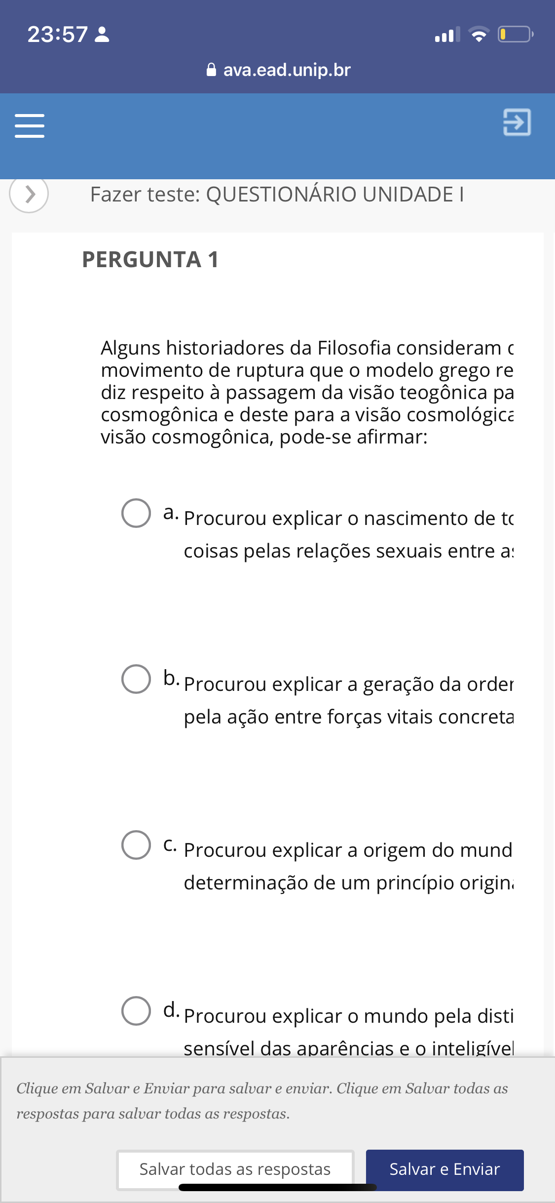 <p>23:57 ava.ead.unip.br Fazer teste: QUESTIONÁRIO UNIDADE PERGUNTA 1 Alguns historiadores da Filosofia consideram movimento de ruptura que o modelo grego re diz respeito à passagem da visão teogônica pa cosmogônica e deste para a visão cosmológica visão cosmogônica, pode-se afirmar: a. Procurou explicar o nascimento de to coisas pelas relações sexuais entre as b. Procurou explicar a geração da order pela ação entre forças vitais concreta C. Procurou explicar a origem do mund determinação de um princípio origin d. Procurou explicar o mundo pela disti sensível das aparências e o inteligível Clique em Salvar e Enviar para salvar e enviar. Clique em Salvar todas as respostas para salvar todas as respostas. Salvar todas as respostas Salvar e Enviar</p>
